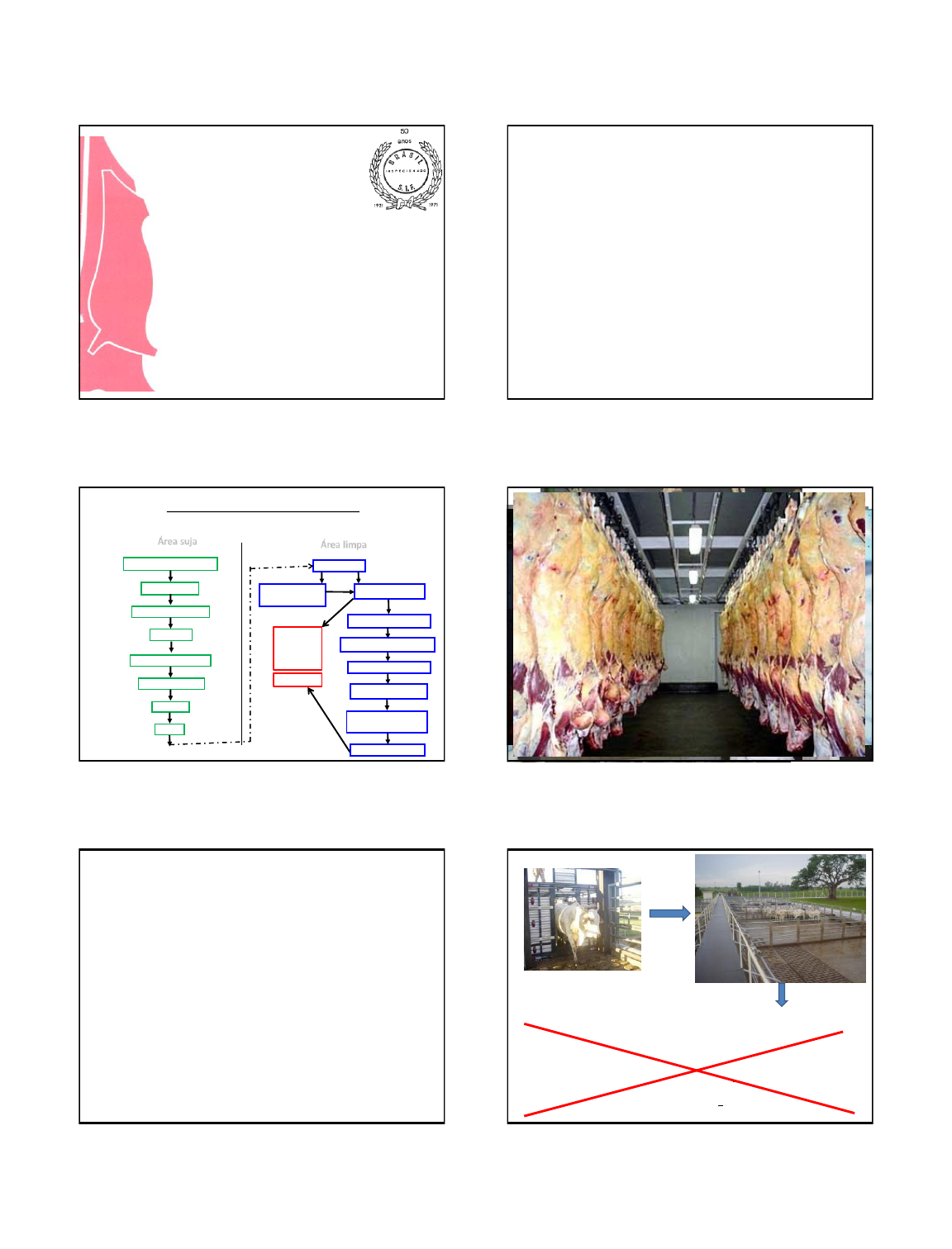 INSPEÇÃO DE CARNES Padronização de Técnicas, Instalações e Equipamentos I – Bovinos: Currais e seus Anexos - Sala de Matança 1971, DIPOA / DICAR (Div. de Inspeção de Carnes e Derivados), Ministério da Agricultura, Brasil Profª Drª Juliana Pampana Nicolau AGENDA • Fluxograma do abate de bovinos; • III – Inspeção “ante mortem”, matança de emergência e necropsia; • I – Instalações e equipamentos relacionados com a técnica da inspeção “ante mortem” e “post mortem”; • II – Higiene do ambiente da inspeção “ante mortem” e “post mortem”; • M.R.E. • D.I.F. • Desossa, Miúdos, Triparias, Bucharias, e Graxaria Esfola Evisceração Serragem de carcaças Toalete de carcaças Pesagem de carcaças Inspeção Sanitária Lavagem de carcaças Resfriamento de carcaças Transporte de animais Currais Banho de aspersão Box de atordoamento Praia de vômito Sangria Fluxograma do abate de bovinos Área suja Área limpa Seringa Reinspeção de carcaças Miúdos, Bucharia, Triparia e Graxaria Graxaria Desossa Esfola Evisceração Serragem de carcaças Toalete de carcaças Pesagem de carcaças Inspeção Sanitária Lavagem de carcaças Resfriamento de carcaças Transporte de animais Currais Banho de aspersão Box de atordoamento Praia de vômito Sangria Fluxograma do abate de bovinos Área suja Área limpa Seringa Reinspeção de carcaças Miúdos, Bucharia, Triparia e Graxaria Graxaria Desossa • Importante: esse Regulamento ainda cita muito o antigo RIISPOA, mas o novo RIISPOA não contempla muita coisa que é detalhada neste Regulamento. Portanto, ainda parece que precisaremos aguardar um pouco para saber o que seguir exatamente (as chamadas “normas complementares”). • Isto também acontece com os abates de suínos e de aves. Todas as Portarias ainda remetem ao antigo RIISPOA. Art. 110:- Proíbe matança de qualquer animal que não tenha permanecido pelo menos 24 horas em descanso, jejum e dieta hídrica nos depósitos do estabelecimento. § 1º - reduzido quando o tempo de viagem < 2 horas e os animais procedam de campos próximos, mercados ou feiras, sob controle sanitário permanente. Porém, deve ser > 6 horas. Descanso, jejum e dieta hídrica! No novo RIISPOA: • CAPÍTULO I - DA INSPEÇÃO INDUSTRIAL E SANITÁRIA DE CARNES E DERIVADOS, Seção II - Do abate dos animais: – Art. 103. É proibido o abate de animais que não tenham permanecido em descanso, jejum e dieta hídrica, respeitadas as particularidades de cada espécie e as situações emergenciais que comprometem o bem-estar animal. • Parágrafo único. O MAPA estabelecerá parâmetros referentes ao descanso, ao jejum e à dieta hídrica dos animais em normas complementares. INSPEÇÃO DE CARNES (1971) • I – Instalações e equipamentos relacionados com a técnica da inspeção “ante mortem” e “post mortem”. • II – Higiene do ambiente da inspeção “ante mortem” e “post mortem”. • III – Inspeção “ante mortem”, matança de emergência e necropsia. • IV – Inspeção “post mortem”. • V – Esquema de trabalho das IIFF nos dias de abate. III – Inspeção “ante mortem”, matança de emergência e necropsia • Inspeção ante mortem: exclusivamente por veterinário. Feita quando o gado já chegou e, no dia seguinte, meia hora antes do abate. – Papeleta com a discriminação dos lotes (fornecida pela empresa). – Observar, com acuidade, o comportamento dos animais. – Suspeita de qualquer enfermidade ou afecção (doenças infecciosas, parasitárias ou inespecíficas) apartar os animais suspeitos no Curral de Observação exame no brete (obrigatório neste local) retenção, tratamento ou abate de emergência DIF destino da carcaça. • Matança de Emergência: para animais impossibilitados de atingir a Sala de Matança por seus próprios meios e/ou animais que foram retidos no Curral de Observação, após o exame geral. • Matança de Emergência Imediata: animais incapacitados de locomoção, acidentados, contundidos, com ou sem fratura, sem alteração de temperatura ou outros sintomas que os excluam do abate comum. • Matança de Emergência Mediata: animais verificados doentes após o exame clínico. • Proceder o abate após o abate normal. Se hipo ou hipertermia condenar os animais liminarmente, podendo ser abatido no Depto. de Necropsia ou na Sala de Matança, conforme o diagnóstico do veterinário. Também: bovinos acompanhados de certificados de tuberculinização ou de soro-aglutinação brucélica positivas, expedidos pela Defesa Sanitária Animal ou veterinários credenciados. • Necropsia: – Realizada pelo veterinário nos animais que chegam mortos ou que morreram nas dependências do estabelecimento ou sacrificados devido a doenças infectocontagiosas. – Se o animal chegou em fase de putrefação: necropsia dispensada e o cadáver encaminhado direto para o forno crematório ou autoclave especial. – Realizada obrigatoriamente no Departamento de Necropsia. – 2 destinos: • Graxaria: para subprodutos não-comestíveis; • Forno crematório ou autoclave especial: suspeita ou positivo em relação a doenças infectocontagiosas. Coletar material para exames laboratoriais. • Currais: – Afastados, pelo menos, 80 metros das dependências onde se elaboram alimentos e isolados dos varais de charque por edificações. I – Instalações e equipamentos relacionados com a técnica da inspeção “ante mortem” e “post mortem” Varais de charqueCurrais • Currais de chegada e seleção: – Recebimento e apartação do gado; – Área nunca inferior a dos currais de matança; – Iluminação adequada (5 watts/m2); – Pavimentação, com desaguamento apropriado, declive de 2%, no mínimo, superfície plana, antiderrapante, íntegra. Canaletas de desaguamento na parte mais baixa do declive, evitando-se ralos centrais. Material de fácil higienização (aprovado pelo DIPOA). • Plataformas elevadas 