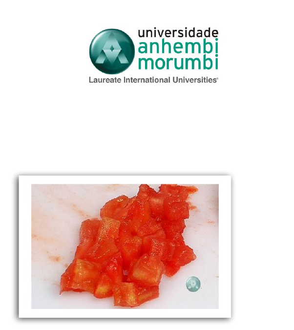 Curso Superior de Tecnologia ON LINE EM GASTRONOMIA Habilidades Básicas de Cozinha Tomate concassé Ingredientes - Tomate débora: 02 Unidades Modo de preparo 1. Faça a mise en place: separe todos os ingredientes pedidos na receita. 2. Molhe um pano, coloque sob uma tábua. 3. Introduza a faca de legumes na base, retirando o olhinho do tomate. 4. Do outro lado, faça um corte em cruz na superfície do tomate. 5. Coloque o tomate dentro da água fervente e cozinhar por cerca de 30 segundos. 6. Retirar os tomates e dar choque térmico em banho de água e gelo. 7. Retirar os tomates da água e gelo e, com a ajuda da faca de legumes, retirar a pele do tomate. 8. Corte o tomate ao meio e cada metade ao meio novamente. 9. Introduza a faca retirando o miolo e a semente. 10. Despreze o miolo e a semente. 11. Vire a pétala do tomate para baixo e faça o corte nos dois sentidos. 12. Corte no sentido oposto.