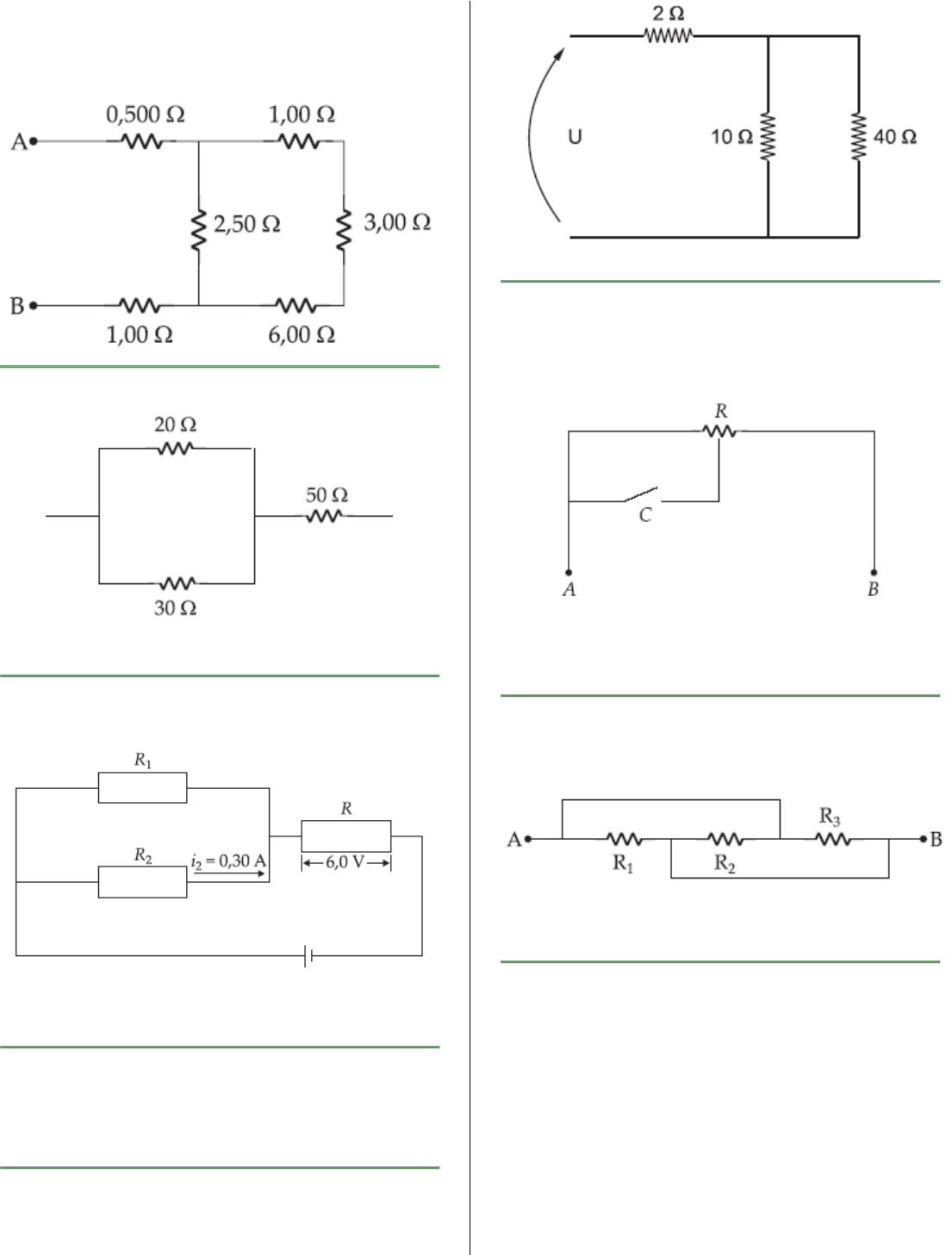 Lista de Exercícios - Associação mista de resistores 01. (F.M. Itajubá-MG) Abaixo temos esquematizada uma associação de resistências. Qual é o valor da resistência equivalente entre os pontos A e B? 02. (Fei-SP) Qual a resistência equivalente da associação a seguir? a) 80 b) 100 c) 90 d) 62 e) 84 03. (UEL-PR) No circuito representado no esquema a seguir, a resistência de R2 é igual ao triplo da resistência R1. O valor do resistor R, em ohms, é igual a: a) 20 b) 10 c) 5,0 d) 3,6 e) 1,8 04. (Unisa-SP) Cinco resistores de 200 cada são ligados, formando um quadrado com uma diagonal. Qual a resistência equivalente entre dois vértices, não adjacentes, ligados por um resistor? 05. (Mackenzie-SP) No trecho de circuito representado a seguir, a potência dissipada pelo resistor de 40 é 10W. A intensidade de corrente elétrica que passa pelo resistor de 2 é: a) 2,5 A b) 2,0 A c) 1,5 A d) 1,0 A e) 0,5 A 06. (Fuvest-SP) A figura representa, esquematicamente, as ligações de um chuveiro elétrico. R é a resistência e C uma chave que, quando ligada, coloca em curto- circuito um segmento de resistência. Entre os terminais A e B está aplicada uma tensão de 220 V. a) Com a chave C aberta, dissipa-se uma potência de 2,2 kW na resistência. Qual o valor de R? b) Qual deve ser a posição da chave C no inverno? Por quê? 07. (ITA-SP) Determine a intensidade da corrente que atravessa o resistor R2 da figura quando a tensão entre os pontos A e B for igual a V e as resistências R1; R2 e R3 forem iguais a R a) V/R b) V/3R c) 3V/R d) 2V/3R e) nenhuma das anteriores 08. (UEL-PR) O valor de cada resistor, no circuito representado no esquema a seguir, é 10 ohms. A resistência equivalente entre os terminais X e Y, em ohms, é igual a: a) 10 b) 15 c) 30 d) 40 e) 90 09. (Unip-SP) Entre os pontos A e B, é aplicada uma diferença de potencial de 30 V. A intensidade da corrente elétrica no resistor de 10 é: a) 1,0 A b) 1,5 A c) 2,0 A d) 2,5 A e) 3,0 A 10. (PUCCamp-SP) A figura abaixo representa o trecho AB de um circuito elétrico, onde a diferença de potencial entre os pontos A e B é de 30 V. A resistência equivalente desse trecho e as correntes nos ramos i1 e i2 são, respectivamente: a) 5 ; 9,0 A e 6,0 A b) 12 ; 1,0 A e 1,5 A c) 20 ; 1,0 A e 1,5 A d) 50 ; 1,5 A e 1,0 A e) 600 ; 9,0 A e 6,0 A 11. (Mackenzie-SP) Três lâmpadas, L1, L2 e L3, identificadas, respectivamente, pela inscrições (2 W - 12 V), (4 W - 12 V) e (6 W - 12 V), foram associadas conforme mostra o trecho de circuito a seguir. Entre os terminais A e B aplica-se a ddp de 12 V. A intensidade de corrente elétrica que passa pela lâmpada L3 é: a) 2,5∙10-1 A b) 3,3∙10-1 A c) 1,0 A d) 1,6 A e) 2,0 A 12. (Cesgranrio-RJ) No circuito esquematizado, i1, i2 e i3 referem-se às correntes elétricas que percorrem, respectivamente, os resistores R1, R2 e R3. São representadas por u1, u2 e u3 as correspondentes quedas de potencial nesses mesmos resistores. Quaisquer que sejam os valores de R1, R2 e R3 é sempre verdadeiro que: a) u1 + u2 + u3 = (i1 + i2 + i3) (R1 + R2 + R3) b) u1 = u2 + u3 c) u2 = u3 d) i3 = i1 e) u1 = (i2 + i3) (R2 + R3) 13. (Fuvest-SP) Considere um circuito formado por 4 resistores iguais, interligados por fios perfeitamente condutores. Cada resistor tem resistência R e ocupa uma das arestas de um cubo, como mostra a figura a seguir. Aplicando entre os pontos A e B uma diferença de potencial V, a corrente que circulará entre A e B valerá: a) 4V/R b) 2V/R c) V/R d) V/2R e) V/4R 14. (Fuvest-SP) Dispondo de pedaços de fios e 3 resistores de mesma resistência, foram montadas as conexões apresentadas abaixo. Dentre essas, aquela que apresenta a maior resistência elétrica entre seus terminais é: a) b) c) d) e) 15. (Vunesp-SP) Dentro de uma caixa com terminais A e B, existe uma associação de resistores. A corrente que atravessa a caixa em função da tensão aplicada nos terminais A e B é dada pela tabela. V(V) I(A) 3 1 6 2 9 3 12 4 A caixa poderia conter: a) b) c) d) e) 16. (Mackenzie-SP) Entre os pontos A e B do trecho do circuito elétrico abaixo, a ddp é 80 V. A potência dissipada pelo resistor de resistência 4 é: a) 4 W b) 12 W c) 18 W d) 27 W e) 36 W Gabarito: 01: 3,50 02: letra d 03: letra c 04: 100 05: letra a 06: a) R = 22 b) a chave deve ficar fechada reduzindo o tamanho da resistência. 07: letra a 08: letra b 09: letra a 10: letra b 11: letra a 12: letra c 13: letra a 14: letra c 15: letra c 16: letra e