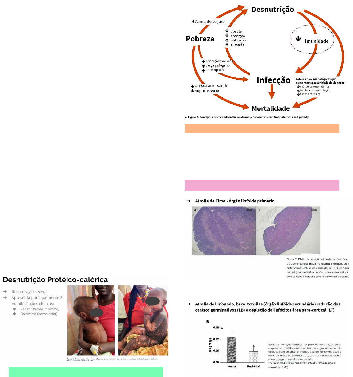Desnutrição e sistema imune ➜ O sistema imunológico envolve os mecanismos pelos quais um organismo se defende de patógenos e compreende a imunidade natural e a adquirida. · A imunidade natural constitui a primeira linha de defesa do organismo e é uma resposta rápida que envolve barreiras físicas como a pele e substâncias como o muco, que atuam dificultando a invasão do organismo por agentes patogênicos. · A imunidade adquirida, que demora alguns dias para se estabelecer, detecta e destrói microrganismos por meio da ação seletiva dos linfócitos e da produção de anticorpos específicos. ➜ A desnutrição pode ter efeitos adversos no organismo de um indivíduo, incluindo consequências negativas aos mecanismos gerais de defesa. O organismo desnutrido se torna mais suscetível a enfermidades, ocorrendo uma inter-relação entre desnutrição, sistema imune e doenças infecciosas. ➜ Desequilíbrios nutricionais afetam a capacidade do hospedeiro produzir resposta inflamatória protetora. *Alterações metabólicas e clínicas da imunidade podem estar relacionadas à deficiência de um único ou múltiplos nutrientes ➜ A imunidade depende da replicação celular e da síntese protéica, por essa razão é diretamente afetada pelo estado nutricional, que determina a habilidade metabólica celular e a eficiência com que a célula reage aos estímulos, dando início e continuidade às respostas imunes. Desnutrição infantil ➜ Aumenta o risco de morte por doença infecciosa ➜ Estima-se que 45% das mortes das crianças menores de 5 anos seja causada pela desnutrição. ➜ Quem surge primeiro? A desnutrição ou a infecção? · Patógenos oportunistas (Cryptosporidium e leveduras) são causas frequentes de diarreia em crianças desnutridas. Critérios para Desnutrição: · Baixo peso/idade · Baixa estatura/idade · Baixo peso/estatura · Circunferência do braço Desnutrição e o Sistema Imune Alteração nas Barreiras: · ↓ produção ácido gástrico · ↑ permeabilidade intestinal · ↓ lisozimas · ↓ IgA secretória (saliva e lágrima) · alteração da microbiota - presença de mais microrganismos patogênicos e mais bactérias gram – **O sistema complemento é um mecanismo efetor da imunidade humoral, tanto inata como adquirida, composto por 20 proteínas solúveis no plasma e 10 proteinas de membrana, apresenta importante função na opsonização, fagocitose, quimiotaxia e morte intracelular programada (apoptose) Como o sistema inato reconhecem os microrganismos? ➜ O sistema imune inato reconhece as estruturas que são compartilhadas por várias classes de microrganismos e que não estão presentes nas células normais do hospedeiro. ➜ Padrões moleculares associados a patógenos (PAMP): LPS, receptores para peptidoglicano, resíduos de manose, RNA dupla fita, nucleotídeos (CpG) ricos em CG não metilados. ➜ Receptores que reconhecem essas estruturas são os receptores de reconhecimento de padrões - PRR. ➜ Também reconhece moléculas liberadas das células danificadas ou necróticas: Padrões moleculares associados a danos (DAMP) ➜ Reconhecem estruturas essenciais para a sobrevivência e capacidade de infecção dos microrganismos. Microrganismos não conseguem evadir imunidade inata através de mutação ou não expressão dos alvos. Desnutrição e a vacinação infantil ➜ Apesar das infecções recorrentes nas crianças, poucas ou nenhuma diferença foi observada nas respostas imunes às vacinas. · Quantidade reduzida de anticorpos específicos; · Alteração na resposta das células T (vacina BCG) · Células de memória TCD8+ com vida mais curtas ➜ Porque não há alteração? · Vacinas tem adjuvantes - estimulam a resposta imune · Infecções são influenciadas pela barreira disruptiva e prejuízo na resposta imune.