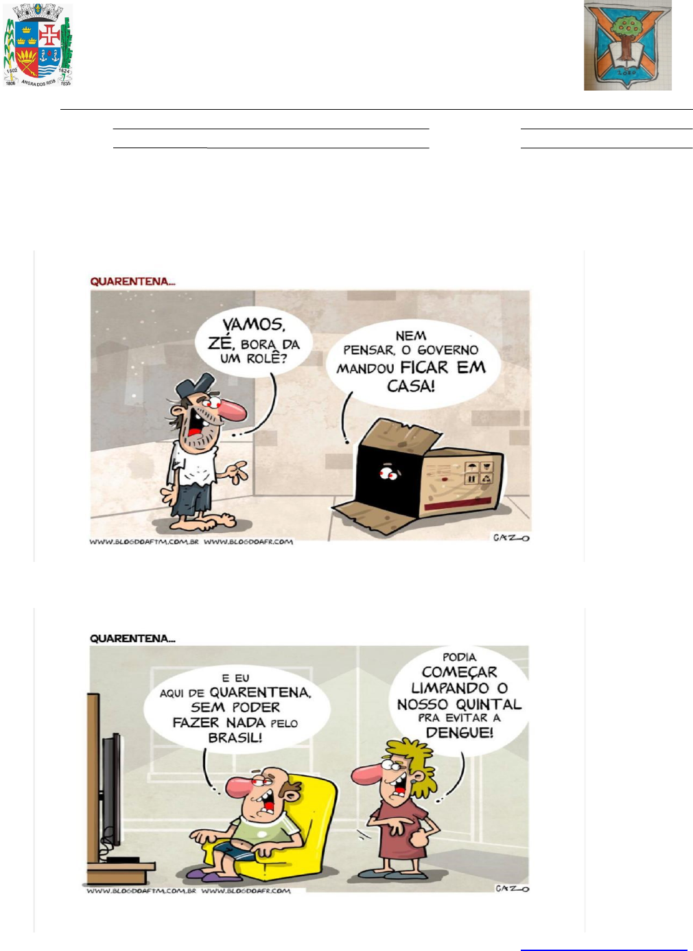 MUNICÍPIO DE ANGRA DOS REIS SECRETARIA DE EDUCAÇÃO E. M. JULIO CESAR DE ALMEIDA LARANGEIRA Nome: Professor(a): Carolina Olivieri Turno: Disciplina(s): Língua Portuguesa Turma(s): Ano de escolaridade: (X ) 6ºano ( ) 7ºano ( ) 8ºano ( ) 9ºano Após a leitura dos textos, respondas as questões A, B e C. Texto I (in www.blogdoafim.com.br) Texto II (in www.blogdoafim.com.br) Texto III (in m.facebook.com/tirasarmandinho/?locale2=PT_BR) A) Qual a semelhança entre os três textos selecionados? _____________________________________________________________________________________ _____________________________________________________________________________________ _____________________________________________________________________________________