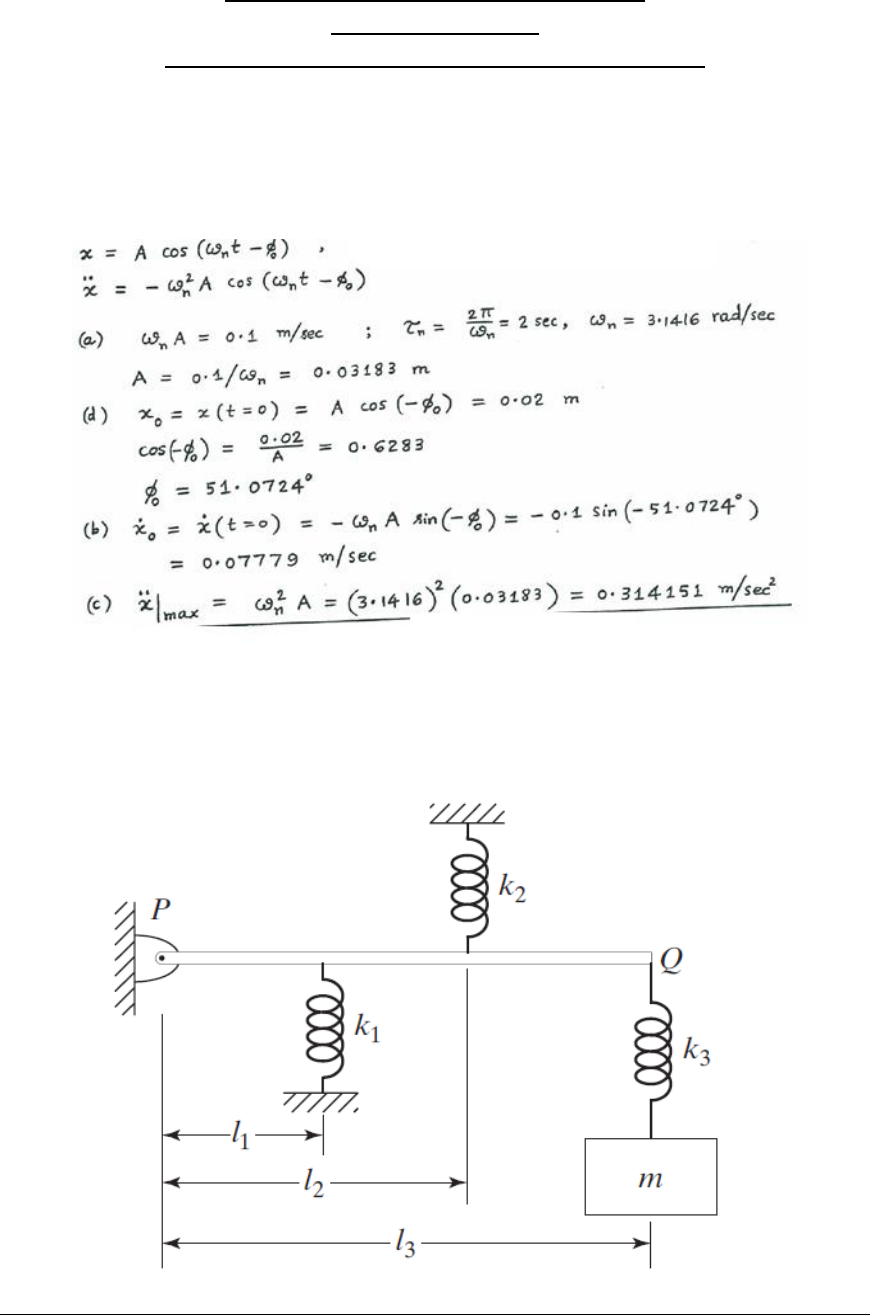 Dr./ Ahmed Nagib Elmekawy 1 of 13 EME 304- Sheet 1 Solution EME 304– Mechanical Vibrations Sheet 1 Solution Free Undamped Single Degree of Freedom 1. The maximum velocity attained by the mass of a simple harmonic oscillator is 10 cm/s, and the period of oscillation is 2 s. If the mass is released with an initial displacement of 2 cm, find (a) the amplitude, (b) the initial velocity, (c) the maximum acceleration, and (d) the phase angle. 2. Three springs and a mass are attached to a rigid, weightless bar PQ as shown in Fig.1. Find the natural frequency of vibration of the system. Fig.1. Dr./ Ahmed Nagib Elmekawy 2 of 13 EME 304- Sheet 1 Solution 3. An automobile having a mass of 2,000 kg deflects its suspension springs 0.02 m under static conditions. Determine the natural frequency of the automobile in the vertical direction by assuming damping to be negligible. 4. Find the natural frequency of vibration of a spring-mass system arranged on an inclined plane, as shown in Fig. 2. Fig.2. Dr./ Ahmed Nagib Elmekawy 3 of 13 EME 304- Sheet 1 Solution 5. Figure 3 shows a steel traffic sign, of thickness 1/8 in, fixed to a steel post. The post is 72 in. high with a cross section 2 in. * 1/4 in and it can undergo torsional vibration (about the z-axis) or bending vibration (either in the zx-plane or the yz plane). Determine the mode of vibration of the post in a storm during which the wind velocity has a frequency component of 1.25 Hz. Hints: 1. Neglect the weight of the post in finding the natural frequencies of vibration. 2. Torsional stiffness of a shaft with a rectangular section (see Fig. 2.78(b)) is given by Fig.3. Dr./ Ahmed Nagib Elmekawy 4 of 13 EME 304- Sheet 1 Solution Dr./ Ahmed Nagib Elmekawy 5 of 13 EME 304- Sheet 1 Solution Dr./ Ahmed Nagib Elmekawy 6 of 13 EME 304- Sheet 1 Solution 6. Draw the free-body diagram and derive the equation of motion using Newton’s second law of motion for each of the systems shown in Figs. 4 and 5. Fig. 4. Fig. 5. Dr./ Ahmed Nagib Elmekawy 7 of 13 EME 304- Sheet 1 Solution Dr./ Ahmed Nagib Elmekawy 8 of 13 EME 304- Sheet 1 Solution 7. Determine the displacement x velocity ẋ and acceleration ẍ of a spring-mass system with 𝜔n= 10 rad/s for the initial conditions xo= 0.05 m and ẋo=1 m/s. Plot and from to 5 s. Dr./ Ahmed Nagib Elmekawy 9 of 13 EME 304- Sheet 1 Solution Dr./ Ahmed Nagib Elmekawy 10 of 13 EME 304- Sheet 1 Solution 8. A simple pendulum shown in Fig. 6 is set into oscillation from its rest position by giving it an angular velocity of 1 rad/s. It is found to oscillate with an amplitude of 0.5 rad. Find the natural frequency and length of the pendulum. Fig. 6. Dr./ Ahmed Nagib Elmekawy 11 of 13 EME 304- Sheet 1 Solution 9. A mass m is attached at the end of a bar of negligible mass and is made to vibrate in three different configurations, as indicated in Fig. 7. Find the configuration corresponding to the highest natural frequency Fig. 7. Dr./ Ahmed Nagib Elmekawy 12 of 13 EME 304- Sheet 1 Solution 10. A uniform slender rod of mass m and length l is hinged at point A and is attached to four linear springs and one torsional spring, as shown in Fig. 8. Find the natural frequency of the system if k = 2000 N/m, kt and l = 5 m. Fig. 8. Dr./ Ahmed Nagib Elmekawy 13 of 13 EME 304- Sheet 1 Solution 11. Derive the equation of motion of the system shown in Fig. 9. Fig. 9.