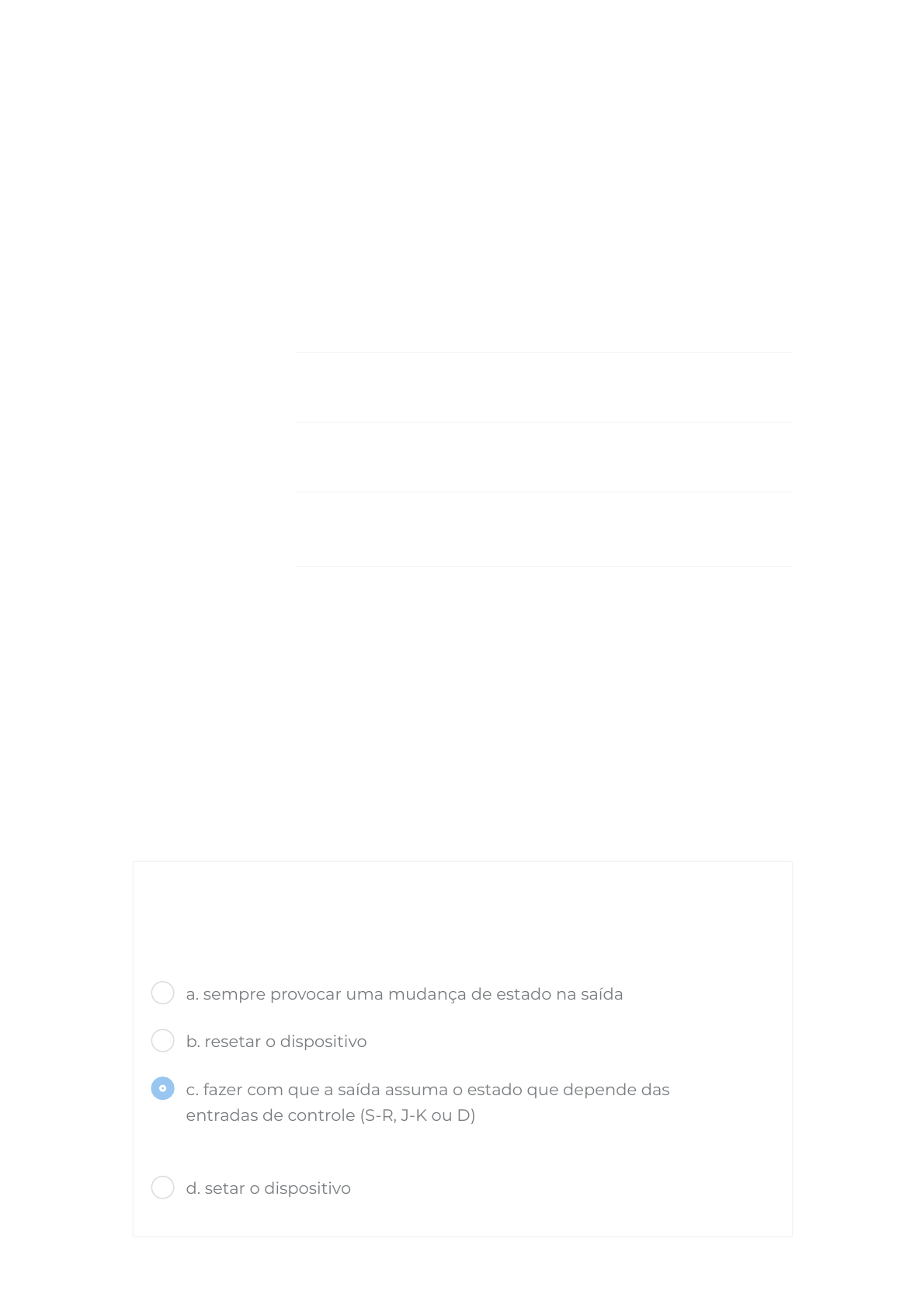 30/03/2021 Atividade 07 https://ava.politecnicabr.com.br/mod/quiz/review.php?attempt=1272974 1/5 Painel / Minhas Disciplinas / 20A140 / Aula 7 - LATCHES, FLIP-FLOPS E LATCHES, FLIP-FLOPS E TEMPORIZADORES / Atividade 07 Sistemas Digitais Iniciado em terça, 30 Mar 2021, 13:14 Estado Finalizada Concluída em terça, 30 Mar 2021, 13:17 Tempo empregado 3 minutos 19 segundos Avaliar 10,00 de um máximo de 10,00(100%) Questão 1 Correto Atingiu 1,50 de 1,50 A �nalidade da entrada de clock num �ip-�op é Escolha uma opção: a. sempre provocar uma mudança de estado na saída b. resetar o dispositivo c. fazer com que a saída assuma o estado que depende das entradas de controle (S-R, J-K ou D) d. setar o dispositivo https://ava.politecnicabr.com.br/my/ https://ava.politecnicabr.com.br/course/view.php?id=977 https://ava.politecnicabr.com.br/course/view.php?id=977#section-9 https://ava.politecnicabr.com.br/mod/quiz/view.php?id=32683 https://ava.politecnicabr.com.br/ 30/03/2021 Atividade 07 https://ava.politecnicabr.com.br/mod/quiz/review.php?attempt=1272974 2/5 Questão 2 Correto Atingiu 1,00 de 1,00 Seum latch S-R tem um nível 1 na entrada S e um nível 0 na entrada R e em seguida a entrada S passa para o nível 0, o latch estará no estado Escolha uma opção: Questão 3 Correto Atingiu 1,50 de 1,50 Uma característica que distingue o �ip-�op J-K do �ip-�op S-R é Escolha uma opção: a. inválido b. set c. clear d. reset a. a entrada preset b. a entrada clear c. a condição toggle d. o tipo de clock https://ava.politecnicabr.com.br/ 30/03/2021 Atividade 07 https://ava.politecnicabr.com.br/mod/quiz/review.php?attempt=1272974 3/5 Questão 4 Correto Atingiu 1,50 de 1,50 Um �ip-�op está na condição toggle quando Escolha uma opção: Questão 5 Correto Atingiu 1,50 de 1,50 A largura do pulso de saída de um mono estável não-redisparável depende Escolha uma opção: a. J = 0, K = 0 b. J = 1, K = 0 c. J = 1, K = 1 d. J = 0, K = 1 a. de um resistor e um capacitor b. da tensão de alimentação c. dos intervalos de disparo d. da tensão de limiar https://ava.politecnicabr.com.br/ 30/03/2021 Atividade 07 https://ava.politecnicabr.com.br/mod/quiz/review.php?attempt=1272974 4/5 Questão 6 Correto Atingiu 1,50 de 1,50 Assim como o latch, o�ip-�op pertence a uma categoria de circuitos lógicos conhecida como Escolha uma opção: Questão 7 Correto Atingiu 1,50 de 1,50 Para um latch D controlado, a saída Q sempre é igual a entrada Escolha uma opção: a. monoestáveis b. multivibradores biestáveis c. multivibradores monoestáveis d. multivibradores estáveis a. antes do pulso de habilitação b. durante o pulso de habilitação c. imediatamente após o pulso de habilitação d. as respostas (b) e (c) estão corretas https://ava.politecnicabr.com.br/ 30/03/2021 Atividade 07 https://ava.politecnicabr.com.br/mod/quiz/review.php?attempt=1272974 5/5 © 2020 - Escola Politécnica Brasileira Entre em Contato https://www.politecnicabr.com.br 0800 084 2627 indisponível devido a pandemia de COVID-19, use outro canal! 0800 084 2627 comercial@politecnicabr.com.br Links Úteis Dicas da nossa Diretora Acadêmica Planner de Estudos Declaração de Matrícula Orientações do AVA Abertura de Ticket Fale com o Tutor Cronograma de Estudos Solicitação de Diploma Manual de Estágio Manual de Competência Siga-nos nas redes sociais https://ava.politecnicabr.com.br/mod/quiz/0 https://www.politecnicabr.com.br/ mailto:comercial@politecnicabr.com.br https://soundcloud.com/user-501638417/sets/escola-politecnica-brasileira https://storage.googleapis.com/sirius-pubstore/semestre_plannerdeestudo%20poli.pdf https://storage.googleapis.com/sirius-pubstore/declaracao_matricula.pdf https://storage.googleapis.com/sirius-pubstore/orientacoes_ava.pdf https://storage.googleapis.com/sirius-pubstore/abertura_ticket.pdf https://storage.googleapis.com/sirius-pubstore/fale_com_tutor.pdf https://storage.googleapis.com/sirius-pubstore/cronograma_estudos.pdf https://storage.googleapis.com/sirius-pubstore/solicitacao_diploma.pdf https://storage.googleapis.com/sirius-pubstore/manual_estagio.pdf https://storage.googleapis.com/sirius-pubstore/manual_competencia.pdf https://www.facebook.com/politecnicabr https://www.instagram.com/politecnicabr_oficial https://ava.politecnicabr.com.br/