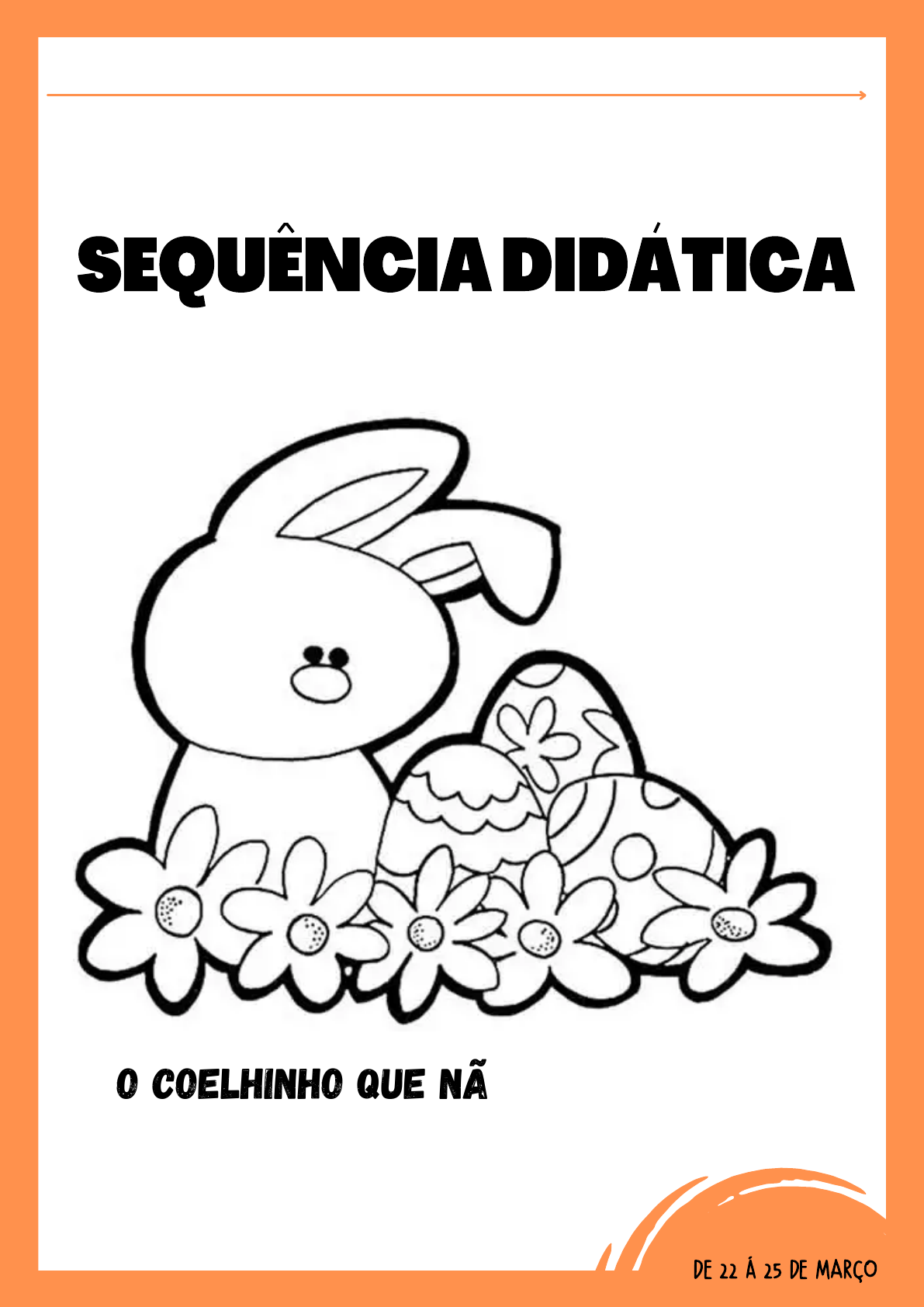 NOME: TURMA: De 6 a 12 de julho de 2020SEQUÊNCIA DIDÁTICA O coelhinho que não era da páscoa aPOSTILA 05 DE 22 Á 25 DE MARÇO Complete a sequência alfabética Agora, complete a sequência numérica 1) QUAL É O NOME DO PERSONAGEM PRINCIPAL DA HISTÓRIA? 2) O QUE TODOS OS COELHOS DAQUELA FAMÍLIA QUERIAM SER, EXCETO LIVINHO? 3) COMO VIVINHO AJUDOU SUA FAMÍLIA QUANDO ELES NÃO ENCONTRARAM OVOS DE PÁSCOA PARA COMPRAR? 4) NO FINAL DA HISTÓRIA LIVINHO ENCONTROU UMA PROFISSÃO QUE GOSTA. E VOCÊ, O QUE GOSTARIA DE SER QUANDO CRESCER? INTERPRETAÇÃO DE TEXTO OBSERVE A CAPA DO LIVRO E RESPONDA: QUAL O TÍTULO DO LIVRO? QUEM É A AUTORA? A ILUSTRADORA É A ELISABETH TEIXEIRA, ISSO SIGNIFICA QUE ELA FEZ O QUE NO LIVRO? LEIA O LIVRO OU ASSISTA A CONTAÇÃO DE HISTÓRIA. DEPOIS RESPONDA: 01 POTIM,______ DE MARÇO DE 2021 Complete o nome das figuras com as vogais fujonas. C__ E L H __ C__ N__U R__ __ B__ L H __ B__RB__L__T__ __ V __ f l __ r 02 PINTE UMA BOLINHA PARA CADA SÍLABA DA PALAVRA E DEPOIS ESCREVA O NÚMERO NO QUADRADINHO AO LADO. 03 POTIM,______ DE MARÇO DE 2021 Quem são os vizinhos? Ligue as imagens ao seu nome e número de letras FLOR Ovo ABELHA Coelho BORBOLETA 3 4 9 6 04 16 12 17 20 14 18 LEIA AS PALAVRAS E FAÇA O QUE SE PEDE CENOURA LETRA INICIAL LETRA FINAL Nº DE LETRAS Nº VOGAIS Nº CONSOANTES Nº SÍLABAS CHOCOLATE ESCREVA UMA PALAVRA QUE INICIE COM A SÍLABA FINAL LETRA INICIAL LETRA FINAL Nº DE LETRAS Nº VOGAIS Nº CONSOANTES Nº SÍLABAS ESCREVA UMA PALAVRA QUE INICIE COM A SÍLABA FINAL 05 POTIM,______ DE MARÇO DE 2021 Os nomes das imagens estão separados em sílabas. Preencha as sílabas corresponte a cada figura _ _ _ _ _ _ _ _ _ _ _ _ _ _ _ _ _ _ _ _ _ _ _ _ _ _ _ _ _ _ ESCOLHA UMA DAS FIGURAS, DESENHE E ESCREVA UMA FRASE 06 Qual é a palavra correta? Pinte e escreva abaixo COLHER COELHO COPO CENOURA VASSOURA CESTA CHOCALHO TOMATE CHOCOLATE FORMIGA FOGÃO PÃO 07 Ajude a Julieta a efetuar os fatos e depois pinte conforme a legenda Laranja: resultado igual a 1 Verde: Resultado igual a 2 Rosa: Resultado igual a 3 Amarelo: Resultado igual a 4 Vermelho: Resultado igual a 5 Azul: Resultado igual a 6 POTIM,______ DE MARÇO DE 2021 Pesquise 4 curiosidades sobre os coelhos 08 DITADO 09