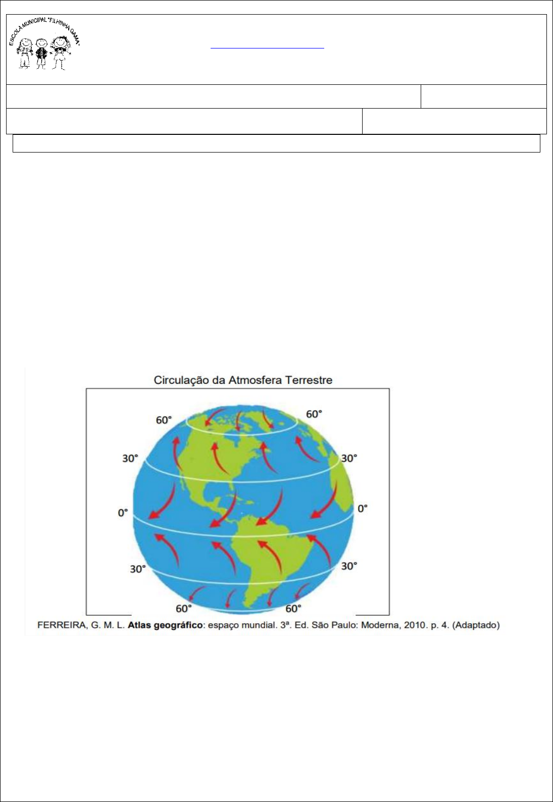 CONTEÚDO: CIRCULAÇÃO ATMOSFÉRICA – HABILIDADE: EF06GE03 A CIRCULAÇÃO ATMOSFÉRICA É UM DOS PRINCIPAIS FATORES RESPONSÁVEIS PELA CONFIGURAÇÃO E VARIAÇÃO DOS CLIMAS PELO MUNDO. OBSERVE O ESQUEMA ABAIXO, QUE INDICA A CIRCULAÇÃO ATMOSFÉRICA SOBRE A SUPERFÍCIE TERRESTRE. A CIRCULAÇÃO ATMOSFÉRICA RESULTA DA MOVIMENTAÇÃO GERAL DO AR, PROPORCIONADA PELO MOVIMENTO DE ROTAÇÃO DA TERRA E PELA DESIGUAL DISTRIBUIÇÃO DE ENERGIA SOLAR. É UM MOVIMENTO DE GRANDE ESCALA, RESPONSÁVEL PELO AQUECIMENTO DA SUPERFÍCIE TERRESTRE. OS VENTOS ALÍSIOS DIRIGEM-SE DAS ÁREAS TROPICAIS PARA AS EQUATORIAIS, EM SENTIDO HORÁRIO NO HEMISFÉRIO NORTE E ANTI-HORÁRIO NO HEMISFÉRIO SUL, GRAÇAS, PRINCIPALMENTE À MOVIMENTAÇÃO DA TERRA. ATENÇÃO! NA PARTE SUPERIOR (POLO NORTE) DA FIGURA QUE REPRESENTA O GLOBO TERRESTRE, TEMOS AS SETINHAS VERMELHAS* APONTANDO PARA A DIREITA (SENTIDO HORÁRIO); NA PARTE INFERIOR (POLO SUL), NÓS TEMOS AS SETINHAS APONTANDO PARA A ESQUERDA (SENTIDO ANTI-HORÁRIO). * NO XEROX AS SETINHAS ESTARÃO NA COR PRETA. ESCOLA MUNICIPAL FILHINHA GAMA Avenida Antônio Mourão Guimarães nº 763 – Jardim Encantado – São José da Lapa - MG Email: filhinhagama@gmail.com 2010- 1140 6ª QUINZENA- GEOGRAFIA PDI (Plano de Desenvolvimento Individual) ALUNO (A): TURMA: PROFESSOR: JORGE E. RIBEIRO DATA DE ENTREGA:24/05/2021 DATA DE DEVOLUÇÃO: 07/06/2021 mailto:filhinhagama@gmail.com AGORA QUE VOCÊ JÁ VIU UM POUCO SOBRE A CIRCULAÇÃO DAS MASSAS DE AR SOBRE O PLANETA TERRA, VAMOS EXERCITAR UM POUCO SOBRE O ASSUNTO. 1 – COMPLETE A FRASE ABAIXO: A CIRCULAÇÃO ATMOSFÉRICA RESULTA DA MOVIMENTAÇÃO _____________________, PROPORCIONADA PELO MOVIMENTO DE_____________________ DA TERRA. 2 – PERGUNTA PARA UM DE SEUS PAIS E/OU RESPONSÁVEL; O QUE É CLIMA? AGORA ESCREVA NESTE ESPAÇO O QUE VOCÊ ENTENDEU. 3 – PEQUENO TRABALHO (FAZER EM FOLHA A PARTE E ANEXÁ- LO AO RESTANTE DESTA ATIVIDADE). TEMA: OBSERVAÇÃO DO TEMPO E DO CLIMA. O TRABALHO CONSISTE NA SEGUINTE MANEIRA: 1º PASSO: ANOTE NESTE ESPAÇO COMO É O CLIMA EM SÃO JOSÉ DA LAPA. 2º Passo: DURANTE O PERÍODO DE TRÊS DIAS, OBSERVE O AMANHECER E ANOTE AQUI. EXEMPLO: AMANHECEU COM SOL, CHOVENDO, FRIO ETC. PRIMEIRO DIA SEGUNDO DIA TERCEIRO DIA SE PRECISAR CONSULTE O SITE ABAIXO. (É SO COLOCAR O NOME DA CIDADE). EXEMPLO: https://www.climatempo.com.br/previsao-do-tempo/cidade/ CONTEÚDO: PRINCIPAIS MOVIMENTOS DA TERRA https://atividadespedagogicas.net/wp-content/uploads/2019/03/ATIVIDADES-SOBRE-O-MOVIMENTO-DA-TERRA-1.png CARO ALUNO(A)! PARA REALIZAR AS ATIVIDADES E AMPLIAR SEU CONHECIMENTO SOBRE OS CONTEÚDOS ABORDADOS NESTA QUINZENA, INDIQUEI ABAIXO ALGUNS SITES CONTENDO AULAS IMPORTANTES SOBRE OS TEMAS. PROCURE ACESSÁ-LOS E BONS ESTUDOS! HTTPS://WWW.TEMPO.COM/NOTICIAS/CIENCIA/CIRCULACAO-GERAL-DA-ATMOSFERA- TERRESTRE.HTML HTTPS://MUNDOEDUCACAO.UOL.COM.BR/GEOGRAFIA/CIRCULACAO-ATMOSFERICA.HTM# HTTPS://BRASILESCOLA.UOL.COM.BR/GEOGRAFIA/CIRCULACAO-ATMOSFERICA.HTM PROFESSOR: JORGE https://mundoeducacao.uol.com.br/geografia/circulacao-atmosferica.htm https://brasilescola.uol.com.br/geografia/circulacao-atmosferica.htm http://atividadeparaeducacaoespecial.com/wp-content/uploads/2016/01/geografia-4.jpg