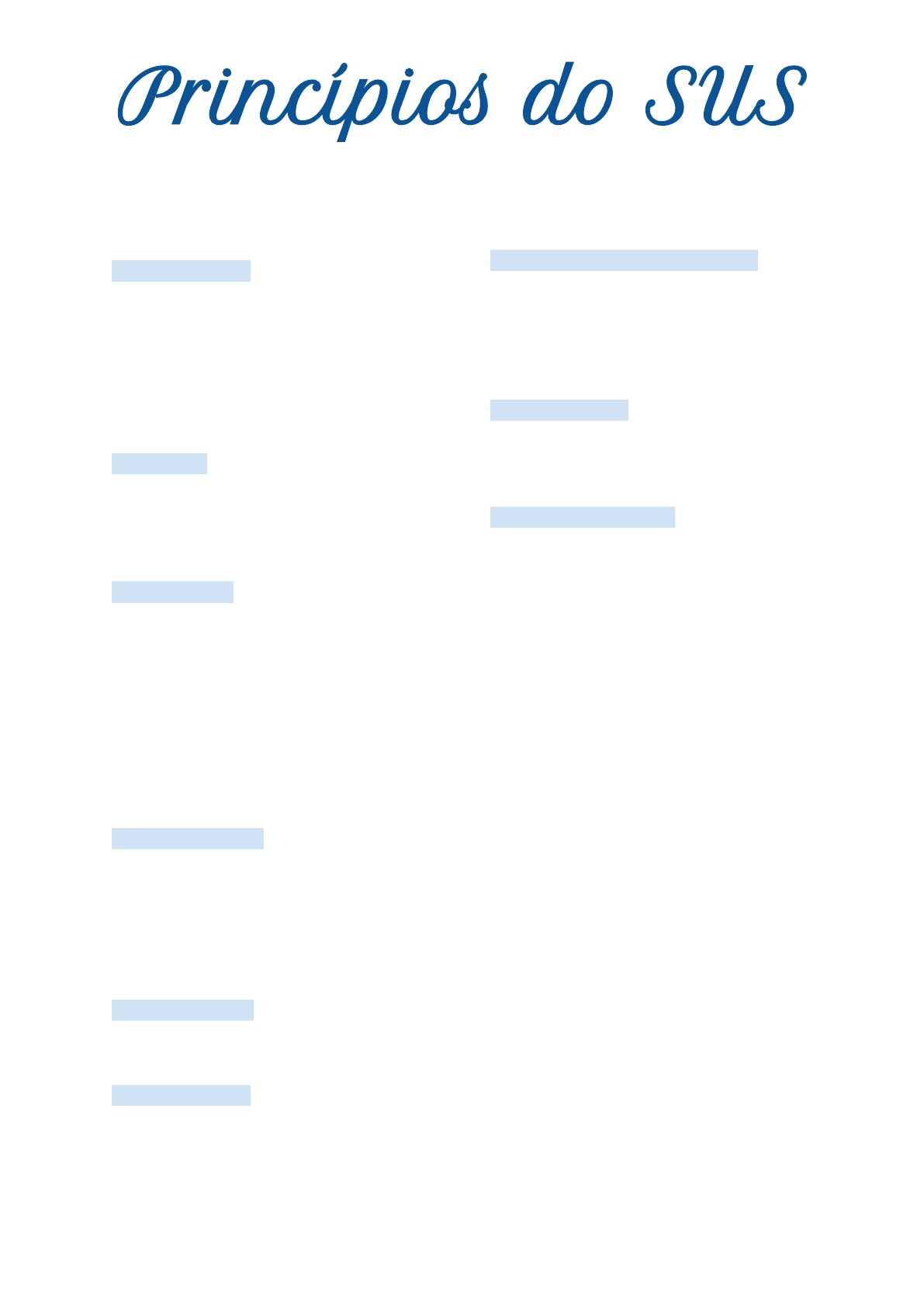 Princípi�s do SUS Princípios Doutrinários do SUS: Universalidade: ● Acesso universal ● Direito de todos (inclusive de estrangeiros) ● Acesso a todos os níveis de atenção via redes de atenção ● Porta principal de acesso: Atenção Básica (UBS) Equidade: ● Justiça social ● Reconhecer as diferenças ● Dar mais para quem precisa mais Integralidade: ● Atendimento em todos os níveis de atenção ● Atendimento da pessoa como um todo ● Atendimento em todas as necessidades no ciclo de vida Princípios Organizativos do SUS: Descentralização: o poder e a responsabilidade sobre o setor são distribuídos entre os três níveis de governo, objetivando uma prestação de serviços com mais eficiência e qualidade e também a fiscalização e o controle por parte da sociedade. Regionalização: delimitação (recorte espacial) de uma base territorial para o sistema de saúde. Hierarquização: organização das unidades segundo grau de complexidade tecnológica dos serviços, isto é, o estabelecimento de uma rede que articula as unidades mais simples às unidades mais complexas, através de um sistema de referência (SR) e contrarreferência (CR) de usuários e de informações. Participação e controle social: atores sociais historicamente não incluídos nos processos decisórios do país participam, com o objetivo de influenciarem a definição e a execução da política de saúde. Resolutividade: possibilidades de resolução dos problemas de saúde dentro dos níveis de complexidade as quais foram detectadas. Complementaridade: quando o setor público for insuficiente, o setor privado deve suplementar, dando preferência aos serviços não lucrativos, seguindo os mesmos princípios de regionalização, hierarquização, universalidade e equidade do SUS. Níveis de atenção à saúde: Atenção primária: Unidade básica de saúde ● Saúde individual, coletiva e familiar ● Porta de entrada do sistema para os níveis superiores ● Equipe multiprofissional ● Dirigida à população em território definido Atenção secundária: Serviços ambulatoriais ● Média complexidade ● Assistência especializada clínica e cirúrgica ● Procedimentos ambulatoriais ● UPA / AME (ambulatório médico especializado) / SAMU Atenção Terciária: Serviços hospitalares de maior complexidade ● Hospitais ● Cirurgias e internações ● Procedimentos de alto custo ● Diálise / Trauma / Eletrofisiologia Medicina Centrada no Paciente (MCP) ou Método Clínico Centrado na Pessoa (MCCP) Modelo de atendimento médico usado para garantir que as características das pessoas sejam levadas em consideração. Medicina baseada em evidências. Vantagens: o Maior satisfação do médico e do doente o Maior adesão ao tratamento o Melhor autoavaliação de saúde o Menos reclamações por negligência médica Expectativa do paciente em relação ao atendimento médico: o Que avalie a razão principal da consulta e se preocupe com suas necessidades Que procure entender o seu mundo como um todo (doença e necessidades emocionais) o o Que o tratamento seja um comum acordo o Que o relacionamento entre médico e paciente melhore Seis componentes do MCCP: 1) Explorando a doença e a experiência com a doença o História clínica, exames físicos e laboratoriais 2) Entendendo a pessoa como um todo o Contexto de vida e familiar, cultura e comunidade 3) Elaborando um plano conjunto de manejo dos problemas o Objetivo de tratamento/ manejo da doença 4) Incorporando prevenção e promoção de saúde o Melhora da saúde, prevenção de riscos, redução das complicações 5) Intensificando o relacionamento entre pessoa e médico o Compaixão, cura, consciência de si 6) Sendo realista o Tempo, administração sensata dos recursos O MCCP pode ser visto como um movimento para trazer a prática médica e o ensino de volta ao centro, para reconciliar a medicina clínica com a existencial. Política Nacional de Atenção Básica 2017 (PNAB) Conjunto de ações de saúde individuais, familiares e coletivas que envolvem promoção, prevenção, proteção, diagnóstico, tratamento, reabilitação, redução de danos, cuidados paliativos e vigilância em saúde. Será ofertada integralmente e gratuitamente a todas as pessoas, de acordo com as necessidades e demandas do território, considerando os determinantes e condicionantes da saúde. É proibida qualquer exclusão baseada em idade, gênero, raça/cor, etnia, crença, nacionalidade, orientação sexual, identidade de gênero, estado de saúde, condição socioeconômica, escolaridade, limitação física, intelectual, funcional e outras. A integração entre a Vigilância em Saúde e Atenção Básica é condição essencial para o alcance de resultados que atendam às necessidades de saúde da população, e visa estabelecer processos de trabalho que consideram os determinantes, os riscos e os danos à saúde. Todas as UBS são consideradas potenciais espaços de educação, formação de recursos humanos, pesquisa, ensino em serviço, inovação e avaliação tecnológica. Estratégia Saúde da Família Reorganização do setor da saúde, substituindo o modelo tradicional e levando a saúde para mais perto das famílias, visando melhorar a vida dos brasileiros. -1991: Programa Agentes Comunitários de Saúde (PACS) - no nordeste -1994: Programa Saúde da Família (PSF) -2006: Estratégia Saúde da Família (ESF) – reorganização da atenção primária • Realiza atividades nas residências • O agente comunitário é um elo com a comunidade • Atenção focada na saúde e não na doença • Troca de saberes profissionais com os saberes populares Equipe mínima: 1 médico, 1 enfermeiro, 2 auxiliares/ técnico de enfermagem. Os agentes comunitários devem residir na área de atuação. Pode ter também 1 dentista + 1 auxiliar de saúde bucal. Núcleo Ampliado de Saúde da Família e Atenção Básica (NASF) Atuam como parceria com o