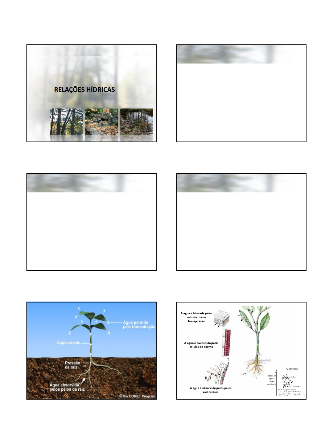 13/10/2018 1 Solo – Planta – Atmosfera UNIVERSIDADE FEDERAL DE CAMPINA GRANDE CENTRO DE CIÊNCIAS E TECNOLOGIA AGROALIMENTAR UNIDADE ACADÊMICA DE CIÊNCIAS AGRÁRIAS Disciplina: Manejo de Irrigação e Drenagem Professora: Lauriane Almeida Água na produção vegetal → Constituinte celular - a água é o principal constituinte do protoplasma e faz parte da estrutura dos compostos celulares - 80 a 95% da massa de tecidos vegetais em crescimento - 5 a 15% da massa em sementes (necessitam de quantidade considerável de água para a germinação) - importante para a formação de carboidratos, proteínas e ácidos nucléicos Água na produção vegetal • A água é transportada através da planta e é liberada para a atmosfera; • Qualquer desequilíbrio no fluxo de água pode causar déficit hídrico e disfunção de processos celulares; • As paredes celulares permitem às células vegetais criarem uma pressão hidrostática interna, conhecida como pressão de turgência; • A pressão de turgência é essencial para numerosos processos fisiológicos: crescimento celular, transporte no floema, rigidez e estabilidade mecânica de tecidos não lignificados. Movimento da Água A água move-se no sistema solo-planta-atmosfera em qualquer uma de suas fases. solo e planta – predominância da fase líquida; atmosfera – predominância da fase gasosa. O movimento se dá devido à variação no potencial total da água. A tendência espontânea universal de toda matéria na natureza é assumir um estado de energia mínima, procurando o equilíbrio com o meio ambiente. A água se move no sentido de diminuição de seu potencial. A água é absorvida pelos pêlos radiculares A água é liberada pelos estômatos na transpiração A água é conduzida pelas células do xilema 13/10/2018 2 FLUXO DE MASSA A água se move no solo principalmente por fluxo de massa, seguindo um gradiente de pressão. As plantas esgotam a água próxima a superfície de suas raízes, criando um gradiente de pressão em relação às regiões vizinhas do solo, que apresentam assim um maior valor de Ψp. Uma vez que os espaços porosos cheios de água se interconectam no solo, a água se move em direção à superfície radicular por fluxo de massa através desses canais, obedecendo a um gradiente de pressão. Esse fluxo depende do tamanho do gradiente de pressão e da condutividade hidráulica do solo = esta condutividade é uma medida da facilidade com que a água se move pelo solo e varia com o tipo de solo e com o conteúdo de água = solos arenosos tem condutividade hidráulica > solos argilosos. 13/10/2018 3 13/10/2018 4 É o movimento de solutos orgânicos e inorgânicos no interior da planta através de tecidos condutores: xilema e floema. TRANSLOCAÇÃO Transporte nas plantas Transporte nas plantas A água e os sais minerais são absorvidos pela raiz. Os pêlos radiculares contribuem para o aumento da área de absorção. Transporte nas plantas As plantas fazem a absorção de água e sais minerais necessários ao seu desenvolvimento, através do seu sistema radicular, que por esse motivo é permeável (não apresenta cutícula), muito ramificado e cuja área é aumentada através da presença de pêlos radiculares. O CO2 é fixado durante a fase química da fotossíntese, entrando na planta através de estomas presentes nas folhas!! (pelos estomas pode também sair água – transpiração). Transporte nas plantas As plantas precisam de distribuir a água os compostos orgânicos a todos os órgãos… e fazem- no através de dois sistemas de transporte: o xilema e o floema. Mas será que todas as plantas necessitarão de sistemas de transporte para o fazer?? Plantas de pequenas dimensões que vivem em ambientes húmidos, não necessitam de sistemas de transporte (quase todas as células realizam a fotossíntese e por difusão /osmose as substâncias são distribuidas), Transporte nas plantas SURGEM OS MEIOS DE TRANSPORTE!! 13/10/2018 5 Transporte nas plantas Plantas simples de pequenas dimensões não necessitam de sistemas de transporte - são plantas avasculares (não possuem tecidos condutores; nem xilema nem floema). Plantas mais evoluídas de grandes dimensões necessitam de sistemas de transporte – são plantas vasculares (possuem tecidos condutores: xilema e floema; de outra forma o transporte por difusão seria demasiado lento e difícil). A água vai-se movimentando célula a célula por osmose. Os produtos resultantes da fotossíntese também se movimentam por difusão ou transporte ativo célula a célula – é que as distâncias são curtas. Transporte nas plantas Transporte nas plantas PLANTAS VASCULARES PLANTAS AVASCULARES Contém tecidos especializados no transporte de substâncias. Não contém tecidos especializados no transporte de substâncias. Transporte nas plantas QUEM É RESPONSÁVEL, NAS PLANTAS, PELO TRANSPORTE DAS SUBSTÂNCIAS? São tecidos complexos, formados por diferentes tipos de células especializadas, estendem-se desde as raízes ao caule e chegam às folhas. • XILEMA • FLOEMA Lenha ou tecido traqueano Líber ou tecido floémico Transporta SEIVA BRUTA (xilémica): água e substâncias inorgânicas (das raízes até às folhas) – movimento ascendente, por norma. Transporta SEIVA ELABORADA (floémica): água e substâncias orgânicas (das folhas até aos outros órgãos das plantas). Transporte nas plantas TRANSLOCAÇÃO Movimento de água e solutos no interior da planta através de tecidos condutores ou vasculares. 13/10/2018 6 Transporte nas plantas A maioria das plantas apresenta um sistema de transporte constituídos por células especializadas que formam os tecidos /vasos condutores ou vasculares; XILEMA e FLOEMA. Corte de um talo vegetal evidenciando os vasos condutores. Os tecidos condutores organizam-se em feixes (conjuntos). Transporte nas plantas As nervuras das plantas correspondem aos vasos condutores, os quais se encontram agrupados em feixes vascula