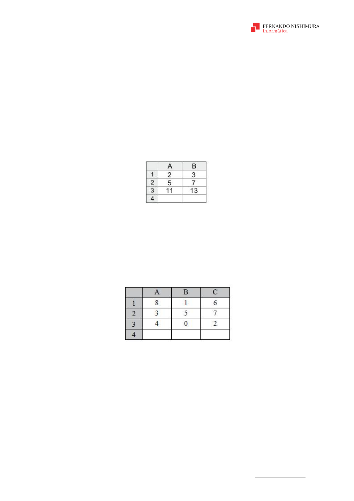 Proibida a reprodução, mesmo parcial e por qualquer processo, sem autorização expressa do Autor mediugorie@hotmail.com Pág. 1 INFORMÁTICA DE CONCURSOS PROF. FERNANDO NISHIMURA DE ARAGÃO São José dos Campos (SP) – 12 de agosto de 2021 Correção ao vivo em https://www.youtube.com/watch?v=8yR9S7tVFNc às 19h 01. (2010) Assinale a alternativa que apresenta o valor numérico obtido na célula B4 da planilha mostrada na figura a seguir, que está sendo elaborada com o auxílio do programa Microsoft Excel XP, em sua configuração padrão, sabendo que a expressão matemática =SE(B2>A3;MAIOR(B1:B3;1); MENOR(A1:A3;2)) foi digitada nessa célula. A) 2. B) 3. C) 5. D) 7. E) 11. 02. (2011) Assinale a alternativa que contém os valores obtidos nas células A4, B4 e C4 da planilha que está sendo elaborada com o Microsoft Excel XP, em sua configuração padrão, sabendo que nelas foram digitadas, respectivamente, as expressões =MÉDIA(A1:A3), =MENOR(B1:B3;2) e =MAIOR(C1:C3;3), e que as demais células foram preenchidas como mostrado na figura a seguir. A) 3, 0 e 7. B) 5, 0 e 7. C) 5, 1 e 2. D) 7, 5 e 2. E) 8, 3 e 4. 03. (2012) Uma planilha do Microsoft Excel XP, na sua configuração padrão, possui os seguintes valores nas células: B1=4, B2=1 e B3=3. A fórmula =ARRED(MÍNIMO(SOMA (B1:B3)/3;2,7);2) inserida na célula B5 apresentará o se-guinte resultado: A) 2 B) 1,66 C) 2,667 D) 2,7 E) 2,67 mailto:mediugorie@hotmail.com https://www.youtube.com/watch?v=8yR9S7tVFNc Proibida a reprodução, mesmo parcial e por qualquer processo, sem autorização expressa do Autor mediugorie@hotmail.com Pág. 2 04. (2013) Considere a seguinte fórmula digitada na célula A1 de uma planilha do MS-Excel XP, em sua configuração original. =SE(E(B$2>12;$C3>8);"Urgência";"Normal") Ao se copiar a fórmula para a célula B1, tem-se: A) =SE(E(B$4>12;$C2>8);"Urgência";"Normal") B) =SE(E(B$3>12;$C2>8);"Urgência";"Normal") C) =SE(E(C$2>12;$C3>8);"Urgência";"Normal") D) =SE(E(B$2>12;$C3>8);"Urgência";"Normal") E) =SE(E(B$2>12;$C4>8);"Urgência";"Normal") 05. (2014) Tem-se uma planilha no Microsoft Excel 2010, em sua configuração padrão, e um gráfico de rosca criado a partir do conteúdo das células A1 até B5. A soma das fatias do “Tipo 1” e “Tipo 2”, em relação ao total das fatias, representa A) 100% B) 25% C) 150% D) 50% E) 75% 06. (2014) Tem-se a planilha a seguir, criada no Microsoft Excel 2010, em sua configuração original. Um usuário selecionou todo conteúdo entre as células A1 e C8 e pressionou Ctrl+C. Assinale a alternativa que contém o nome da opção utilizada na janela Colar Especial para produzir o resultado a seguir. A) Fórmulas e formatos de números. B) Multiplicar. C) Transpor. D) Validação. E) Formatos. mailto:mediugorie@hotmail.com Proibida a reprodução, mesmo parcial e por qualquer processo, sem autorização expressa do Autor mediugorie@hotmail.com Pág. 3 07. (2014) Assinale a alternativa que apresenta o resultado correto após ordenar de forma crescente a coluna A, a partir da planilha criada no Microsoft Excel 2010, em sua configuração original, demonstrada a seguir: A) a, b, c, d, e, f, 1, 2, 3, 4 B) a, b, c, d, 1, 2, 3, 4, e, f C) a, 1, b, 2, c, 3, d, 4, e, f D) 1, a, 2, b, 3, c, 4, d, e, f E) 1, 2, 3, 4, a, b, c, d, e, f 08. (2014) Uma planilha criada no Microsoft Excel 2010, em sua configuração padrão, está preenchida como se apresenta a seguir: A célula D8 contém a fórmula =SOMA(D2:D7) Se o usuário inserir uma linha, entre as linhas 6 e 7, e preencher com o valor 1.000 na coluna D, tal qual se apresenta a seguir, assinale a alternativa que indica o que acontece com a soma final, automaticamente movimentada pelo Excel para a célula D9. A) A soma passa a ser de 11.500. Ao se inserir a linha, a fórmula é automaticamente ajustada para =SOMA(D2:D8) mailto:mediugorie@hotmail.com Proibida a reprodução, mesmo parcial e por qualquer processo, sem autorização expressa do Autor mediugorie@hotmail.com Pág. 4 B) A soma retorna a um erro. Ao se inserir a linha, a fórmula precisa ser refeita. C) A soma passa a ser de 10.000. A nova linha inserida e todas as linhas abaixo dela não são consideradas na fórmula de soma. D) A soma final mantém-se com 10.500. A nova linha inserida não é considerada na fórmula de soma. E) A soma passa a ser de 11.000. A fórmula considera que a última linha da seleção original de dados é a linha 7, e assim despreza a linha 8. 09. (2015) A planilha a seguir foi elaborada no MS-Excel 2010 (versão para a língua portuguesa), em sua configuração padrão. Supondo--se que os valores das células D3 a D8, B8 e C8 foram calculados utilizando--se funções do MS-Excel 2010, é correto afirmar que A) B8=SOMAT(B3:B7) B) C8=SOMA(C3-C7) C) D8=SOMA(D3:D7) D) D8=SOMAT(B3...C7) E) D6=SUM(B6:C6) 10. (2015) Elaborou--se uma planilha de grandes dimensões no MS-Excel 2010 (versão para a língua portuguesa), em sua configuração padrão, e deseja--se manter sempre visíveis as linhas e colunas de importância da planilha, como os títulos de cada linha e coluna. O botão do recurso Congelar Painéis que possibilita essa ação é: A) B) C) D) E) 11. (2015) Um usuário do MS-Excel 2010 (versão para a língua portuguesa), em sua configuração padrão, elaborou uma planilha e protegeu todas suas células para que outros usuários não as alterem. Caso algum usuário deseje remover essa proteção, ele deve mailto:mediugorie@hotmail.com Proibida a reprodução, mesmo parcial e por qualquer processo, sem autorização expressa do Autor mediugorie@hotmail.com Pág. 5 A) selecionar a aba Proteção do Menu, clicar no íco-ne Desbloquear Planilha do grupo Proteção. B) selecionar a aba Proteção do Menu, clicar no íco-ne Senha de Desproteção do grupo Proteção e digitar a senha solicitada. C) selecionar a aba Revisão do Menu, clicar no íco-ne Destravar Planilha do grupo Proteção. D) selecionar a aba Revisão do Menu, clicar n