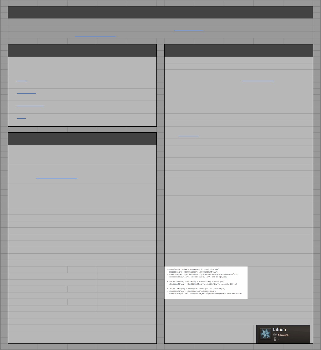 Accuracy & Evasion V2 Sheet by [NA] Nescient (Krix#4864) Research by [NA] Bigandshiny (/u/Bigandshiny) See Sources & References for all proof and accreditation. If it isn't cited, consider it to be my opinion. Orientation Frequently Asked Questions Welcome to V2 of my spreadsheet! I've re-made the sheet to be clearer and more comprehensive than the original, thanks in part to tricks I stole from Snow#3427 of the Lifeskill discord. Is there a difference between regular and hidden accuracy / evasion? No. How do I find my accuracy / evasion? See Table to get a quick and dirty glance at the relationship between accuracy and evasion. The easiest way is to input your gear into BDOPlanner.com and see what it outputs there. You want to use "Evasion" and "Hidden Evasion". The Melee / Ranged / Magic values are from your class, and are accounted for in this sheet. You can also see your accuracy in-game by hovering over the ? by your AP, but that will not include your crystals. See Calculator to get more finely tuned information that can directly and accurately reflect your character's interactions with hit rates. See Build Samples to see some examples of late game builds so you can get an idea of what values players actually walk around with. Does my level affect my hit rate? See Data to get a look behind-the-scenes of this spreadsheet at the numbers and math that goes into the formulae. No. I found something that disagrees with something here. Message me on Discord. Just don't send me my own, old, and completely invalid reddit post from 3 years ago when stats were hidden lmao. General Information Is evasion superior to DR late game? This entire sheet is based on work by Bigandshiny, the developer(s) behind BDOCodex and BDOPlanner, and dataminers. I did not fabricate anything here, I only implemented existing information. If you want to limit your AP and push a DP build, then usually yes. Otherwise, usually no. I cannot spoonfeed a better answer. Are O'dyllita accessories best-in-slot? If you would like to better understand or challenge the math and values this sheet is based on, please reach out to those people. You can find their contact information in Sources & References. Turo's belt is probably best-in-slot for most classes, otherwise it depends. Is Kzarka better than Offin? It seems unlikely that trading 20 accuracy for 3 mainhand-only AP is a good deal, since it is by far the best tradeoff of AP to accuracy. However, it may be good for some classes. If you are interested in the implementation, formatting, or use of this spreadsheet, then please reach out to me in-game or on Discord. I would also appreciate messages about any bugs, mistakes, or suggestions you may have! Why do you suggest -15% Evasion debuffs in the calculator? Because the debuff is frequently applied by witches and wizards (Voltaic Pulse), so most of your targets will have this applied to them. Rangers also apply a -12% Evasion all the time (Blasting Gust). For 1v1 calculations, set to what your class has available. How do you calculate Hit Rate? The base formula is: Hit Rate = 0.2624 * [Total Accuracy] - 0.2101 * [Total Evasion] + 60.713 Next, you have to factor in percentage based modifiers, including: At what dodge rate does Evasion become better than similar geared DR? - Infinite Mastery IV (+2%) Not sure yet, check back in a few days or so. I have to investigate bigandshiny's research on DR. The formula is more complciated than hit rate.- Accuracy Rate +X% on passives - Accuracy Rate +X% on skills - Accuracy Rate +X% self-buffs Update: There is no straightforward AP / DR equation. I will find a way to use this insane mess.- Accuracy Rate +X% self-buffs (add-ons) - Accuracy Rate -X% debuffs - Accuracy Rate -X% debuffs (add-ons) - Evasion Rate +X% on passives - Evasion Rate +X% self-buffs - Evasion Rate +X% self-buffs (add-ons) - Evasion Rate -X% debuffs - Evasion Rate -X% debuffs (add-ons) Your questions here! Every single one of these stack additively. DM me on Discord if you have something else I should add here. Accuracy Rate +X% and Evasion Rate -X% increase total hit rate by that %. Accuracy Rate -X% and Evasion Rate +X% decrease total hit rate by that %. If you are NA, stay away from this guild. The leadership is deceptive and backstabbing.So, if the result of the base formula was 50% hit rate and you had a total of Accuracy Rate +20%, your hit rate would be 70%. Hit Rate % Information Gear Evasion Gear Accuracy Hit Rate = 0.2624 * Accuracy - 0.2101 * Evasion + 60.713 350 360 370 380 390 400 410 420 430 440 450 460 470 480 490 500 510 520 530 540 550 This table is a quick and dirty implementation for fast, easy, inprecise reference. 400 100.0 100.0 100.0 100.0 100.0 100.0 100.0 100.0 100.0 100.0 100.0 100.0 100.0 100.0 100.0 100.0 100.0 100.0 100.0 100.0 100.0 420 100.0 100.0 100.0 100.0 100.0 100.0 100.0 100.0 100.0 100.0 100.0 100.0 100.0 100.0 100.0 100.0 100.0 100.0 100.0 100.0 100.0 Each column represents an attacker's accuracy, and each row is the defender's evasion.440 100.0 100.0 100.0 100.0 100.0 100.0 100.0 100.0 100.0 100.0 100.0 100.0 100.0 100.0 100.0 100.0 100.0 100.0 100.0 100.0 100.0 460 98.7 100.0 100.0 100.0 100.0 100.0 100.0 100.0 100.0 100.0 100.0 100.0 100.0 100.0 100.0 100.0 100.0 100.0 100.0 100.0 100.0 480 94.5 97.1 99.7 100.0 100.0 100.0 100.0 100.0 100.0 100.0 100.0 100.0 100.0 100.0 100.0 100.0 100.0 100.0 100.0 100.0 100.0 This table DOES factor in: 500 90.3 92.9 95.5 98.1 100.0 100.0 100.0 100.0 100.0 100.0 100.0 100.0 100.0 100.0 100.0 100.0 100.0 100.0 100.0 100.0 100.0 - Accuracy / evasion from gear (the row/column). 520 86.1 88.7 91.3 93.9 96.6 99.2 100.0 100.0 100.0 100.0 100.0 100.0 100.0 100.0 100.0 100.0 100.0 100.0 100.0 100.0 100.0 - Base class accuracy. 540 81.9 84.5 87.1 89.7 92.4 95.0 97.6 100.0 100.0 100.0 100.0 100.0 100.0 100.0 100.0 100.0 100.0 100.0 100.0 100.0 100.0 - Approximated base class evasion of 315. Classes range from 283 to 338 evasion.560 77.7 80.3 82.9 85.5