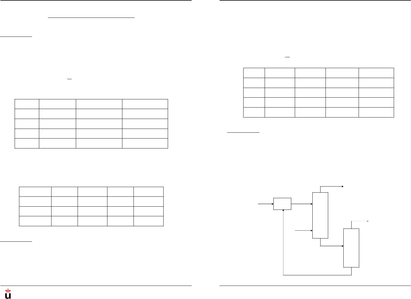 OPERACIONES DE SEPARACIÓN (3º Grado en I.Q.) Curso 2014/2015 OPERACIONES DE SEPARACIÓN (3º Grado en I.Q.) Curso 2014/2015 UNIVERSIDAD REY JUAN CARLOS ESCUELA SUPERIOR DE CIENCIAS EXPERIMENTALES Y TECNOLOGÍA TEMA 2. DESTILACIÓN Y RECTIFICACIÓN PROBLEMA 2.1 Una mezcla de composición molar: 30% de etano, 30% de n-butano y 40% de n-pentano está en fase líquida a 40ºC y elevada presión. Cuando se reduce adiabáticamente su presión hasta 700 kPa ¿tiene lugar alguna vaporización? ¿cuál es la temperatura final de la transformación? - Presiones de vapor de los componentes puros: 2·· lnln TDTC T B ApV +++= pv (kPa) ; T (K) etano n-butano n-pentano A 44.01 66.94 63.33 B -2568.82 -4604.09 -5117.78 C -4.976 -8.255 -7.483 D 1.46·10-5 1.16·10-5 7.77·10-6 - Entalpías de las mezclas líquidas y vapor (h, H en kJ/kmol; T en ºC) h = a + b·T H = c + d·T a b c d Etano 11,271 0,10187 23,602 0,06280 n-butano 4,569 0,04042 11,144 0,02454 n-pentano 3,477 0,03198 8,813 0,02326 PROBLEMA 2.2 Una mezcla equimolecular de etano, propano, n-butano y n-pentano se somete a un proceso de destilación súbita a 340 K y 14 atm. a) Determinar las composiciones y las cantidades de las fases líquida y vapor resultantes. b) ¿Sería posible conseguir en una única etapa de destilación súbita en otras condiciones de presión y/o temperatura la recuperación en la fase vapor del 70% del etano alimentado sin que la proporción de n-butano en dicha fase supere el 5% de la cantidad alimentada? - Presiones de vapor de los componentes puros: 2 v T·DTln·CT B Apln +++= pv (kPa); T (K) Etano Propano n-Butano n-Pentano A 44,9 52,2 59,4 71,8 B -2598 -3492 -4363 -5420 C -5,13 -6,10 -7,05 -8,82 D 1,49·10-5 1,09·10-5 0,95·10-5 0,96·10-5 PROBLEMA 2.3 El siguiente esquema corresponde a un diagrama de flujo de una columna de destilación extractiva y adiabática, que utiliza fenol como disolvente, para separar tolueno de metil- ciclohexano. La corriente de fenol fresco no contiene ni tolueno ni metil-ciclohexano y el alimento fresco no contiene fenol. En el resto de corrientes están presentes los tres componentes en distinta proporción. Las dos columnas están equipadas con condensadores totales y calderas parciales. Determinar el número de variables de diseño que deben especificarse y seleccionar las más adecuadas. ALIMENTO FRESCO FENOL FRESCO PRODUCTO RICO EN METILCICLOHEXANO PRODUCTO RICO EN TOLUENO OPERACIONES DE SEPARACIÓN (3º Grado en I.Q.) Curso 2014/2015 OPERACIONES DE SEPARACIÓN (3º Grado en I.Q.) Curso 2014/2015 UNIVERSIDAD REY JUAN CARLOS ESCUELA SUPERIOR DE CIENCIAS EXPERIMENTALES Y TECNOLOGÍA PROBLEMA 2.4 Se desea diseñar una columna de destilación para separar una mezcla de isopropanol y agua a su temperatura de ebullición con un contenido del 10% molar en isopropanol, operando a una presión de 1 atm. Como destilado se deberá obtener un producto con un 67,5% de isopropanol, de forma que se consiga recuperar el 98% del isopropanol alimentado. Si la relación de reflujo (L/D) es 1,5 veces superior al valor mínimo determinar el número de pisos teóricos necesarios si en lugar de caldera se introduce directamente vapor de agua saturado en el primer piso de la columna.. Datos: - Datos de equilibrio isopropanol-agua (fracciones molares de isopropanol) a 1 atm: x y 0 0 0.0118 0.2195 0.0841 0.4620 0.1978 0.5242 0.3496 0.5686 0.4525 0.5926 0.6794 0.6821 0.7693 0.7421 0.9442 0.9160 1 1 PROBLEMA 2.5 Se desea separar por destilación una mezcla de agua y ácido acético con un contenido del 70% molar de agua en un destilado con un 86% de agua y un residuo con un 71,5% de ácido acético. Se usará una razón de reflujo de 4 moles por cada mol de destilado. Determinar mediante el método analítico de Lewis y el método gráfico de McCabe-Thiele el número de pisos teóricos y la posición del de alimentación si la mezcla agua-ácido acético es un líquido saturado. Datos: - Datos de equilibrio agua-ácido acético (fracciones molares de agua) a 1 atm: x y 0 0 0,0530 0,1333 0,1250 0,240 0,206 0,338 0,297 0,437 0,394 0,533 0,510 0,630 0,649 0,751 0,803 0,866 0,9594 0,9725 1 1 PROBLEMA 2.6 En una columna de rectificación con 15 pisos reales de campanas de borboteo, se concentra una disolución acuosa de acetona con 60% en moles, para obtener un destilado con 95% en moles de acetona y un residuo que contiene un 1% en moles de acetona. La razón de reflujo L/D es 0,75 y el alimento entra a una temperatura de 20ºC. La presión de la columna puede considerarse constante e igual a la atmosférica. Determinar: a) Caudales de destilado y residuo por 100 kmol de alimento. b) Eficacia global de los pisos de la columna. c) Agua de refrigeración necesaria en el condensador si entra a 10ºC y sale a 40ºC d) Vapor de agua necesario para la calefacción en la caldera. Datos: OPERACIONES DE SEPARACIÓN (3º Grado en I.Q.) Curso 2014/2015 OPERACIONES DE SEPARACIÓN (3º Grado en I.Q.) Curso 2014/2015 UNIVERSIDAD REY JUAN CARLOS ESCUELA SUPERIOR DE CIENCIAS EXPERIMENTALES Y TECNOLOGÍA - Datos de equilibrio acetona-agua (fracciones molares de acetona) a 1 atm: x y T (ºC) 0.01 0.335 87.8 0.04 0.585 78.5 0.12 0.755 66.2 0.30 0.810 61.1 0.54 0.840 59.5 0.61 0.850 58.9 0.66 0.860 58.5 0.79 0.900 57.5 0.85 0.920 57.1 - Calor específico medio de una mezcla acetona-agua con 60% molar de acetona: 26,5 kcal/(kmol•K) - Calor latente del vapor de calefacción: 530 kcal/kg - Datos de entalpía-composición (sobre 0ºC): x, y h (kcal/kmol) H (kcal/kmol) 0.0 1800 11530 0.1 1360 10100 0.2 1350 9800 0.4 1440 9540 0.6 1570 9380 0.8 1670 9170 1.0 1790 8990 PROBLEMA 2.7 El alimento de una columna de destilación tiene la siguiente composición molar: propano 0,05; i-butano: 0,15; n-butano: 0,25; i-pentano: 0,20; n-pentano: 0,35. Si se desea obtener un destilado que contenga un 92,5% molar del n-butano alimentado y un residuo con un 82% molar del i-pentano alimentado: a) Estimar el número mínimo de pisos de equilibrio 