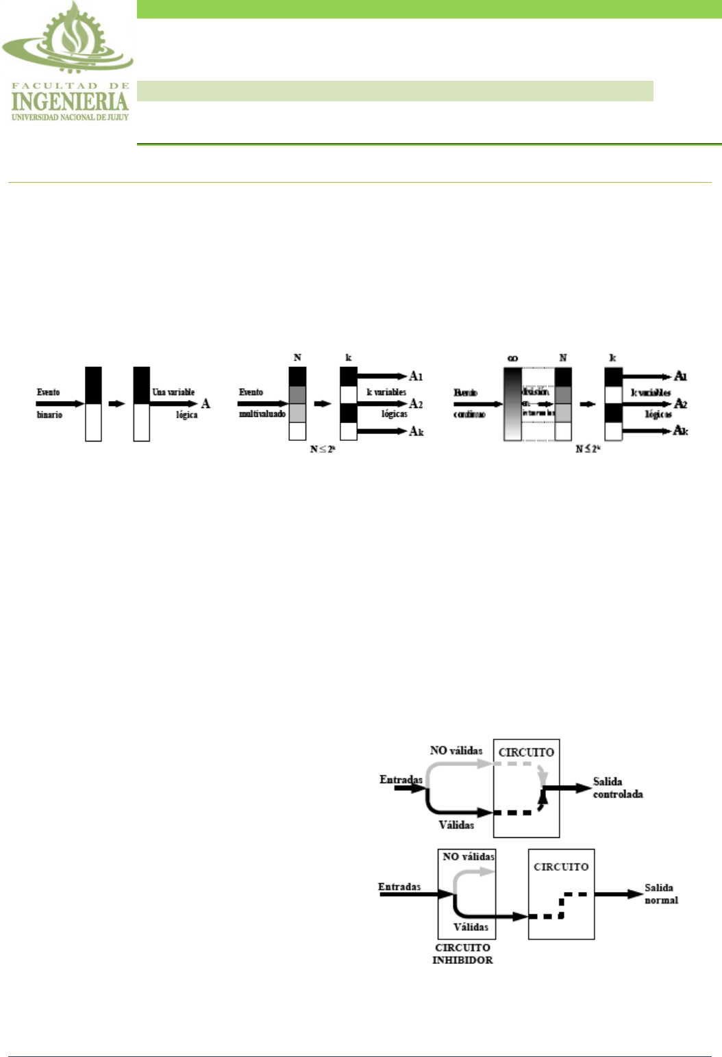 Página 1 PPPRRROOOBBBLLLEEEMMMAAASSS RRREEESSSUUUEEELLLTTTOOOSSS A. Metodología de diseño de circuitos combinacionales por tabla de verdad. Hacer un análisis detallado de la situación planteada para la comprensión total del problema a resolver. Determinar los eventos de entrada y salida intervinientes. Si un evento es binario, se asigna una variable lógica. Si un evento es multivaluado (finito), se asigna a un conjunto de variables lógicas. Si un evento es continuo (multivaluado infinito) se cuantifica en rangos o intervalos para poder asignarse a un conjunto de variables lógicas. Asignar valores lógicos a las variables, según corresponda. La asignación es necesaria y arbitraria. En el caso particular de eventos numéricos binarios, suele utilizarse la misma asignación por defecto (por ejemplo en los códigos binarios). Para las salidas la asignación numérica debe ser tal que se genere por lo menos un valor diferente para cada resultado esperado. Construir la tabla de verdad con todas las combinaciones binarias de las variables de entrada. Generar los valores de las variables de salida, según el estado correspondiente de las variables de entrada y según las asignaciones binarias propuestas para las variables de salida. Para el conjunto de valores de entrada que no pertenezcan al entorno del problema, pero que puedan hacerse presentes en las entradas, determinar la acción a seguir que podría ser algunas de las siguientes: 1. Ninguna acción si se está seguro que no se presentarán valores que no corresponden. En este caso la salida puede tomar cualquier valor. 2. Inhibir las entradas. Esto puede hacerse dentro del mismo proceso de diseño general, produciendo un cambio en el valor de entrada no válido hacia un valor controlable (por ejemplo cero) ó hacia un valor prefijado. 3. Otra forma consiste en hacer un diseño de entrada parcial, separado del diseño general, de modo que convierta a las entradas no válidas en valores predefinidos o controlables. O bien, que impida el ingreso de las entradas no válidas a la estructura general del circuito. 2 0 2 0 TTTÉÉÉCCCNNNIIICCCAAASSS YYY EEESSSTTTRRRUUUCCCTTTUUURRRAAASSS DDDIIIGGGIIITTTAAALLLEEESSS TTPP 0077 Tema: Circuitos Combinacionales Ingeniería Informática – Licenciatura en Sistemas Apellido y Nombre: LU: Carrera: Fecha: TÉCNICAS Y ESTRUCTURAS DIGITALES Página 2 4. Inhibir las salidas (por ejemplo con compuertas tri- state), cuando se presenten entradas inválidas. La señal de entrada inválida (o directamente la misma entrada inválida) actúa sobre las compuertas tri-state e inhibe la salida. 5. Producir una señal de error. En este caso a la o las salidas normales del circuito se agrega una salida adicional que marcaría error (por ej. 1) si la entrada es inválida, o bien marcaría sin error (en este caso 0) si la entrada es válida. La ventaja de este método es que no hay que hacer una modificación especial considerando cualquier entrada, pero hay que agregar una pequeña lógica de control de error. Con la tabla de verdad completa, sintetizar la función lógica correspondiente a cada salida, con el formato que se considere apropiado: 1. Formato canónico conveniente. 2. Minimizada por algún método. Plantear el circuito. Comprobar por simulación. B. Diseñe un circuito combinacional para una máquina expendedora automática que proporciona productos con diversos precios: pastillas $0,50, chicles $1,00, paquete de Rocklets $1,50 y cajita de Baggio $2,00. La máquina sólo admite monedas de $0,50, $1,00 ó billetes de $2,00 para comprar el producto y sólo entrega cambio de 1 moneda, en caso que fuera necesario. Habrá casos en los que, al no poder proporcionar el cambio correcto, devolverá la moneda o billete introducido, sin proporcionar el producto. i. En primer lugar se determinan los eventos de entrada y salida intervinientes: Entradas: Dinero Producto pedido Salidas: Entrega de producto Vuelto ii. Se asignan variables lógicas a entradas y salidas. Entradas: Dinero: Como es un evento multivaluado finito (se tiene monedas de $0,50, $1 y billete de $2) se necesitarán 2 variables lógicas: D1 y D2. Producto pedido: Igual que el caso anterior, al ser 4 los productos posibles, son necesarias 2 variables lógicas: P1 y P2. Salidas: Entrega de producto: Se trata de un evento binario, ya que la máquina puede o no entregar el producto, por lo tanto Se asigna una sola variable lógica: E. Vuelto: De acuerdo al producto que se compra y el dinero ingresado, la máquina puede devolver $0,50, $1, $2 o no devolver nada (4 opciones), entonces se necesitan 2 variables lógicas: V1 y V2. iii. Se asigna arbitrariamente valores lógicos a las variables Entradas: Dinero (D1, D2) 00: Nada 01: $0,50 10: $1 11: $2 Producto (P1, P2) 00: Pastillas 01: Chicles 10: Rocklets 11: Baggio TÉCNICAS Y ESTRUCTURAS DIGITALES Página 3 Salidas: Entrega del producto (E) 0: no entrega producto 1: entrega producto Vuelto (V1, V2) 00: Nada 01: $0,50 10: $1 11: $2 iv. Se construye la tabla de verdad con todas las combinaciones binarias de las variables de entrada y se generan los valores de las variables de salida, según el estado correspondiente de las variables de entrada y las asignaciones binarias propuestas para las variables de salida. Dinero Producto D1 D2 P1 P2 E V1 V2 Vuelto Nada Pastillas 0 0 0 0 0 0 0 Nada Nada Chicles 0 0 0 1 0 0 0 Nada Nada Rocklets 0 0 1 0 0 0 0 Nada Nada Baggio 0 0 1 1 0 0 0 Nada 0,5 Pastillas 0 1 0 0 1 0 0 Nada 0,5 Chicles 0 1 0 1 0 0 1 0,5 0,5 Rocklets 0 1 1 0 0 0 1 0,5 0,5 Baggio 0 1 1 1 0 0 1 0,5 1 Pastillas 1 0 0 0 1 0 1 0,5 1 Chicles 1 0 0 1 1 0 0 Nada 1 Rocklets 1 0 1 0 0 1 0 1 1 Baggio 1 0 1 1 0 1 0 1 2 Pastillas 1 1 0 0 0 1 1 2 2 Chicles 1 1 0 1 1 1 0 1 2 Rocklets 1 1 1 0 1 0 1 0,5 2 Baggio 1 1 1 1 1 0 0 Nada v. Con la tabla de verdad completa y utilizando el método de Karnaugh, se obtiene la función lógica correspondiente a cada salida: Para E P1 P2 D1 D2 00 01 11 10 00 1 1 𝐸 = 