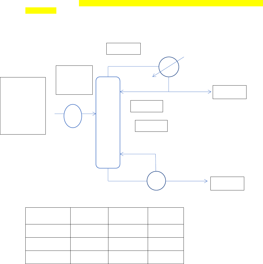 ARMENTA DOMINGUEZ ANDRES 3IV60 1.- En una torre de rectificación con un condensador total y un vaporizador parcial, se van a destilar 10,000 kg/h de una mezcla compuesta por 25% peso de hexano, 25% peso de heptano y 50% peso de octano, a la presión de 1 atmósfera. La columna a utilizar tiene 40 platos y se pretende obtener un destilado con 0.9% peso de heptano y un residuo con 1% peso de hexano. Se regresarán a la columna como líquido saturado 0.655 moles de reflujo por cada mol de vapor que fluye por el domo, además se usarán 500 kg/h de vapor saturado (Hv = 639.4 kcal/kg y hL = 100 kcal/kg) para precalentar la mezcla y llevarla hasta 80° C. Las Tburbuja y Trocio de la alimentación son 102° y 110° C respectivamente. Determinar la eficiencia de la columna Datos: Componente PM (kg/kmol) Cp (Kcal/kg°C) λ (Kcal/Kg) C6 86.18 0.542 80.013 C7 100.21 0.537 75.87 C8 114.2 0.532 72.109 C-2 Pop=1 atm Hexano→C6 Heptano→C7 Octano→C8 x’FC6=0.25 x’FC7=0.25 x’FC8=0.5 F’=10000 kg/hr X’DC7=0.009 TF=80 °C Tbur=102 °C Troc=110 °C X’WC6=0.01 L/V=0.655 NPR=40 ARMENTA DOMINGUEZ ANDRES 3IV60 Balance en peso: Componente F XF D XD W Xw C6→CL 2500 0.25 2424.46 0.991 75.54 0.01 C7→CP 2500 0.25 22.018 0.009 2477.98 0.3280 C8 5000 0.5 0 0 5000 0.6619 Total 10000 1 2446.48 1 7553.52 1 𝐹 = 𝐷 + 𝑊 10000 kg hr = 𝐷 + 𝑊 → 1 𝐹𝑥𝐹𝐶6 = 𝐷𝑥𝐷𝐶6 + 𝑊𝑥𝑊𝐶6 2500 kg hr = 0.991𝐷 + 0.01𝑊 → 2 𝐷 = 2446.48 𝑘𝑔 ℎ𝑟 𝑊 = 7553.52 𝑘𝑔 ℎ𝑟 Composiciones de alimentación: 𝑥𝐹𝐶6 = 0.25 86.18 0.25 86.18 + 0.25 100.21 + 0.5 114.2 = 0.2968 𝑥𝐹𝐶7 = 0.25 100.21 0.25 86.18 + 0.25 100.21 + 0.5 114.2 = 0.2552 𝑥𝐹𝐶8 = 1 − 0.2968 − 0.2552 = 0.448 Composiciones del destilado: ARMENTA DOMINGUEZ ANDRES 3IV60 𝑥𝐷𝐶6 = 0.991 86.18 0.991 86.18 + 0.009 100.21 = 0.9922 𝑥𝐷𝐶7 = 1 − 0.9922 = 0.0078 Composiciones del fondo: 𝑥𝑊𝐶6 = 0.01 86.18 0.01 86.18 + 0.3280 100.21 + 0.6619 114.2 = 0.012 𝑥𝑊𝐶7 = 0.3280 100.21 0.01 86.18 + 0.3280 100.21 + 0.6619 114.2 = 0.3563 𝑥𝑊𝐶8 = 1 − 0.012 − 0.3563 = 0.6317 Alimentación en moles: 𝐹 = 𝐹′ 𝑃𝑀𝐹 𝑃𝑀𝐹 = (86.18 kg kmol ) (0.2968) + (100.21 kg kmol ) (0.2552) + (114.2 kg kmol ) (0.448) = 102.31 𝑘𝑔 𝑘𝑚𝑜𝑙 𝐹 = 10000 𝑘𝑔 ℎ𝑟 102.31 𝑘𝑔 𝑘𝑚𝑜𝑙 = 97.74 𝑘𝑚𝑜𝑙 ℎ𝑟 Balance en moles: Componente F XF D XD W Xw C6→CL 29.009 0.2968 28.16 0.9922 0.8320 0.012 C7→CP 24.94 0.2552 0.2214 0.0078 24.70 0.3563 C8 43.78 0.448 0 0 43.78 0.6317 Total 97.74 1 28.39 1 69.34 1 𝐹 = 𝐷 + 𝑊 97.74 kmol hr = 𝐷 + 𝑊 → 1 ARMENTA DOMINGUEZ ANDRES 3IV60 𝐹𝑥𝐹𝐶6 = 𝐷𝑥𝐷𝐶6 + 𝑊𝑥𝑊𝐶6 29.009 kmol hr = 0.9922𝐷 + 0.012𝑊 → 2 𝐷 = 28.39 𝑘𝑚𝑜𝑙 ℎ𝑟 𝑊 = 69.34 𝑘𝑚𝑜𝑙 ℎ𝑟 𝐸𝑓𝑐 = 𝑁𝑃𝑇 𝑁𝑃𝑅 × 100 𝑁𝑃𝑅 = 40 𝑁𝑃𝑇 = 𝑁𝐸𝑇 − 1 𝑁𝐸𝑇 − 𝑁𝐸𝑇𝑚𝑖𝑛 𝑁𝐸𝑇 + 1 = 0.75 (1 − ( 𝑅𝑜𝑝 − 𝑅𝑚𝑖𝑛 𝑅𝑜𝑝 + 1 ) 0.5688 ) Reflujo de operación: 𝑅𝑜𝑝 = 𝐿 𝐷 Balance en el domo: 𝑉 = 𝐿 + 𝐷 Reflujo interno de operación: 𝑅𝑖𝑛𝑇 = 𝐿 𝑉 = 0.655 𝐿 = 𝑉0.655 𝑉 = 𝑉0.655 + 𝐷 𝑉 = 𝑉0.655 + 28.39 𝑘𝑚𝑜𝑙 ℎ𝑟 𝑉 = 82.28 𝑘𝑚𝑜𝑙 ℎ𝑟 𝐿 = 0.655 (82.28 𝑘𝑚𝑜𝑙 ℎ𝑟 ) = 53.89 𝑘𝑚𝑜𝑙 ℎ𝑟 ARMENTA DOMINGUEZ ANDRES 3IV60 𝑅𝑜𝑝 = 53.89 𝑘𝑚𝑜𝑙 ℎ𝑟 28.39 𝑘𝑚𝑜𝑙 ℎ𝑟 = 1.8982 Underwood: 1 − 𝑞 = ∑ ∝𝑖−𝑅 𝑧𝐹 ∝𝑖−𝑅− 𝜃 1 + 𝑅𝑚𝑖𝑛 = ∑ ∝𝑖−𝑅 𝑥𝐷 ∝𝑖−𝑅− 𝜃 Fenske: 𝑁𝐸𝑇𝑚𝑖𝑛 = ln ( 𝑥𝐷𝐶𝐿 𝑥𝐷𝐶𝑃 ∗ 𝑥𝑊𝐶𝑃 𝑥𝑊𝐶𝐿 ) ln(∝𝐶𝐿−𝐶𝑃) Para las volatilidades: Para el destilado ∝𝐶6−𝐶7= 𝐾𝐶6 𝐾𝐶7 𝐾𝐶6 = 𝑃𝑠𝑎𝑡𝐶6 𝑃𝑜𝑝 = 𝑒 𝐴− 𝐵 𝑇𝐷+𝐶 𝐶6 𝑃𝑜𝑝 𝐾𝐶7 = 𝑒 𝐴− 𝐵 𝑇𝐷+𝐶𝐶7 𝑃𝑜𝑝 𝐾𝐶8 = 𝑒 𝐴− 𝐵 𝑇𝐷+𝐶𝐶8 𝑃𝑜𝑝 Constantes de Antoine (mmHg y °C): Componente A B C ARMENTA DOMINGUEZ ANDRES 3IV60 C6 15.8366 2697.55 224.37 C7 15.8737 2911.32 216.64 C8 15.9426 3120.29 209.52 Punto de burbuja: El destilado siempre es un liquido saturado (en una columna de rectificación), su temperatura deberá ser, la temperatura de burbuja. 𝑇𝐷 = 𝑇𝐵 𝐾𝐶6𝑥𝐷𝐶6 + 𝐾𝐶7𝑥𝐷𝐶7 + 𝐾𝐶8𝑥𝐷𝐶8 = 1 ( 𝑒 𝐴− 𝐵 𝑇𝐷+𝐶 𝐶6 𝑃𝑜𝑝 ) 𝑥𝐷𝐶6 + ( 𝑒 𝐴− 𝐵 𝑇𝐷+𝐶 𝐶7 𝑃𝑜𝑝 ) 𝑥𝐷𝐶7 + ( 𝑒 𝐴− 𝐵 𝑇𝐷+𝐶 𝐶8 𝑃𝑜𝑝 ) 𝑥𝐷𝐶8 = 1 ( 𝑒 15.8366− 2697.55 𝑇𝐷+224.37𝐶6 760 ) (0.9922) + ( 𝑒 15.8737− 2911.32 𝑇𝐷+216.64𝐶7 760 ) (0.0078) = 1 𝑇𝐷 = 68.89 °𝐶 𝐾𝐶6 = 𝑒15.8366− 2697.55 68.89°𝐶+224.37 760 = 1.0048 𝐾𝐶7 = 𝑒15.8737− 2911.32 68.89+216.64 760 = 0.3844 𝐾𝐶8 = 𝑒15.9426− 3120.29 68.89+209.52 760 = 0.1498 ∝𝐶6−𝐶7= 1.0048 0.3844 = 2.61 ∝𝐶7−𝐶7= 1 ∝𝐶8−𝐶7= 0.1498 0.3844 = 0.39 Para el fondo: ARMENTA DOMINGUEZ ANDRES 3IV60 ( 𝑒 𝐴− 𝐵 𝑇𝑊+𝐶 𝐶6 𝑃𝑜𝑝 ) 𝑥𝐷𝐶6 + ( 𝑒 𝐴− 𝐵 𝑇𝑊+𝐶 𝐶7 𝑃𝑜𝑝 ) 𝑥𝐷𝐶7 + ( 𝑒 𝐴− 𝐵 𝑇𝑊+𝐶𝐶8 𝑃𝑜𝑝 ) 𝑥𝐷𝐶8 = 1 Suponer Tw: 𝑇𝑊 = 100 °𝐶 A la temperatura supuesta se calcula la presión de saturación de cada componente: 𝑃𝑠𝑎𝑡𝐶6 = 𝑒 𝐴− 𝐵 𝑇𝑊+𝐶 𝑃𝑠𝑎𝑡𝐶7 = 𝑒 𝐴− 𝐵 𝑇𝑊+𝐶 𝑃𝑠𝑎𝑡𝐶8 = 𝑒 𝐴− 𝐵 𝑇𝑊+𝐶 Con la presión de saturación se calculan las K’s de cada componente: 𝐾𝐶6 = 𝑃𝑠𝑎𝑡𝐶6 𝑃𝑜𝑝 𝐾𝐶7 = 𝑃𝑠𝑎𝑡𝐶7 𝑃𝑜𝑝 𝐾𝐶8 = 