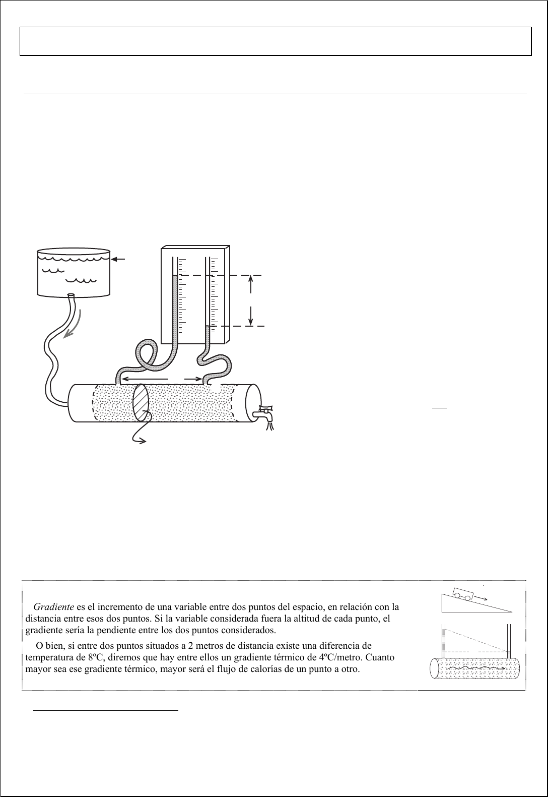 F. Javier Sánchez San Román--Dpto. Geología--Univ. Salamanca (España) http://hidrologia.usal.es Pág. 1 Ley de Darcy. Conductividad hidráulica Experiencia de Darcy El ingeniero Henry Darcy trabajó muchos años en el abastecimiento de agua a la ciudad francesa de Dijon1. Se interesó en el flujo del agua a través de los medios porosos porque se utilizaban filtros de arena para depurar el agua y por la observación de pozos que contribuían al abastecimiento de la ciudad. En 1856 presentó un voluminoso informe sobre el tema, que incluía un pequeño apéndice describiendo sus experimentos y la obtención de la ley. Ese pequeño anexo puede considerarse el nacimiento de la hidrogeología como ciencia, ha sido la base de todos los estudios físico-matemáticos posteriores sobre el flujo del agua subterránea. En los laboratorios actuales disponemos de aparatos muy similares al que utilizó Darcy, y que se denominan permeámetros de carga constante2 (Figura 1) Figura 1.- Permeámetro de carga constante. Q = Caudal h = Diferencia de Potencial entre A y B l = Distancia entre A y B Gradiente hidráulico= l h Básicamente un permeámetro es un recipiente de sección constante por el que se hace circular agua conectando a uno de sus extremos un depósito elevado de nivel constante. En el otro extremo se regula el caudal de salida mediante un grifo que en cada experimento mantiene el caudal también constante. Finalmente, se mide la altura de la columna de agua en varios puntos (como mínimo en dos, como en la Figura 1). Darcy repitió el experimento de la figura 1 con varios materiales porosos y cambiando las variables, y dedujo que el caudal que atravesaba el permeámetro era linealmente proporcional a la sección y al gradiente hidráulico. Y que la constante de proporcionalidad era característica de cada arena o material que llenaba el permeámetro. Gradiente es el incremento de una variable entre dos puntos del espacio, en relación con la distancia entre esos dos puntos. Si la variable considerada fuera la altitud de cada punto, el gradiente sería la pendiente entre los dos puntos considerados. O bien, si entre dos puntos situados a 2 metros de distancia existe una diferencia de temperatura de 8ºC, diremos que hay entre ellos un gradiente térmico de 4ºC/metro. Cuanto mayor sea ese gradiente térmico, mayor será el flujo de calorías de un punto a otro. 1 En 1830 dirigió la perforación de un sondeo que no se pudo utilizar porque se necesitaba que fuera surgente para utilizarlo sin bomba de extracción; en 1834 diseñó un acueducto de 13 km para abastecer a la ciudad. 2 En laboratorio, el permeámetro se sitúa verticalmente y con el flujo ascendente para facilitar la evacuación del aire contenido inicialmente en el material poroso. Aquí se presenta horizontal para emular la situación más común del flujo subterráneo. ������� � �� � ���� � � � �� � �� �� �� �� F. Javier Sánchez San Román--Dpto. Geología--Univ. Salamanca (España) http://hidrologia.usal.es Pág. 2 Es decir: variando el caudal con un grifo y/o moviendo el depósito elevado, los niveles del agua en los tubos varían. Podemos probar también con permeámetros de distintos diámetros y midiendo la altura de la columna de agua en puntos más o menos próximos (diferentes l). Pues bien: cambiando todas la variables, siempre que utilicemos la misma arena, se cumple que: l h SecciónKQ (1) Y el valor de K permanece constante siempre que utilicemos la misma arena. (Ver la figura 1 para el significado de las otras variables) Si utilizamos otra arena (más gruesa o fina, o mezcla de gruesa y fina, etc.) y jugando de nuevo con todas las variables, se vuelve a cumplir la ecuación anterior, pero la constante de proporcionalidad K es otra distinta. Darcy concluyó, por tanto, que esa constante era propia y característica de cada arena. Esta constante se llamó permeabilidad (K) aunque su denominación correcta actual es conductividad hidráulica. Como las unidades del caudal Q son L3/T, la sección es L2, e h e l son longitudes, se comprueba que las unidades de la permeabilidad (K) son las de una velocidad (L/T). La expresión correcta de la Ley de Darcy es la siguiente: dl dh Kq (2) donde: q = Q /sección (es decir: caudal que circula por m2 de sección) K = Conductividad hidráulica dh/dl = gradiente hidráulico expresado en incrementos infinitesimales El signo menos se debe a que el nivel disminuye en el sentido del flujo; es decir, que h o dh son negativos y el signo menos hace que el caudal sea positivo. Aplicando directamente la ley de Darcy se puede calcular la K, o conociendo el valor de K se puede calcular el caudal, como veremos en los ejemplos siguientes: Ejemplo 1.- En un permeámetro de laboratorio (como el mostrado en la figura 1) queremos medir la conductividad hidráulica de una arena. La sección del permeámetro es de 340 cm2 y la distancia entre las dos conexiones a los tubos piezométricos (l) es de 45 cm. El caudal de salida es de 2,7 litros/minuto y la diferencia de altura entre las dos columnas de agua (h) es de 68 cm. Calcular la conductividad hidráulica en metros/día. Solución: Aplicando la fórmula (1): 45 68 10003 1440 10 ,83 4-3- K [Caudal pasado de litros/minuto a m3/día (1 día tiene 1440 minutos), y sección pasada de cm2 a m2] Despejando: K = 120,7 m2/día Ejemplo 2.- Evaluar el caudal circulante a través de un aluvial encajado en rocas impermeables. K= 60 m/día. Entre los dos pozos A y B la diferencia de cota de los niveles freáticos es de 4,2 metros. El resto de los datos se indican en la figura: anchura media del aluvial: 80 metros; profundidad media del aluvial: 7 metros; profundidad media de la ��� ����� � � � � � � � � � ���� F. Javier Sánchez San Román--Dpto. Geología--Univ. Salamanca (España) http://hidrologia.usal.es Pág. 3 superficie freática: 2 metros Solución: G