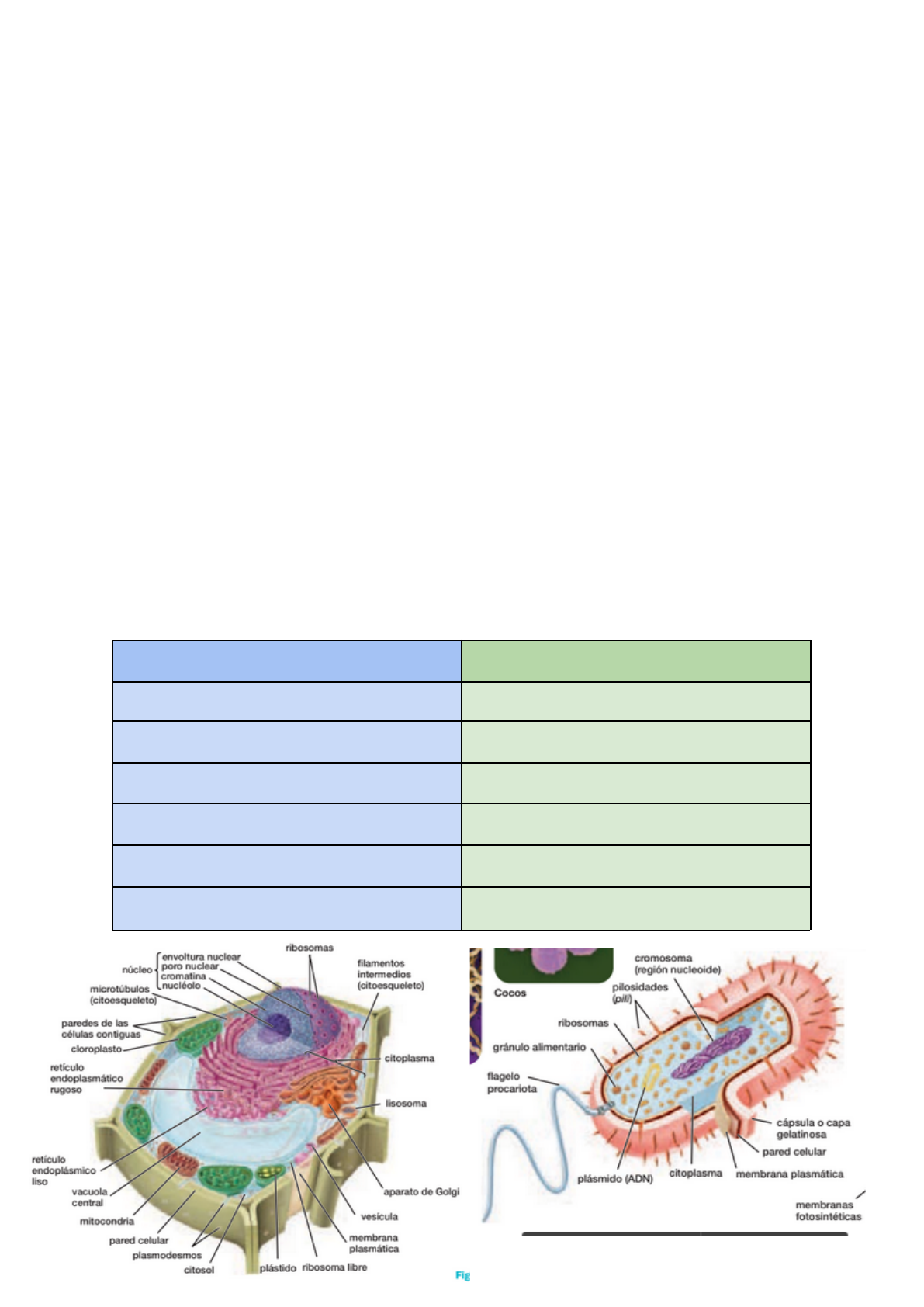 L� célul� Es la unidad fisiológica y anatómica que da origen a los seres vivos Citología = ciencia que estudia la célula 1.1 Característica� -Tienen funciones semejantes - Miden de 1 a 10 micras -Tiene membrana plasmática -Contiene citoplasma (aquí está el ADN ya sea en un núcleo o regado) 1.2 Teorí� celular - La célula es la unidad anatómica o estructural de los seres vivos - La célula es la unidad fisiológica o funcional de los seres vivos - Todo proviene de otra célula semejante preexistente 1.3 Teorí� d� l� end�imbiótic� La Teoría Endosimbiótica de Lynn Margulis, esta teoría describe el paso de las células procarióticas a células eucarióticas mediante incorporaciones simbióticas de bacterias. 1.4 �p� celulare� Célula eucariota (con núcleo) Célula procariota (sin núcleo) Eu = con Pro = antes de Son más complejas Son menos complejas Su ADN está en el núcleo Su ADN está regado en el citoplasma Se divide en animal y vegetal No tiene división Tiene organelos con membrana No tiene orgánulos con membrana Animales, plantas, etc Bacterias, hongos, arquea, etc Célula eucariota Animal Vegetal Autótrofos (no puede fabricar su propio alimento) Heterótrofo (puede fabricar su propio alimento) No tiene cloroplasto Tiene cloroplasto Tiene membrana celular Tiene pared celular Núcleo Tiene aparato de Goldi, Retículo endoplasmático, membrana, lisosoma 1.5 Característica� d� la� célula� Eucariota Procariota Miden de 10 a 100 micras Miden de 0.2 a 10 micras Su división celular es por mitosis y meiosis Carencia de membrana nuclear Las célula eucariota animal la mayoría con heterótrofa y respiración aerobia, y la vegetal son autótrofas y respiración aerobia Solo tiene un cromosoma circular cerrado Tiene citoesqueleto No realiza mitosis para la replicación de cromosomas El núcleo contiene cromosomas y nucleolos La cromatina se forma con el ADN y proteínas para formar cromosomas 1.6 Célul� Eucariot� (anima�) Sus partes fundamentales son: La membrana plasmática, núcleo y el citoplasma 1.6.1 Membran� plasmátic� -Engloba a la célula -Consta de una bicapa de fosfolípidos en la que se incrustan proteínas -Está sostenida por el citoesqueleto -Aisla, regula y permite la interacción -Permite intercambio de sustancias 1.6.2 Citoplasm� (Cit�o�+orgánul�) - Consta de compuestos químicos y organelos - Parte fluida = citosol - El citoesqueleto le da forma, sostén y movimiento 1.6.2.1 Cit�o� Líquido gelatinoso que contiene proteínas, electrolitos y glucos disuelto Orgánulos Reticulo endoplasmatico Aparato de Golgi Ribosoma Citoesqueleto Peroxisoma Lisosoma Mitocondria Centriolos 1.6.2.2 Retícul� endoplasmátic� - Es un conjunto de túbulos que enrollan y retuercen a través del citoplasma - Sintetiza múltiples sustancias en la célula - Son de 2 tipos: rugoso y liso Retícul� endoplasmátic� rug�s� Retícul� endoplasmátic� lis� Contiene ribosoma (ARN y proteínas) su función consiste en sintetizar nuevas moléculas proteicas en la célula No Contiene ribosoma y su función consiste en sintetizar sustancias lipídicas SINTETIZA PROTEÍNAS SINTETIZA LÍPIDOS 1.6.2.3 Aparat� d� Golg� - Forman y desprenden lisosomas (provenientes del aparato de golgi) - Empaqueta sustancias - Suele encontrarse cerca del núcleo - Su función importante es modificar y empaquetar proteínas (enviados desde el retículo endoplasmático rugoso) - A medida que las proteínas se acumulan se le llama vesículas de secreción viajan a la membrana plasmática - También empaqueta enzimas hidrolíticas en sacos llamados lisosomas que permanece en la célula 1.6.2.4 Lis�om� - Se desprenden del aparato de golgi - Son sacos membranoso que contiene enzimas digestivas tipos hidrófobas - Constituye el aparato digestivo intracelular que permite que la célula digiere; estructuras celulares dañadas, partículas que han ingerido, sustancias deseadas como bacterias - También tiene enzimas lisosomales que son capaces de digerir estructuras celular halladas o no utilizadas y la mayoría de la sustancias - Los lisosomas tiene abundante fagocitos que son células que se deshacen de las bacterias y células 1.6.2.5 Per�isoma� - Provienen del retículo endoplasmático liso y no del aparato de golgi - Contienen oxidas en lugar de hidrolasas - Su función es desintoxicar - Son sacos membranoso que contiene enzimas oxidadas para desintoxicar sustancias dañinas o venenosas - Su función principal es desarmar a los radicales libres (sustancias que son muy reactivas) en peróxido de hidrógeno (H202) - Los peroxisomas tiene células hepáticas y renales 1.6.2.6 Mitocondri� -También se lleva a cabo la síntesis de ATP -Mide de 5 a 7 micrómetros - ATP = almacena energía - Motor de la célula - Se encarga de la respiración celular - Apoptosis: muerte celular programada - Membrana externa = lisa - Espacio intermembranoso -En la matriz hay proteínas, enzimas, ácidos nucleicos, sales y electrolitos - La mitocondria representa gran parte del metabolismo ya que son los centros generadores de energía -Durante la apoptosis las mitocondrias liberan al citosol proteínas que participan en el proceso de manera decisiva - La membrana interna = no es lisa, tiene crestas mitocondriales - Matriz mitocondrial = todo el espacio interior (aquí sucede el ATP) - Fórmula de la respiración celular: - C6H12O6+O2 - CO2+H2O+ATP - Glucosa 1.6.2.7 Citoesquelet� - Formado por proteínas -Esqueleto interno de la célula - Otorga elasticidad - Interviene en la división celular Está formado por: Microtúbulos Microfilamentos Filamentos intermedios Participa en los movimientos de estructuras y organización interna de la célula Está constituido por actina y miosina Está formado por proteínas como queratina y desminas Miden 25 nm Miden 15 nm Miden de 8 a 12 nm 1.6.2.8 Centriol� - Solo esta en los animales - Crea microtubules - C