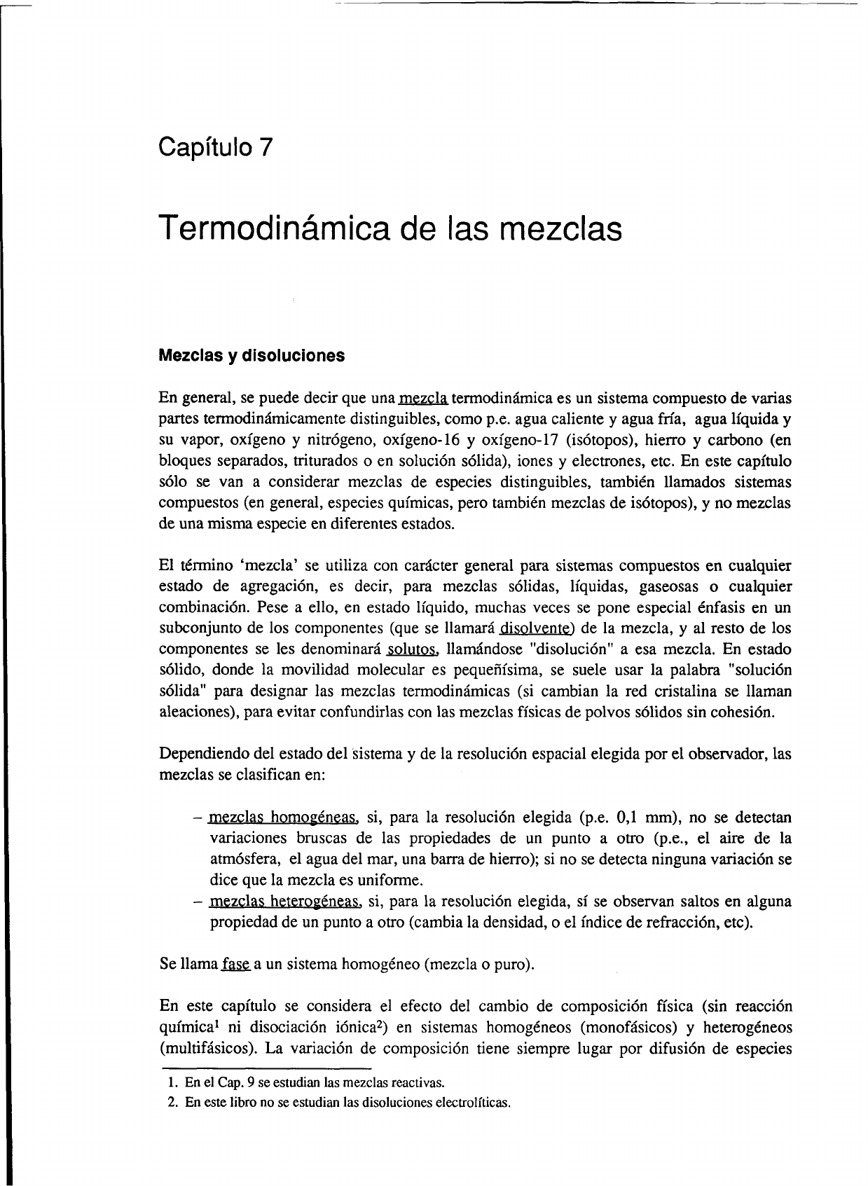 Capítulo 7 Termodinámica de las mezclas Mezclas y disoluciones En general, se puede decir que una mezcla termodinámica es un sistema compuesto de varias partes termodinámicamente distinguibles, como P.e. agua caliente y agua fría, agua líquida y su vapor, oxígeno y nitrógeno, oxígeno-16 y oxígeno-17 (isótopos), hierro y carbono (en bloques separados, triturados o en solución sólida), iones y electrones, etc. En este capítulo sólo se van a considerar mezclas de especies distinguibles, también llamados sistemas compuestos (en general, especies químicas, pero también mezclas de isótopos), y no mezclas de una misma especie en diferentes estados. El término 'mezcla' se utiliza con carácter general para sistemas compuestos en cualquier estado de agregación, es decir, para mezclas sólidas, líquidas, gaseosas o cualquier combinación. Pese a ello, en estado líquido, muchas veces se pone especial énfasis en un subconjunto de los componentes (que se llamará disolvente) de la mezcla, y al resto de los componentes se les denominará solutos, llamándose "disolución" a esa mezcla. En estado sólido, donde la movilidad molecular es pequeñísima, se suele usar la palabra "solución sólida" para designar las mezclas termodinámicas (si cambian la red cristalina se llaman aleaciones), para evitar confundirlas con las mezclas físicas de polvos sólidos sin cohesión. Dependiendo del estado del sistema y de la resolución espacial elegida por el observador, las mezclas se clasifican en: - mezclas homogéneas, si, para la resolución elegida (p.e. 0,l mm), no se detectan variaciones bruscas de las propiedades de un punto a otro (p.e., el aire de la atmósfera, el agua del mar, una barra de hierro); si no se detecta ninguna variación se dice que la mezcla es uniforme. - mezclas heterogéneas, si, para la resolución elegida, sí se observan saltos en alguna propiedad de un punto a otro (cambia la densidad, o el índice de refracción, etc). Se llama- a un sistema homogéneo (mezcla o puro). En este capítulo se considera el efecto del cambio de composición física (sin reacción química1 ni disociación iónica2) en sistemas homogéneos (monofásicos) y heterogéneos (multifásicos). La variación de composición tiene siempre lugar por difusión de especies 1. En el Cap. 9 se estudian las mezclas reactivas. 2. En este libro no se estudian las disoluciones electrolíticas. 144 l. Martínez: TERMODINAMICA BASICA Y APLICADA causada por gradientes en los potenciales químicos; en el Cap. 11 se ven algunos modelos de estos procesos de transporte, pero aquí sólo se consideran estados de equilibrio. A veces la composición no varía en un cierto proceso de un sistema y sin embargo se sigue utilizando la teoría de mezclas para simplificar, ya que muchas mezclas se comportan proporcionalmente a como lo hacen los componentes por separado, y así, bastan'a en estos casos conocer las propiedades de los compuestos puros para estudiar cualquier mezcla de ellos. Para aclarar ideas, consideremos las dos mezclas más corrientes: el aire y el agua. En la mayoría de las aplicaciones ingenieriles ninguna de ellas se estudia como mezcla sino como sistema monocomponente: aire puro y agua pura. Primero se especifica qué es aire puro y agua pura, P.e., aire puro es una sustancia gaseosa con una mezcla de 79% de partículas diatómicas de nitrógeno y un 21% de partículas diatómicas de oxígeno, y agua pura es agua destilada (que todavía es una mezcla de H20 y D20, siendo D el átomo de deuterio). Las sustancias de trabajo serán aire impuro (con vapor de agua, argón, dióxido de carbono, polvo, microorganismos, etc) y agua impura (con sales disueltas, gases disueltos, partículas en suspensión, microorganismos, etc), pero a efectos prácticos muchos procesos se describen perfectamente con el modelo de aire puro o de agua pura. Aún más; el comportamiento termodinámico de estas sustancias se suele aproximar por los sencillísimos modelos de gas perfecto y líquido perfecto, respectivamente, con lo que basta medir R y cp para una muestra de aire estándar y p y cp para una muestra de agua estándar. Pero con ese modelo tan sencillo no se pueden describir otros fenómenos de gran interés. Por ejemplo, los procesos de combustión (incluyendo la respiración aerobia), de tanto interés práctico, exigen consumir parte del oxígeno del aire y devolver a él vapor de agua, dióxido de carbono y algunos radicales. Al enfriarse el aire natural se condensa uno de sus componentes (el vapor de agua), y si se enfría mucho más y se llega a licuar el aire (aun el aire puro), ni el gas ni el líquido que coexisten tienen la composición inicial. La mayor proporción de agua del mundo es agua salada con cerca del 3% en peso de sales disueltas. El agua pura antes definida (agua destilada) apenas tiene interés en aplicaciones térmicas (ni siquiera es buena para beber). Todos los peces respiran oxígeno diatómico del aire disuelto (en fase líquida) en el agua (y no del oxígeno de la molécula de agua). La Termodinámica de las mezclas es necesaria para el estudio de los procesos: fraccionamiento, destilación, purificación, humidificación y saturación del aire, cambios de fase en mezclas, solubilidad, combustión, compresión y expansión de gases frescos y gases quemados, etc. Medida de la composición No se va a tratar aquí el problema de la medida experimental de composiciones, basada en la variación de alguna propiedad física, como los puntos de cambio de fase, la conductividad eléctrica, el índice de refracción, la velocidad de difusión a través de medios porosos (cromatografía), la inercia de los iones (hay que ionizar la muestra) en un campo electromagnético (espectrografía de masas), o bien basado en las reacciones químicas con ciertas sustancias caractensticas, o basado en la espectrometría de absorción, emisión o dispersión. Se trata aquí de definir las variables usad