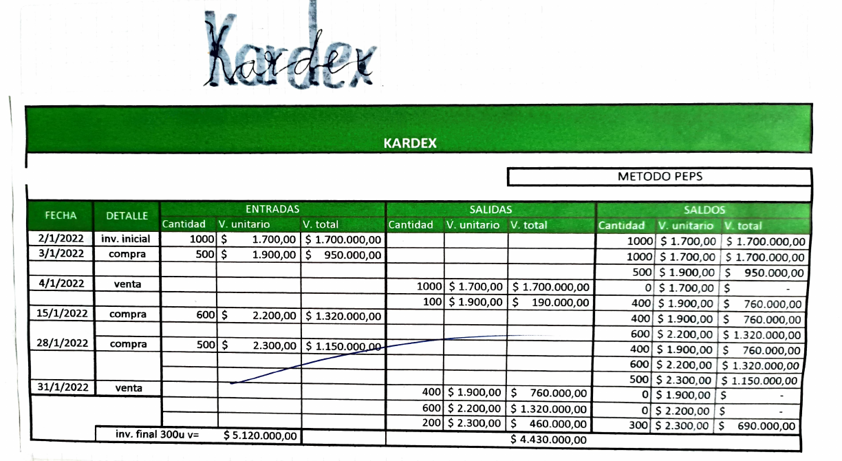 FECHA 2/1/2022 3/1/2022 4/1/2022 28/1/2022 DETALLE 31/1/2022 inv. inicial compra 15/1/2022 Compra venta Compra venta Kardex Cantidad iny. final 300u y= 1000 $ V. unitario 500 $ 600 $ ENTRADAS 500| $ V. total 1.700,00$ 1.700.000,00 1.900,00$ 950.000,00 2.200,00$ 1.320.000,00 2.300,00$ 1.150.000,_00 $5.120.000,00 KARDEX SALIDAS Cantidad V. unitario V. total 1000| $ 1.700,00$ 1.700.000,00 100| $ 1.900,00$ 190.000,00 400| $ 1.900,00 760.000,00 600| $ 2.200,00$ 1.320.000,00 200| $ 2.300,00$ 460.000,00 METODO PEPS SALDOS Cantidad V. unitario V.total 1000 $ 1.700,00$ 1.700.000,00 1000| $ 1.700,00$ 1.700.000,00 500 $ 1.900,00$ 950.000,00 o$1.700,00S 400 $ 1.900,00 $ 760.000,00 400| $ 1.900,00 $ 760.000,00 600| $ 2.200,00$ 1.320.000,00 400 $ 1.900,00s 760.000,00 600| $ 2.200,00 $1.320.000,00 O$ 2.200,00$ 300 $ 2.300,00$ 690.000,00 $ 4.430.000,00 500 $ 2.300,00S 1.150.000,00 O| $ 1.900,00 $