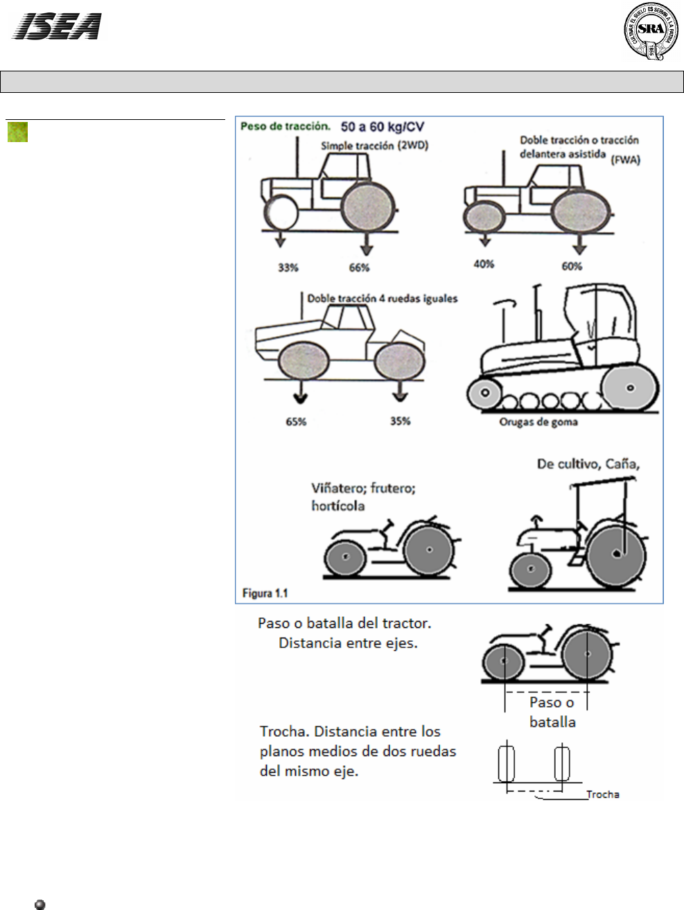 MÓDULO 1 TRACTOR Cómo elegirlo La compra de un tractor es una decisión racional que responde a factores técnico-económicos cuyo análisis previo puede ser agotador: elegir nuevo o usado, de alto o bajo precio, con gran equipamiento o estándar. Si se mira la oferta del mercado, las dudas se acrecentarán debido a la competencia existente en tecnología y precio entre una buena cantidad de empresas de primer nivel. En definitiva, el usuario debe ser un verdadero técnico para evaluar todos los datos disponibles ante la decisión de adquirir un tractor. Por ello, a manera de ayuda - y sin tener por objeto dar una receta que, por otra parte, sería poco práctica ya que cada caso en particular reúne una serie de connotaciones que lo diferencian - es que a continuación se sintetizan algunos aspectos a tener en cuenta antes de tomar la resolución final. Tipos de tractor Se aplican diferentes clasificaciones según convenga. Por su propulsión (simple tracción, doble tracción asistida, doble tracción, orugas). Por la potencia (grandes, medianos y chicos. Por la estructura (uso general, labranza y siembra, cultivo, viñatero, frutero. No olvidar al elegir: tener en cuenta en la elección al servicio técnico y el tractorista. 2 La elección del tractor se realiza luego de definir a la máquina que irá enganchada o su barra de tiro o acoplada al acople de tres puntos. La potencia dependerá del tamaño de la máquina, y del esfuerzo de tracción que demande. La toma de potencia responderá a las exigencias de la misma máquina. El sistema hidráulico responderá a las exigencias de la máquina. EL rodado del tractor responderá a las tareas a realizar con el equipo, lo mismo que el peso del tractor. Existe una tendencia generalizada a creer que el tractor es el primer componente a elegir al armar un equipo, cuando el verdad se lo elige luego de saber lo que se enganchará a él. Uso y mantenimiento Una forma de mejorar la rentabilidad es lograr una buena producción con menores costos, y para ello es fundamental conservar la capacidad de trabajo de los equipos mediante su correcto mantenimiento preventivo. Por lo contrario, la falta del mantenimiento necesario de la maquinaria ocasiona en el corto y mediano plazo reparaciones costosas, pérdida de tiempo irrecuperable en la ejecución de tareas impostergables, y desgaste prematuro. Frente a esta situación muchas veces no hay diferencia clara entre los costos de cambiar un tractor o repararlo a nuevo. A continuación pasaremos lista a una serie de recomendaciones prácticas cuyo objetivo es que su tractor trabaje más hectáreas durante más campañas sin problemas ni grandes reparaciones. Controles diarios Los controles diarios a realizar antes de poner en marcha el tractor son: 1. Verificar que el tanque de combustible haya sido llenado la noche anterior. 2. Si a la salida del tanque hay una llave de paso, constatar que esté abierta. 3. Controlar el nivel de aceite del cárter. Cuando el motor tiene un enfriador de aceite (radiador de aceite) es bueno ponerlo en marcha 1 o 2 minutos hasta que se llene dicho enfriador, detener el motor y luego medir el nivel de aceite. El tractor debe estar en posición horizontal. El nivel de aceite se encontrará entre el mínimo y el máximo de la varilla. Agregar aceite si hace falta. 4. Controlar la tensión de las correas, la presión de las cubiertas y el estado del filtro de aire. 5. Controlar el nivel de aceite del sistema hidráulico. Cada uno de estos controles los analizaremos con mayor detalle en próximas páginas. Cómo poner en marcha el tractor 1. Colocar las palancas de cambio de velocidad en punto muerto. 2. Colocar el acelerador de mano en la mitad de su recorrido. 3. Poner en contacto y soltar la llave o el pulsador tan pronto como haya arrancado el motor. 4. Luego de unos segundos colocar el acelerador para una menor velocidad. 5. Controlar que se apague la luz de presión de aceite del tablero, y si hay un manómetro con escala observar que se mantenga en valores normales. Caso contrario detener rápidamente el motor y recurrir a un taller autorizado. 6. Si el motor no arranca espere un minuto antes de repetir la operación, de manera de no agotar la batería rápidamente. 7. Poner el tractor en movimiento en seguida para que el motor alcance la temperatura de funcionamiento lo más pronto posible. Si se lo deja regulando en vacío demorará en alcanzar la temperatura de trabajo, lo cual resulta perjudicial para la vida del motor. Cómo parar el motor Para detener el motor luego de un tiempo prolongado de trabajo es conveniente desacelerarlo de a poco; en un primer momento llevar el acelerador de mano a un punto medio de su recorrido dejándolo en él 1 a 2 minutos. Luego colocarlo en otra posición menor de aceleración durante otro minuto, para finalmente detener el motor con el acelerador en mínima aceleración. La detención brusca aumentará la temperatura debido al corte de la circulación de agua o aire de enfriamiento. Esta recomendación es también válida para los motores sobrealimentados no sólo por las razones recién esgrimidas sino para evitar que el eje del turbocompresor continúe girando por inercia sin lubricación luego que el motor se detiene, con lo cual se acortaría sensiblemente la vida útil de aquél. Cómo asentar el motor 1. Debe trabajar entre 300 a 400 horas con a máquina más pesada al tiro que va a utilizar durante su vida útil, con la carga que operará corrientemente, con el acelerador a fondo, y la marcha inmediata inferior a la aplicada normalmente. 2. Se respetarán las indicaciones sobre cambios de aceite y filtro que figuren en el manual de uso. Sistemas de enfriamiento Los más difundidos hasta el momento para motores diesel son los sistemas de enfriamiento por agua y por aire. En ambos casos su misión es mantener la temperatura de funcionamiento dentro de los límites establecidos por el fabricante. Sin embargo, la falta de mante
