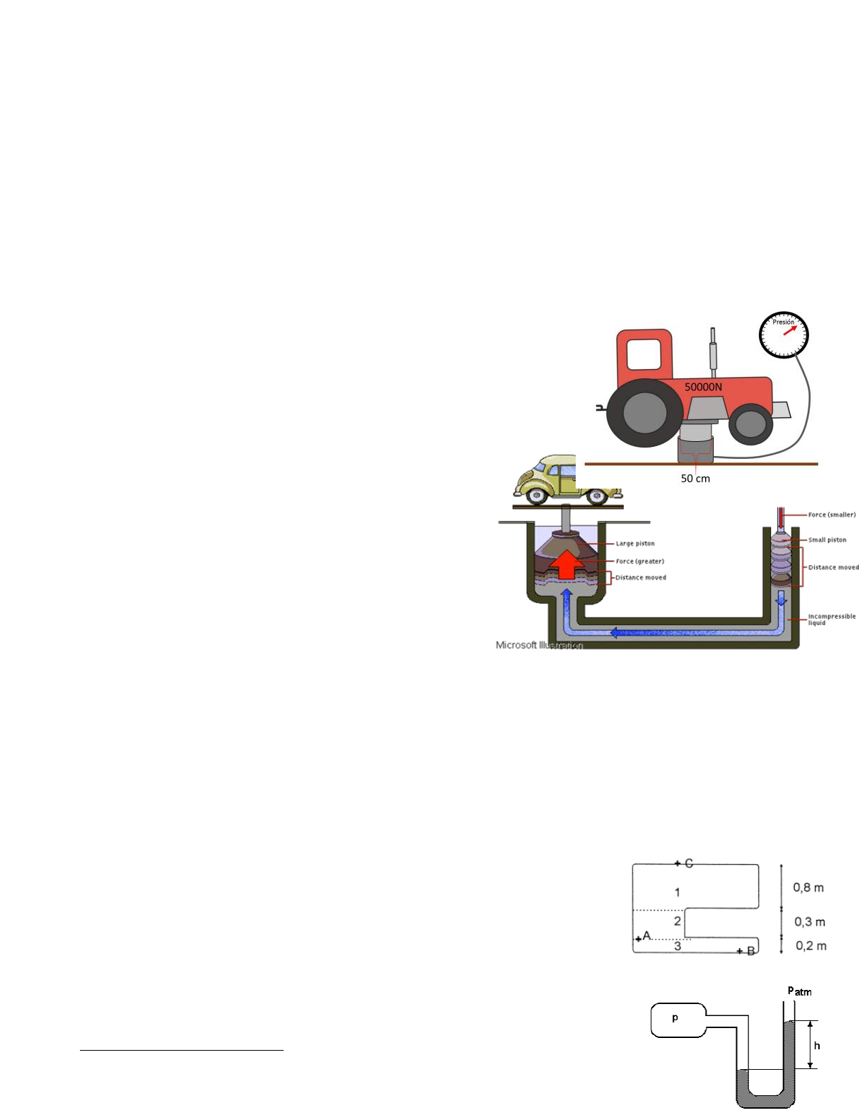 UNIVERSIDAD NACIONAL DE SALTA FISICA–FISICA GENERAL FACULTAD DE CIENCIAS NATURALES 2º Cuatrimestre Ing Agr e Ing en RNyMA Año: 2023 TRABAJO PRÁCTICO Nº 5: Hidrostática. Hidrodinámica Contenidos: .1.- Hidrostática. Fluidos. Densidad. Peso específico. 5.2.- Presión. Unidades 5.2.1 Principio de Pascal. Prensa hidráulica. 5.2.2 Presión atmosférica. Barómetro y manómetro. 5.2.2 Presión en el interior de un fluido en reposo. Presión absoluta. Presión manométrica. 5.2.3 El principio de Arquímedes. Condiciones para que un cuerpo flote, se hunda o esté “entre aguas” 5.2.4 Fenómenos de superficie: Tensión Superficial. Capilaridad. Ley de Jurin.. Tensiómetros. El ascenso de la savia en los árboles. 5.3. Hidrodinámica. 5.3.1 Fluido y flujo ideal. Flujo laminar. Régimen estacionario. Ecuación de continuidad. Caudal. 5.3.2 El teorema de Bernoulli. Condiciones de aplicación. Resultado de Torricelli. Efecto Venturi. Aplicaciones. 5.3.3 Fluidos reales. Viscosidad. Coeficiente de viscosidad. Unidades. Flujo turbulento. Número de Reynolds. 5.3.4 Ley de Pouseville. 5.3.5 Ley de Stokes. Velocidad límite. Aplicaciones. 5.3.6 Ley de Darcy. Problema 1: tractor de 50000 N está apoyado sobre un pistón elevador de diámetro 50,0 cm. a- Calcular la presión sobre la superficie del pistón que hace el tractor. b- Analizar qué pasa con la presión si se disminuye el diámetro a: d1= 25,0 cm; d2=10,0 cm; d3=5,00 cm Problema 2 1 : Se muestra –en forma simplificada- un elevador de automóviles. El pistón pequeño tiene una sección transversal circular y un radio de 5,00 cm. El pistón más grande tiene un radio de 15,0 cm. a- ¿Qué fuerza se debe ejercer para elevar un automóvil que pesa 13,300 N? b- ¿Qué presión se ejerce sobre el pistón mayor? c- Si el pistón pequeño desciende 5,00 cm, ¿cuánto asciende el émbolo con mayor superficie? Problema 3: a) Con una presión atmosférica 1015 hPa en Salta (de fecha 20/05/21), ¿qué altura alcanzará la columna de líquido si Torricelli hubiera decidido realizar su experimento con agua en lugar de mercurio? b) Qué altura alcanzaría una columna de agua para medir una presión atmosférica normal ¿Cómo hace una secuoya de 100 metros de altura para que suba el agua? Problema 4: A) a) Calcular la presión manométrica en la profundidad de 90,0 m, la mayor, del Dique Cabra Corral, suponiendo que la densidad del agua es de 1,00 g/cm 3. b) Calcular la presión absoluta a la misma profundidad c) Un buzo de la Policía lacustre puede sumergirse hasta los 30,0 m de profundidad ¿qué presión soporta? B) En la figura se muestra la sección de un recipiente abierto que contiene tres líquidos diferentes. Calcula la presión hidrostática en los puntos A, B y C: Líquido 1: δ1 = 0,89 g/cm 3 Líquido 2: δ2 = 0,92 g/cm 3 Líquido 3: δ3 = 1,26 g/cm 3 Problema 5: El líquido de un manómetro de tubo abierto es mercurio, está conectado a un recipiente que contiene un gas. Las alturas de sus ramas son 3,00 cm y 8,00 cm, siendo la rama abierta la de mayor altura. 1 Guía de problemas 2020 UNIVERSIDAD NACIONAL DE SALTA FISICA–FISICA GENERAL FACULTAD DE CIENCIAS NATURALES 2º Cuatrimestre Ing Agr e Ing en RNyMA Año: 2023 TRABAJO PRÁCTICO Nº 5: Hidrostática. Hidrodinámica a) ¿Cuál es la presión manométrica del gas? c) ¿Cuánto vale la presión absoluta del gas Problema 6 2 : Cuando una corona con una masa de 14,7 kg se sumerge en agua, un dinamómetro marca una masa de 13,4 kg. a) ¿Es dicha corona de oro? Problema 7 1 : Una estatua antigua de 7,00 kg se encuentra en el fondo del mar. Su volumen es de 3,00 x 10 4 cm 3 . ¿Qué fuerza se necesita para levantarla? Problema 8 2 : La pata de un insecto parado en el agua forma una depresión de radio r =2,00 mm y ángulo Ɵ = 40,0 º. a- ¿Cuánto peso soporta esta depresión? b- ¿Cuál es la masa del insecto, suponiendo que está siendo sostenido por igual sobre las seis patas? Problema 9 2 : Los elementos nutrientes de las plantas ascienden por ellas a través de unos tubos delgados denominados xilemas. Cada tubo tiene un radio de 0,0100 mm aproximadamente. ¿A qué altura se elevará el agua en estos tubos por acción capilar, suponiendo nulo el ángulo de contacto? Problema 10 2 : Una manguera de 2 cm de diámetro por la que fluye agua a una velocidad de 3,00 m/s. a) La manguera termina en un pico con un diámetro de 4,00 mm. ¿A qué velocidad sale el agua de la manguera? b) Y si termina en termina en un tubo cerrado que tiene 50 orificios pequeños de 0,2 cm de diámetro. ¿Cuál es la velocidad de salida del agua en cada agujero? c) Determine el caudal de salida ¿cambia en a y b? Problema11 2 : Un sistema de riego de un campo descarga agua de un tubo A horizontal a razón de 7200 cm 3 /s. En un punto de un tubo donde el radio es de 4,00 cm, la presión absoluta del agua es 2,4 x 105 Pa. En un segundo punto del tubo, el agua pasa por una constricción cuyo radio es de 2,00 cm. ¿Qué presión absoluta tiene el agua al fluir por ese sector? Problema 12 1 : El suministro de agua de un edificio se alimenta por medio de una tubería principal de 6,0 cm de diámetro. Se observa que de una llave de agua con un diámetro de 2,00 cm que se localiza a 2,00 m por encima de la tubería principal, se llena una cubeta de 25,0 litros en 30,0 s. a) ¿Cuál es la rapidez con la que sale el agua de la llave? b) ¿Cuál es la presión en la tubería principal de 6,00 cm? (Suponga que esa llave es el único lugar donde está saliendo agua en ese momento en el edificio) Problema13: Por medio de algunas medidas, se concluye que una fuerza de fricción de 50,0 N actúa en cada metro cuadrado de superficie de un rio, en sentido contrario al de su flujo, que tiene una velocidad de 10,0 𝑚/𝑠. Considerando que el agua en el fondo del río permanece en reposo en relación al lecho y que la profundidad del río es de 5,00 𝑚, calcule el coeficiente de viscosidad del río. Problema14: Determinar