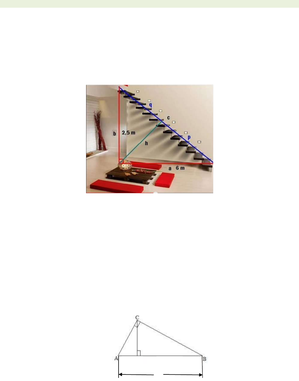 Proyecto Guao 1 TEOREMA DE EUCLIDES. INTRODUCIIÓN. Euclides (330 a.C. - 275 a.C.) Gran matemático griego, escribió una serie de libros donde sintetizaba todos los conocimientos matemáticos conocidos hasta entonces. Euclides fue autor de diversos tratados, pero su nombre se asocia principalmente a uno de ellos, los Elementos, que rivaliza por su difusión con las obras más famosas de la literatura universal, como la Biblia o el Quijote. Se trata, en esencia, de una compilación de obras de autores anteriores (entre los que destaca Hipócrates de Quíos), que las superó de inmediato por su plan general y la magnitud de su propósito. ¿PERO CÓMO USAR SU TEOREMA EN LA COTIDIANIDAD? En una simple escalera donde b= 2,5 m y a= 6 m. ¿Cuál sería el valor de p,q, h y c? TEOREMA DE EUCLIDES El teorema de Euclides se interpreta geométricamente diciendo que: “El cuadrado construido sobre un cateto de un triángulo rectángulo, tiene igual área que el rectángulo cuyos lados son la hipotenusa del triángulo y la proyección del cateto sobre la hipotenusa”. Del teorema de Euclides podemos destacar dos teoremas: Teorema de la altura y Teorema del cateto: Teorema de la altura: En un triángulo rectángulo obtenemos dos relaciones alternativas en los que intervienen los siguientes elementos: los catetos b y c, la hipotenusa a, la altura h y las proyecciones m y n de los catetos sobre la hipotenusa como se ilustra en la figura1. b h m n a c Figura1 Proyecto Guao 2 En un triángulo rectángulo el cuadrado de la altura sobre la hipotenusa es igual al producto de las proyecciones de los catetos sobre la hipotenusa, así el teorema de la altura viene dado por: Teorema del cateto: Ahora vamos a obtener la relación entre los catetos y sus proyecciones sobre la hipotenusa. En un triángulo rectángulo, el cuadrado de la longitud de un cateto es igual al producto de la longitud de la hipotenusa por la longitud de la proyección del cateto sobre la hipotenusa. Según la figura 1 Para el cateto c: Para el cateto b: EJEMPLO 1: Con los datos de la figura calcular la altura AD sabiendo que el triángulo ABC es rectángulo en A. A B n m C 1,6 m 2,5m Respuesta: La altura sobre la hipotenusa en función de las proyecciones de los catetos viene dada de acuerdo con el teorema de altura como: Sustituyendo los valores tenemos: . EJEMPLO 2: En un triángulo rectángulo los catetos miden 6 cm y 8 cm. Calcular la hipotenusa y las proyecciones de los catetos sobre la hipotenusa. h Proyecto Guao 3 Respuesta: b= 8 cm ; c= 6 cm; a=? , m= ? , n= ? Calculamos la hipotenusa por el teorema de Pitágoras Calculamos las proyecciones de los catetos sobre la hipotenusa por el teorema del cateto: Despejamos m Despejamos n A B c n m b= 8 cm 6 cm Proyecto Guao 4 EJERCICIOS RESUELTOS 1. De acuerdo con los datos indicados en la figura, el área sombreada es: a) P.q b) Bc c) a2 d) b2 e) Respuesta: En el área del rectángulo se obtiene con el producto de las medidas de dos lados contiguos. En este caso: a= c.q Pero c.q= b2 (Por teorema de Euclides referido al cateto b) Por lo tanto; la respuesta correcta es la alternativa D 2. Figura 1 Considere que en el triángulo que se muestra en la figura 1 la altura con respecto a la hipotenusa tiene un valor de 10 cm, y el segmento q tiene un valor de 5 cm, obtenga el valor del segmento p. Respuesta: Para la resolución de este problema se usará el teorema de Euclides referido a la altura que nos dice que: por lo tanto reemplazando los valores otorgados por el problema se tiene que: desarrollando la potencia y despejando “p” se tiene que 3. Considere que en el triángulo de la Figura 1 el cateto a mide 4 cm y la hipotenusa c mide 5cm, calcule la proyección del cateto sobre la hipotenusa. Respuesta: Para resolver este problema se usará el “Teorema de Euclides referido a los catetos” el cual nos dice que: reemplazando con los valores otorgados por el problema se tiene que : Proyecto Guao 5 desarrollando la potencia y luego despejando “p” se tiene que : 4. Considere que en el triángulo de la figura 1 el valor de “q” es 1,8 cm y el valor de la hipotenusa “c” es de 5 cm. calcule el valor del cateto “b”. Respuesta: Para resolver este problema se usará el “Teorema de Euclides referido a los catetos” el cual nos dice que : reemplazando con los valores otorgados por el problema se tiene que: 5. El canopy es uno de los deportes de aventura más difundidos en los últimos tiempos. Básicamente consiste en lanzarse por un cable, atado a grandes distancias y diferentes alturas, mediante una polea y un arnés sostenido a ella. Pues bien, supongamos que tenemos una situación problema en una instalación de este deporte y que se puede representar en la siguiente figura: ¿Cuánto desplazarse la polea para que la distancia entre D y C sea la menor posible? Respuesta: Para que CD sea lo menor posible, debe ser perpendicular a AB, luego nuestro problema es determinar la longitud del segmento BD. Como el triángulo ABC es rectángulo en C podemos aplicar el teorema de euclides: m Por lo tanto; la polea debe desplazarse 5,4 m para encontrarse a la misma distancia de la base de C. 6. El triángulo ABC es rectángulo en C, CD es perpendicular a AB, CD= , ces la medida de AB es igual a: a) 12 Respuesta: Proyecto Guao 6 b) 10 c) 7 d) 5 e) 2 Por el teorema de Euclides: 2 (x+7) (x-5) = 0 X=5 y x=-7 La raíz negativa no vale AB= AD + DB= (x+5) + (x – 3) = 5+ 5 + 5 – 3 = 15 – 3 = 12 La respuesta es la letra a). 7. Tenemos un triángulo rectángulo de forma que la altura relativa a la hipotenusa determina sobre segmentos de longitudes 1,8 cm y 3,2 cm. Halla a) La longitud de la altura correspondiente a la hipotenusa. b) La longitud de los catetos. Respuesta: Recordamos el teorema de la altura En nuestro caso = 5,76 El valor de la hipotenusa sería: a= m+n = 1,8 + 3,2 a= 5 cm Para hallar los catetos usaremos el teorema del cateto: A B C D X+ 5 X+ 3 Proyecto Guao 7 cm 8. En el tri