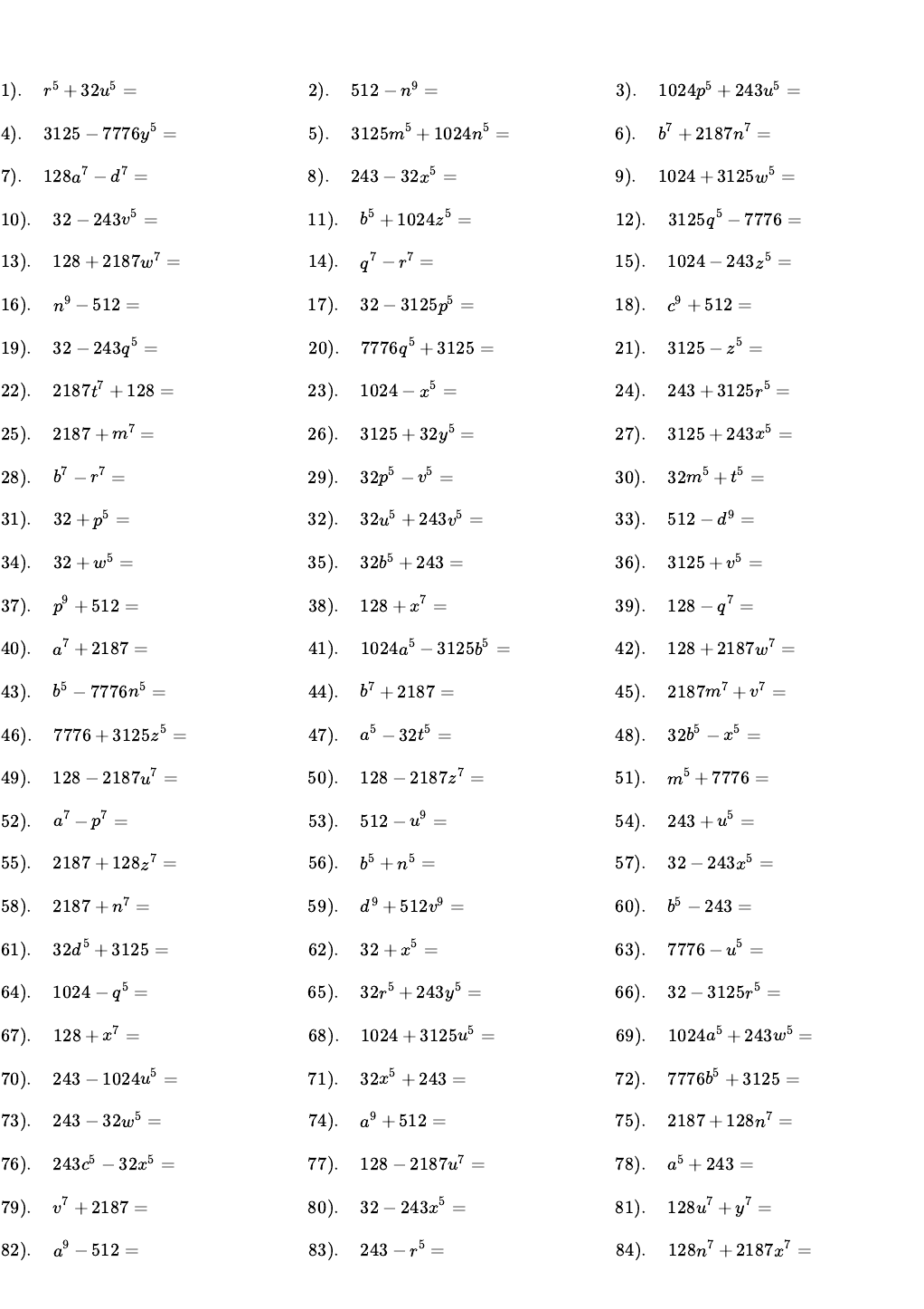 Suma o Diferencia de Potencias Iguales Factorizar: 1). + 32 =r5 u5 2). 512 − =n9 3). 1024 + 243 =p5 u5 4). 3125 − 7776 =y5 5). 3125 + 1024 =m5 n5 6). + 2187 =b7 n7 7). 128 − =a7 d7 8). 243 − 32 =x5 9). 1024 + 3125 =w5 10). 32 − 243 =v5 11). + 1024 =b5 z5 12). 3125 − 7776 =q5 13). 128 + 2187 =w7 14). − =q7 r7 15). 1024 − 243 =z5 16). − 512 =n9 17). 32 − 3125 =p5 18). + 512 =c9 19). 32 − 243 =q5 20). 7776 + 3125 =q5 21). 3125 − =z5 22). 2187 + 128 =t7 23). 1024 − =x5 24). 243 + 3125 =r5 25). 2187 + =m7 26). 3125 + 32 =y5 27). 3125 + 243 =x5 28). − =b7 r7 29). 32 − =p5 v5 30). 32 + =m5 t5 31). 32 + =p5 32). 32 + 243 =u5 v5 33). 512 − =d9 34). 32 + =w5 35). 32 + 243 =b5 36). 3125 + =v5 37). + 512 =p9 38). 128 + =x7 39). 128 − =q7 40). + 2187 =a7 41). 1024 − 3125 =a5 b5 42). 128 + 2187 =w7 43). − 7776 =b5 n5 44). + 2187 =b7 45). 2187 + =m7 v7 46). 7776 + 3125 =z5 47). − 32 =a5 t5 48). 32 − =b5 x5 49). 128 − 2187 =u7 50). 128 − 2187 =z7 51). + 7776 =m5 52). − =a7 p7 53). 512 − =u9 54). 243 + =u5 55). 2187 + 128 =z7 56). + =b5 n5 57). 32 − 243 =x5 58). 2187 + =n7 59). + 512 =d9 v9 60). − 243 =b5 61). 32 + 3125 =d5 62). 32 + =x5 63). 7776 − =u5 64). 1024 − =q5 65). 32 + 243 =r5 y5 66). 32 − 3125 =r5 67). 128 + =x7 68). 1024 + 3125 =u5 69). 1024 + 243 =a5 w5 70). 243 − 1024 =u5 71). 32 + 243 =x5 72). 7776 + 3125 =b5 73). 243 − 32 =w5 74). + 512 =a9 75). 2187 + 128 =n7 76). 243 − 32 =c5 x5 77). 128 − 2187 =u7 78). + 243 =a5 79). + 2187 =v7 80). 32 − 243 =x5 81). 128 + =u7 y7 82). − 512 =a9 83). 243 − =r5 84). 128 + 2187 =n7 x7 85). 512 + =x9 86). 3125 − 1024 =u5 87). 2187 + 128 =t7 88). 2187 − 128 =q7 89). 128 + =x7 90). 243 + 32 =m5 91). 2187 + 128 =d7 92). 3125 − 32 =y5 93). 128 + 2187 =a7 94). 32 + 243 =v5 x5 95). 32 + 243 =u5 96). 243 + =r5 z5 97). 3125 + 243 =q5 98). 243 − 32 =v5 99). 243 + =z5 100). 128 + 2187 =n7 101). 128 + 2187 =c7 102). + 512 =c9 103). 128 − 2187 =q7 104). + 512 =a9 105). 243 + 1024 =w5 106). 32 + 243 =c5 t5 107). + 512 =a9 108). 1024 − =p5 r5 109). 3125 − 243 =p5 110). 3125 − =c5 x5 111). 3125 + 7776 =b5 112). 2187 − 128 =x7 113). + =m9 z9 114). 1024 − 3125 =v5 115). 3125 − 32 =b5 x5 116). + 2187 =b7 x7 117). 512 + =u9 118). 2187 + =x7 119). − 3125 =p5 120). 2187 − =c7 121). 3125 + =b5 q5 122). 32 + =z5 123). + 128 =u7 124). − 512 =p9 w9 125). 243 + 32 =t5 126). − =m9 p9 127). 3125 − 32 =t5 128). 243 + =y5 129). 32 − =w5 130). 32 − 243 =t5 131). 1024 + =x5 132). 2187 − 128 =b7 133). − 243 =t5 u5 134). + =d9 v9 135). 1024 − 3125 =q5 136). 2187 + 128 =z7 137). 128 + =y7 138). 243 − 3125 =x5 139). 3125 + 32 =m5 140). 3125 − 7776 =x5 141). 32 − 3125 =y5 142). + =a9 d9 143). 3125 + =z5 144). − =v5 y5 145). 2187 + 128 =m7 146). − 3125 =b5 147). − 243 =c5 t5 148). 243 + 32 =y5 149). − =c5 n5 150). 243 − 1024 =z5 151). 7776 − 3125 =u5 152). 3125 − 32 =c5 153). − =b9 c9 154). + 32 =a5 155). 128 + =b7 156). 3125 − 32 =t5 157). 2187 − 128 =v7 158). 512 − =t9 159). 3125 + 243 =a5 r5 160). 32 − 3125 =v5 161). 2187 − 128 =v7 162). 128 − =u7 163). + 512 =c9 164). − 128 =b7 u7 165). + =a9 v9 166). 243 + =q5 167). 128 + 2187 =y7 168). 3125 + 243 =d5 n5 169). 243 − 1024 =t5 170). 1024 − 3125 =p5 u5 171). 243 − =q5 172). 3125 + =z5 173). − 32 =a5 174). 512 + =m9 175). 32 + 243 =q5 176). 3125 − 243 =n5 u5 177). 2187 + =v7 178). 3125 − =z5 179). 512 + =w9 180). 512 + =t9 181). − 32 =b5 p5 182). 3125 + =c5 183). − =t9 u9 184). + 512 =p9 185). 32 + =x5 186). 32 − 3125 =b5 d5 187). 512 + =u9 188). 243 + 3125 =q5 189). 1024 + =v5 190). 128 + 2187 =r7 191). 128 + =v7 192). 32 + =u5 193). 2187 + 128 =x7 194). − =w9 z9 195). 512 − =u9 196). 128 − 2187 =a7 c7 197). 32 + 243 =n5 198). + 3125 =p5 199). 3125 + 32 =r5 200). 3125 − 1024 =z5 201). 1024 + 243 =m5 u5 202). − 32 =b5 203). 243 − 32 =y5 204). 3125 − 243 =v5 205). 2187 + =v7 y7 206). − 512 =n9 z9 207). + =c7 t7 208). 243 − =x5 y5 209). − 3125 =a5 210). − 243 =n5 t5 211). − 2187 =c7 212). − 2187 =d7 x7 213). 32 − =d5 n5 214). 2187 − =z7 215). 2187 + =w7 216). 1024 − 3125 =v5 217). 2187 + 128 =d7 218). 32 + 243 =t5 219). 2187 + 128 =b7 220). 512 + =q9 221). + 512 =c9 222). 243 − 1024 =t5 223). 243 − 32 =u5 224). 2187 − 128 =t7 225). + 32 =m5 t5 226). 2187 + 128 =q7 227). 243 + 3125 =c5 228). + 512 =p9 229). 32 + =v5 230). 1024 + =n5 q5 231). 1024 − 3125 =d5 232). 3125 + 7776 =q5 x5 233). − =t9 w9 234). 1024 − =q5 x5 235). + 2187 =c7 236). 243 − 3125 =v5 237). 3125 + =z5 238). 243 + 32 =a5 239). 32 − 243 =b5 240). 32 − 243 =m5 241). 32 − 243 =r5 y5 242). + 32 =t5 w5 243). 512 + =p9 v9 244). + 2187 =a7 245). 32 − 3125 =m5 246). 1024 − =y5 247). 128 − 2187 =a7 t7 248). 128 − 2187 =n7 w7 249). 128 − 2187 =v7 250). − 512 =b9 251). + 512 =d9 252). 243 − 3125 =p5 253). 32 − 243 =y5 254). − 128 =b7 255). 32 + 3125 =y5 256). + =a7 d7 257). 128 + =d7 258). 512 − =u9 259). 128 − 2187 =d7 260). 2187 + 128 =z7 261). 2187 + 128 =p7 262). 1024 − 243 =p5 263). 128 + 2187 =y7 264). 128 + =z7 265). 128 + 2187 =y7 266). 2187 + 128 =c7 267). 3125 − 7776 =d5 268). 512 − =n9 269). 1024 + 3125 =y5 270). − 512 =x9 271). 1024 − =n5 272). 128 + 2187 =u7 273). + =n9 x9 274). 1024 − 243 =y5 275). − 2187 =n7 276). 512 − =z9 277). + 128 =n7 278). 2187 − 128 =p7 279). 3125 + 7776 =u5 280). 128 + 2187 =m7 281). 243 − 3125 =q5 r5 282). 128 − =q7 283). + =d9 m9 284). + 243 =q5 285). − 1024 =t5 286). 243 + 32 =b5 x5 287). 128 − =y7 288). − 32 =x5 289). 2187 + 128 =x7 290). 7776 − =y5 291). 2187 − 128 =m7 292). − 32 =p5 z5 293). 128 − 2187 =w7 294). 128 + 2187 =p7 295). 243 − 1024 =n5 296). 243 + 3125 =m5 297). 7776 − 3125 =t5 298). 3125 + 32 =d5 299). 32 + 243 =z5 300). − 3125 =b5 301). 243 + 3125 =a5 u5 302). 243 − 1024 =u5 303). 32 − 243 =w5 304). 32 − =x5 305). 32 + 243 =z5 306). 7776 − 3