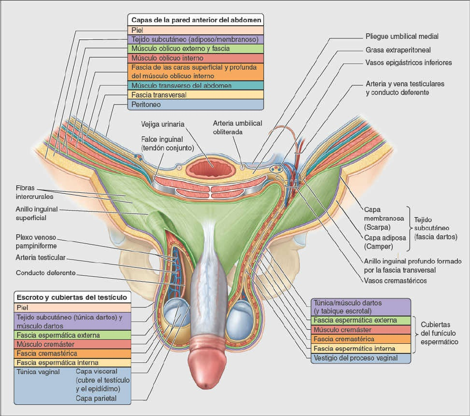 TESTÍCULOS Los testículos son órganos ovoides, que están suspendidos en el escroto por los funículos espermáticos (tabla 5-4). Producen espermatozoides y hormonas, principalmente testosterona. Los espermatozoides se forman en los túbulos seminíferos, que se unen mediante túbulos seminíferos rectos a la red testicular. Los testículos tienen una superficie externa resistente, la túnica albugínea, que forma una cresta en su cara posterior interna, el mediastino testicular. La túnica vaginal es un saco peritoneal cerrado que rodea el testículo (fig. 5-11). 529 https://booksmedicos.org https://booksmedicos.org FIGURA 5-11. Estructura de los testículos y el epidídimo. A) Túnica vaginal abierta. B) Contenido de la porción distal del funículo espermático, características del epidídimo y estructura interna de los testículos. La superficie de cada testículo está cubierta por la capa visceral de la túnica vaginal, excepto donde el testículo se adhiere al epidídimo y al funículo espermático. La capa visceral de la túnica vaginal, una membrana serosa transparente y brillante, está íntimamente unida al testículo, el epidídimo y la porción inferior del conducto deferente. La capa parietal de la túnica vaginal está adyacente a la fascia espermática interna. Una pequeña cantidad de líquido en la cavidad de la túnica vaginal que separa las capas visceral y parietal permite que el testículo se mueva libremente en el escroto. Las arterias testiculares se originan en la aorta abdominal (a nivel de la formación gonadal fetal, a la altura vertebral L2), justo inferiores a las arterias renales (fig. 5-12). Las arterias testiculares, largas y finas, discurren retroperitonealmente (posteriores al peritoneo), en dirección oblicua, cruzando sobre los uréteres y la porción inferior de las arterias ilíacas externas. Atraviesan los conductos inguinales, formando parte del funículo espermático, para irrigar los testículos. Las venas testiculares, que emergen del testículo y el epidídimo, forman el plexo venoso pampiniforme, constituido por 8-12 venas anastomosadas que se sitúan anteriores al conducto deferente y rodean la arteria testicular en el funículo espermático (fig. 5-11 A). El plexo pampiniforme forma parte del sistema termorregulador del testículo, que ayuda a mantener constante la 530 https://booksmedicos.org https://booksmedicos.org temperatura de esta glándula. La vena testicular izquierda se origina por la confluencia de las venas del plexo pampiniforme y drena en la vena renal izquierda. La vena testicular derecha tiene un origen y recorrido similares, pero desemboca en la VCI. El drenaje linfático del testículo acompaña a la arteria y la vena testiculares hasta los nódulos linfáticos lumbares derechos e izquierdos (de la vena cavaaórticos) y preaórticos (fig. 5-13). Los nervios autónomos del testículo proceden del plexo nervioso testicular situado en la arteria testicular, que contiene fibras aferentes viscerales y simpáticas del segmento T10 (T11) de la médula espinal. EPIDÍDIMO El epidídimo es una estructura alargada, situada en la cara posterior del testículo, formada por sinuosidades diminutas del conducto del epidídimo tan compactadas que tienen un aspecto sólido (fig. 5-12). Los conductillos eferentes transportan los espermatozoides recién formados desde la red testicular hacia el epidídimo, donde se almacenan hasta que maduran. La red testicular es una red de conductos que se encuentra en la terminación de los túbulos seminíferos. FIGURA 5-12. Inervación, suministro de sangre y drenaje linfático del escroto, 531 https://booksmedicos.org https://booksmedicos.org testículos y funículo espermático. Las flechas señalan la dirección del flujo de la linfa hacia los nódulos linfáticos. El epidídimo está formado por: Cabeza: la porción superior ensanchada, compuesta por lobulillos formados por los extremos enrollados de 12-14 conductillos eferentes. Cuerpo: el conducto sinuoso del epidídimo. Cola: se continúa con el conducto deferente, que transporta los espermatozoides desde el epidídimo al conducto eyaculador para su expulsión en la porción prostática de la uretra (v. cap. 6). ESCROTO El escroto es un saco cutáneo formado por dos capas: piel muy pigmentada y la túnica dartos, estrechamente relacionada con ella, una capa de fascia sin grasa que incluye fibras de músculo liso (músculo dartos) responsables del aspecto rugoso del escroto (tabla 5-4). Dado que el músculo dartos se fija a la piel, su contracción hace que el escroto se arrugue cuando hace frío, lo que engrosa la capa tegumentaria, reduce la superficie escrotal y ayuda al cremáster a mantener los testículos más cerca del cuerpo, con lo cual disminuye la pérdida de calor. Las venas escrotales acompañan a las arterias. Los vasos linfáticos drenan en los nódulos linfáticos inguinales superficiales. La irrigación arterial del escroto (fig. 5-12) procede de: Las ramas escrotales posteriores de la arteria perineal, una rama de la arteria pudenda interna. Las ramas escrotales anteriores de la arteria pudenda externa profunda, una rama de la arteria femoral. La arteria cremastérica, una rama de la arteria epigástrica inferior. Los nervios del escroto incluyen (fig. 5-12): El ramo genital del nervio genitofemoral (L1, L2), que inerva la cara anterolateral. Los nervios escrotales anteriores, ramos del nervio ilioinguinal (L1), que inervan la cara anterior. Los nervios escrotales posteriores, ramos del ramo perineal del nervio pudendo (S2-S4), que inervan la cara posterior. Los ramos perineales del nervio cutáneo femoral posterior (S2, S3), que inervan la cara inferior. C U A D R O C L Í N I C O 532 https://booksmedicos.org https://booksmedicos.org TESTÍCULOS Los testículos son órganos ovoides, que están suspendidos en el escroto por los funículos espermáticos (tabla 5-4). Producen espermatozoides y hormonas, principalmente testoster