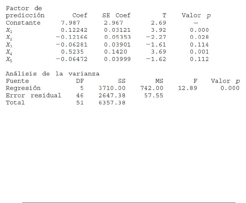 TALLER COLABORATIVO DE REGRESION MULTIPLE La siguiente captura de pantalla de regresión se obtuvo de un estudio de empresas de arquitectura. La variable dependiente es la cantidad total de honorarios, en millones de dólares. X1 es el número de arquitectos que trabajan en la compañía. X2 es el número de ingenieros que trabajan en la compañía. X3 es el número de años invertidos en proyectos de cuidado de la salud. X4 es el número de estados en los que opera la empresa. X5 es el porcentaje del trabajo de la empresa que se relaciona con el cuidado de la salud. Requerimientos: 1. Elabore la Ecuación de Regresión Lineal Múltiple. Explique. La ecuación de regresión lineal múltiple es una forma de modelar la relación entre una variable dependiente (en este caso, la cantidad total de honorarios) y varias variables independientes (X1, X2, X3, X4, X5) simultáneamente. La ecuación toma la forma general: Y = β₀ + β₁X₁ + β₂X₂ + β₃X₃ + β₄X₄ + β₅X₅ + ε · Y es la variable dependiente (cantidad total de honorarios). · β₀ es la constante (intercepto) de la ecuación. · β₁, β₂, β₃, β₄, β₅ son los coeficientes de regresión asociados con cada una de las variables independientes (X1, X2, X3, X4, X5), respectivamente. · X₁, X₂, X₃, X₄, X₅ son los valores de las variables independientes. · ε es el término de error. En este caso, los valores de los coeficientes son: β₀ = 7.987 β₁ = 0.12242 β₂ = -0.12166 β₃ = -0.06281 β₄ = 0.5235 β₅ = -0.06472 Entonces, la ecuación de regresión lineal múltiple sería: Honorarios = 7.987 + 0.12242 * X₁ - 0.12166 * X₂ - 0.06281 * X₃ + 0.5235 * X₄ - 0.06472 * X₅ + ε 2. ¿Cuál es el tamaño de la muestra?. Explique. El tamaño de la muestra es el número de observaciones o empresas que se utilizaron para llevar a cabo el estudio. En este caso, el tamaño de la muestra es la suma de las observaciones en la "Regresión" y el "Error residual" en la tabla de análisis de la fuente: Tamaño de la muestra = Número de observaciones en Regresión + Número de observaciones en Error residual Tamaño de la muestra = 5 + 46 = 51 3. ¿Cuántas variables independientes y dependientes se aplica en este ejercicio?. Explique. Variable dependiente: Cantidad total de honorarios (en millones de dólares). Variables independientes: X1 (Número de arquitectos), X2 (Número de ingenieros), X3 (Años invertidos en proyectos de cuidado de la salud), X4 (Número de estados en los que opera la empresa), X5 (Porcentaje de trabajo relacionado con cuidado de la salud). 4. Calcule las dos fórmulas del valor de R2. Explique. R² = Varianza explicada / Varianza total = 3710.00 / 6357.38 ≈ 0.5833 R² ajustado = 1 - (Varianza residual / Varianza total) * (n - 1) / (n - p) = 1 - (2647.38 / 6357.38) * (51 - 1) / (51 - 5) ≈ 0.5435 n es el tamaño de la muestra (51 en este caso). p es el número de variables independientes (5 en este caso). 5. Calcule el error estándar de estimación múltiple. Explique. SE de estimación = √(Varianza residual) = √(2647.38) ≈ 51.45 El error estándar de estimación múltiple (SE de estimación) mide la variabilidad de las estimaciones de los valores reales de la variable dependiente alrededor de la línea de regresión. Se calcula utilizando la raíz cuadrada de la varianza residual. 6. Halle el estadístico F Estadístico F = (Varianza explicada / Grados de libertad de la regresión) / (Varianza residual / Grados de libertad del error residual) 7. Realice una prueba de hipótesis por cada variable independiente. Utilice el nivel de significancia 0.05 Para realizar una prueba de hipótesis, se utilizan los valores T y los valores p asociados a cada coeficiente de regresión. La hipótesis nula (H0) establece que el coeficiente de regresión es igual a cero (no tiene efecto), y la hipótesis alternativa (H1) afirma que el coeficiente es diferente de cero (tiene efecto). X1: T = 3.92, Valor p = 0.000 (p < 0.05), por lo tanto, rechazamos H0 para X1. X2: T = -2.27, Valor p = 0.028 (p < 0.05), por lo tanto, rechazamos H0 para X2. X3: T = -1.61, Valor p = 0.114 (p > 0.05), por lo tanto, no rechazamos H0 para X3. X4: T = 3.69, Valor p = 0.001 (p < 0.05), por lo tanto, rechazamos H0 para X4. X5: T = -1.62, Valor p = 0.112 (p > 0.05), por lo tanto, no rechazamos H0 para X5. En resumen, las variables X1, X2 y X4 parecen tener un efecto significativo en la cantidad total de honorarios, mientras que X3 y X5 no parecen tener un efecto significativo en esta regresión. 2.- Se obtuvo el siguiente resultado. Se Requiere: Desarrolle e interprete 1. Elabore la Ecuación de Regresión Lineal Múltiple. Explique. La ecuación de regresión lineal múltiple se construye a partir de los coeficientes de regresión de las variables independientes. En este caso, los coeficientes son: Coeficiente de la constante (β₀) = 3.00 Coeficiente de X1 (β₁) = 4.00 Coeficiente de X2 (β₂) = 3.00 Coeficiente de X3 (β₃) = 0.20 Coeficiente de X4 (β₄) = -2.50 Coeficiente de X5 (β₅) = 3.00 Honorarios = 3.00 + 4.00 * X₁ + 3.00 * X₂ + 0.20 * X₃ - 2.50 * X₄ + 3.00 * X₅ + ε 2. ¿Cuál es el tamaño de la muestra? Explique. En la tabla, se muestra que para "Regresión" hay 5 grados de libertad y para "Error Total" hay 20 grados de libertad. Por lo tanto, el tamaño de la muestra es: Tamaño de la muestra = Grados de libertad de Regresión + Grados de libertad de Error Total Tamaño de la muestra = 5 + 20 = 25 3. ¿Cuántas variables independientes y dependientes se aplica en este ejercicio?. Explique. En este ejercicio, se aplican seis variables: una variable dependiente (ss) y cinco variables independientes (Constante, X1, X2, X3, X4, X5). 4. Calcule las dos fórmulas del valor de R2. Explique. SSR = 100 (suma de cuadrados de la regresión) SST = 140 (suma total de cuadrados) R² = 100 / 140 ≈ 0.7143 5. Calcule el error estándar de estimación múltiple. Explique. Dado que SS