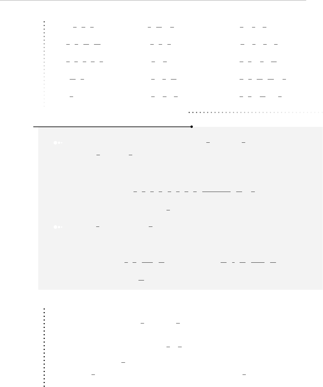 CAPÍTULO 4 ARITMÉTICA • Números racionales 55 PROBLEMAS Y EJERCICIOS DE APLICACIÓN 22. 3 2 5 1 4 7 2 + − + 27. 1 3 1 12 2 3 4 − − 32. 3 1 2 2 1 3 1 1 4 − + 23. 7 5 1 2 3 10 32 20 − − − 28. 11 6 2 3 1 2 − − 33. 2 1 4 3 1 3 1 1 2 1 1 6 + − + 24. 1 6 1 5 1 3 1 4 1 2 + + + − 29. 4 2 3 3 1 6 2− + 34. 1 3 4 2 3 2 1 2 1 7 12 + − + 25. 4 3 5 3 10 − 30. 7 1 2 1 2 5 9 10 − + 35. 1 3 4 1 2 1 16 1 32 2 1 8 − − − − 26. 4 6 1 2 − 31. 6 1 5 3 2 3 1 1 4 + − 36. 11 6 3 2 2 7 12 4 1 3 − + − + ⁄ Verifi ca tus resultados en la sección de soluciones correspondiente 1 Para preparar un pastel se emplean los siguientes ingredientes: 1 1 2 kg de harina, 1 2 kg de huevo, una taza de leche que equivale a 1 4 kg y azúcar 5 8 kg. ¿Cuántos kilogramos pesan estos ingredientes? Solución Se suman los kilogramos de todos los ingredientes y se obtiene: 1 1 2 1 2 1 4 5 8 3 2 1 2 1 4 5 8 + + + = + + + = + + + = =12 4 2 5 8 23 8 2 7 8 Por consiguiente, los ingredientes pesan 2 7 8 kg 2 Miguel perdió 1 3 de su dinero y prestó 1 4 . ¿Qué parte de su dinero le queda? Solución Se suma la porción que perdió con la que prestó y este resultado se resta a la unidad que representa lo que tenía. 1 3 1 4 4 3 12 7 12 + = + = 1 7 12 1 1 7 12 12 7 12 5 12 − = − = − = Por tanto, a Miguel le sobran 5 12 de su dinero. EJERCICIO 35 Resuelve los siguientes problemas: 1. Juan compró en el supermercado 1 2 kg de azúcar, 3 4 kg de harina y 1 kg de huevo, estos productos los colocó en una bolsa, ¿cuántos kilogramos pesa dicha bolsa? 2. Dos calles tienen las siguientes longitudes: 2 2 5 y 1 3 4 de kilómetro, ¿cuál es la longitud total de ambas? 3. Al nacer un bebé pesó 2 1 4 kilogramos, en su primera visita al pediatra éste informó a los padres que el niño había aumentado 1 2 kilogramo; en su segunda visita observaron que su aumento fue de 5 8 de kilogramo. ¿Cuántos kilos pesó el bebé en su última visita al médico? 4 CAPÍTULO MATEMÁTICAS SIMPLIFICADAS 56 Ej em pl os EJEMPLOS 4. A Joel le pidieron que realizara una tarea de física que consistía en contestar un cuestionario y resolver unos proble- mas. Se tardó 3 4 de hora en responder el cuestionario y 2 1 2 para solucionar los problemas, ¿cuánto tiempo le tomó a Joel terminar toda la tarea? 5. En su dieta mensual una persona debe incluir las siguientes cantidades de carne: la primera semana 1 4 de kilogramo, la segunda 3 8 , la tercera 7 16 y la última semana 1 2 kilogramo. ¿Cuántos kilos consumió durante el mes? 6. Tres cuerdas tienen las siguientes longitudes: 3 2 5 , 2 3 10 y 4 1 2 metros, cada una. ¿Cuál es la longitud de las 3 cuerdas juntas? 7. La fachada de una casa se va a pintar de color blanco y azul, si 5 12 se pintan de color blanco, ¿qué porción se pintará de color azul? 8. Un ciclista se encuentra en una competencia y ha recorrido 5 9 de la distancia que debe cubrir para llegar a la meta, ¿qué fracción de la distancia total le falta por recorrer? 9. Un sastre realiza una compostura a un pantalón cuyo largo originalmente es de 32 pulgadas, si para hacer la valenciana se dobla hacia arriba 1 3 4 de pulgada, ¿de qué largo quedó el pantalón después de la compostura? 10. De una bolsa de 1 kilogramo de azúcar se extrae una porción que equivale a 3 8 de kilogramo, ¿cuánta azúcar queda en la bolsa? 11. Un depósito contiene agua hasta 3 4 partes de su capacidad, si se ocupa una cantidad de agua equivalente a la mitad de la capacidad del depósito, ¿qué fracción de su máxima capacidad sobra? 12. Enrique vende 1 4 de terreno de su fi nca, alquila 1 6 y lo restante lo cultiva. ¿Qué porción de la fi nca siembra? 13. De un rollo de tela se han cortado las siguientes porciones: 2 3 y 1 6 de metro, ¿qué porción del rollo queda? 14. Luis, Jorge y Adán se organizan para realizar una tarea: Luis se compromete a hacer la mitad y Jorge hará la octava parte, ¿qué fracción de la tarea le corresponde a Adán? 15. Los 2 5 de un terreno se venden, 1 4 del resto se siembra de chile de árbol, ¿qué parte del terreno sobra? 16. 3 10 de los alumnos de una escuela están en cuarentena debido a que se encuentran enfermos de sarampión, además 1 5 de la población escolar llega tarde y las autoridades no les permiten la entrada. ¿Qué porción de alumnos asistió a la escuela? ⁄ Verifi ca tus resultados en la sección de soluciones correspondiente Multiplicación Para realizar esta operación se multiplican los numeradores y los denominadores. En caso de que existan fracciones mixtas, se deben convertir a fracciones impropias y posteriormente realizar los productos. 1 Efectúa 2 5 1 6 × . Solución Se aplica el procedimiento descrito y se simplifi ca el resultado. CAPÍTULO 4 ARITMÉTICA • Números racionales 57 2 5 1 6 2 1 5 6 2 30 1 15 × = × × = = ÷ ÷ =2 2 30 2 Por tanto, el resultado es 1 15 2 ¿Cuál es el resultado de 3 2 4 4 1 6 × ? Solución Se convierten las fracciones mixtas a impropias y se efectúa el producto. 3 2 4 4 1 6 14 4 25 6 350 24 14 7 12 × = × = = ÷ ÷ = =350 2 24 2 175 12 El resultado del producto es 175 12 o 14 7 12 3 Realiza 3 4 1 6 1 1 3 2× × × . Solución Se convierten las fracciones mixtas a impropias, se observa que existen factores iguales en el numerador y denominador, por lo tanto, es recomendable simplifi car la expresión para obtener el resultado. 3 4 1 6 1 1 3 2 3 4 1 6 4 3 2 1 × × × = × × × = × × × × × × 3 1 4 2 4 6 3 1 = × × = = ÷ ÷ 1 2 6 1 2 6 2 2 6 2 = 1 3 Por consiguiente, el resultado es 1 3 EJERCICIO 36 Efectúa los siguientes productos: 1. 2 5 10 8 × 2. 5 4 2 7 × 3. 3 6 2 9 × 4. 3 4 6 3 × 8. 6 3 1 2 × 2 9. 1 4 3 5 5 8 × 10. 2 2 3 3× 1 5 11. 2 3 3 4 5 6 × × 15. 1 1 6 12 7 14 2 × × 16. 7 9 8 5 × × ×3 14 15 17. 2 2 5 5 9 1 3 1 3 5 × × × 18. 2 9 7 5 × × ×3 14 5 5. 3 4 3 5 × 2 6. 3 2 5 2 4 × 7. 1 2 5 2 5 7 × 12. 1 5 9 4 12 6 × × 13. 2 3 5 7 3 4 × × 14. 3 4 5 3 4 5 × × 19. 2 2