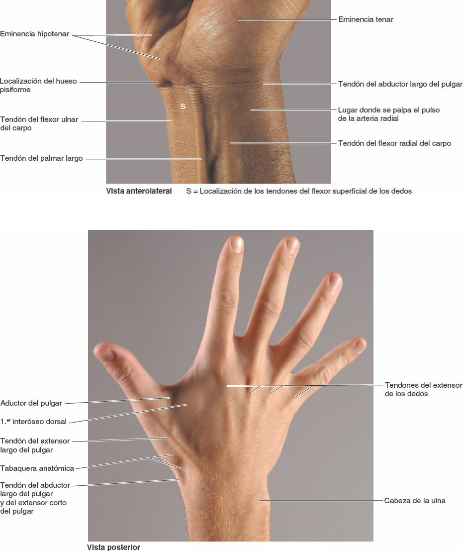 proximalmente a esta. El pulgar, como dispone de dos falanges, sólo tiene dos surcos de flexión. El surco digital proximal del pulgar cruza oblicuamente en la 1.a articulación metacarpofalángica o proximalmente a esta. Los surcos cutáneos de los pulpejos de los dedos, que forman las huellas digitales, se utilizan para la identificación de las personas debido a sus patrones únicos. Los surcos tienen la función fisiológica de disminuir el deslizamiento de los objetos que se agarran. FIGURA 3-87. Anatomía de superficie de la región anterior del carpo. FIGURA 3-88. Anatomía de superficie del dorso de la mano. 508 https://booksmedicos.org https://booksmedicos.org booksmedicos.org Push Button0: