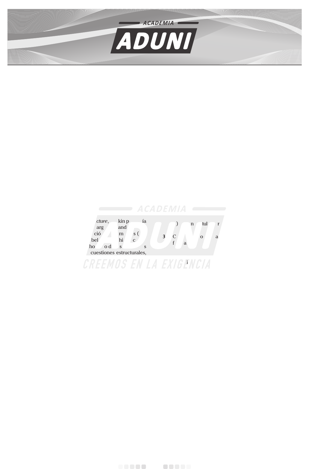 Repaso San Marcos CUARTO SIMULACRO DE EXAMEN DE ADMISIÓN UNMSM 1 CUARTO SIMULACRO DE EXAMEN DE ADMISIÓN UNMSM Repaso San Marcos HABILIDADES Habilidad Verbal Texto N.º 1 John Ruskin, crítico de arquitectura y primera persona que obtenía la cátedra Slade de Arte de Oxford (1868), equi- paraba el carácter de una nación con el de su arquitec- tura. Creía que la naturaleza de la arquitectura británica contemporánea mejoraría si fuera diseñada de acuerdo con los principios ejemplificados en los estilos románico y gótico. En su obra The Seven Lamps of Architecture (1849), definía esos principios como sacrificio, verdad, poder, be- lleza, vida, memoria y obediencia, y explicaba cómo cada uno de ellos podía ser expresado por medio de la forma, la decoración o la estructura. En The Seven Lamps of Architecture, Ruskin proponía ciertas recomendaciones estéticas argumentando a favor de la simplificación en la acumulación de elementos (po- der), la decoración naturalista (belleza), el historicismo estilístico (obediencia) y un uso honesto de los materiales (verdad). También se ocupó de cuestiones estructurales, demostrando que estaba tan preocupado por el proceso constructivo como por el resultado de este. Ruskin defen- día la idea de que la arquitectura debía ser un reflejo de la circunspección y los sentimientos de cada individuo im- plicado en la obra. “Creo que la pregunta que debemos formularnos, con respecto a todas las formas decorativas, es esta: ¿Se ha realizado con satisfacción... se sentía feliz el tallador mientras se afanaba en su tarea?”. Ruskin continúa desarrollando este tema en The Stones of Venice (1851-1853), influyente obra en tres vo- lúmenes donde realiza un análisis en profundidad de la arquitectura veneciana desde la Edad Media. En un en- sayo titulado “On the Nature of Gothic” (Acerca de la na- turaleza de lo gótico), Ruskin resume las cualidades que dan a la arquitectura medieval su carácter distintivo. Entre ellas menciona la rudeza (entendida como imperfección o falta de precisión), la variabilidad (asimetría, variedad y disposición aleatoria de los elementos), el naturalismo (realismo y honestidad, opuestos al convencionalismo), el carácter grotesco (gusto por lo fantástico), la rigidez (pro- porcionada por la energía y agilidad de las formas y orna- mentos) y, finalmente, la redundancia (lograda mediante la repetición de elementos decorativos). En cada una de esas cualidades veía una prolongación de la personalidad del artista y creía que todas ellas eran necesarias para lo- grar una arquitectura con carácter propio. Mientras la “división del trabajo” degradase al ope- rario asimilándolo a la máquina, la arquitectura nunca alcanzaría los estándares de calidad de la Edad Media. Ruskin proponía modificar el proceso de diseño de tal manera que permitiera disfrutar de un ambiente laboral “saludable y ennoblecedor”. 1. ¿Cuál es el tema central del texto? A) las concepciones estéticas de John Ruskin B) la crítica de la arquitectura utilitarista occidental C) el uso honesto de los materiales y la simplificación D) la idea de belleza a partir de la verdad y la honestidad 2. Es incompatible con el texto sostener que A) el uso honesto de los materiales implica la verdad. B) los criterios de Ruskin demuestran un gusto por la na- turaleza. C) el autor de referencia plantea ciertas ideas sobre la be- lleza. D) Ruskin postula un rechazo contra el estilo románico. 3. Con respecto a la arquitectura, Ruskin tenía una actitud favorable a A) negar todo sentimiento por parte del creador. B) la simplificación en la acumulación de elementos. C) la producción de las obras en serie y de forma masiva. D) separar al artista tallador de su obra. 4. Una idea incompatible con el texto es afirmar que Ruskin A) criticaba los ambientes laborales alienantes. B) estaba preocupado por el proceso constructivo. C) admiraba la arquitectura medieval. D) aceptaba la división del trabajo. 5. A partir del texto, un antónimo del término asimetría, sería A) equivalencia. B) armonía. C) igualdad. D) belleza. Texto N.º 2 Yo propongo que una organización sea creada por el Es- tado para quienes intervienen en la producción de televi- sión. Cualquiera que esté ligado a la producción televisiva debe tener una patente, una licencia, una cédula profesio- nal, que le pueda ser retirada de por vida cuando actúe en contravención de ciertos principios. Este es el medio por el cual yo quisiera que se introdujese finalmente una dis- ciplina en este campo. Cualquiera que haga televisión, de- berá necesariamente estar organizado, deberá tener una patente. Y quienquiera que haga algo que no debería ha- ber hecho según las reglas de la organización, y con base en el juicio de la organización, podrá perder esa patente. Academia ADUNI 2 El organismo que tenga la facultad de retirar la patente será una especie de tribunal. Por esto, en un sistema tele- visivo que operase según mi propuesta, todos se sentirían bajo la constante supervisión de este organismo y debe- rían sentirse constantemente en la situación de quien, si comete un error (siempre con base en las reglas fijadas por la organización), puede perder la licencia. Esta super- visión constante es algo mucho más eficaz que la censura, porque la patente, en mi propuesta, debe ser concedida solo después de un curso de adiestramiento, al término del cual habrá un examen. Uno de los fines principales del curso será enseñar a aquel que aspira a producir televisión, que de hecho, le guste o no, participará en la educación de masas, en un tipo de educación que es terriblemente poderoso e im- portante. De esto se deberán dar cuenta, quiéranlo o no, todos los que participan en hacer televisión: actúan como educadores, dado que la televisión presenta sus imágenes tanto ante los niños y jóvenes como ante los adultos. Hace ocho años, en una lección sostuve la