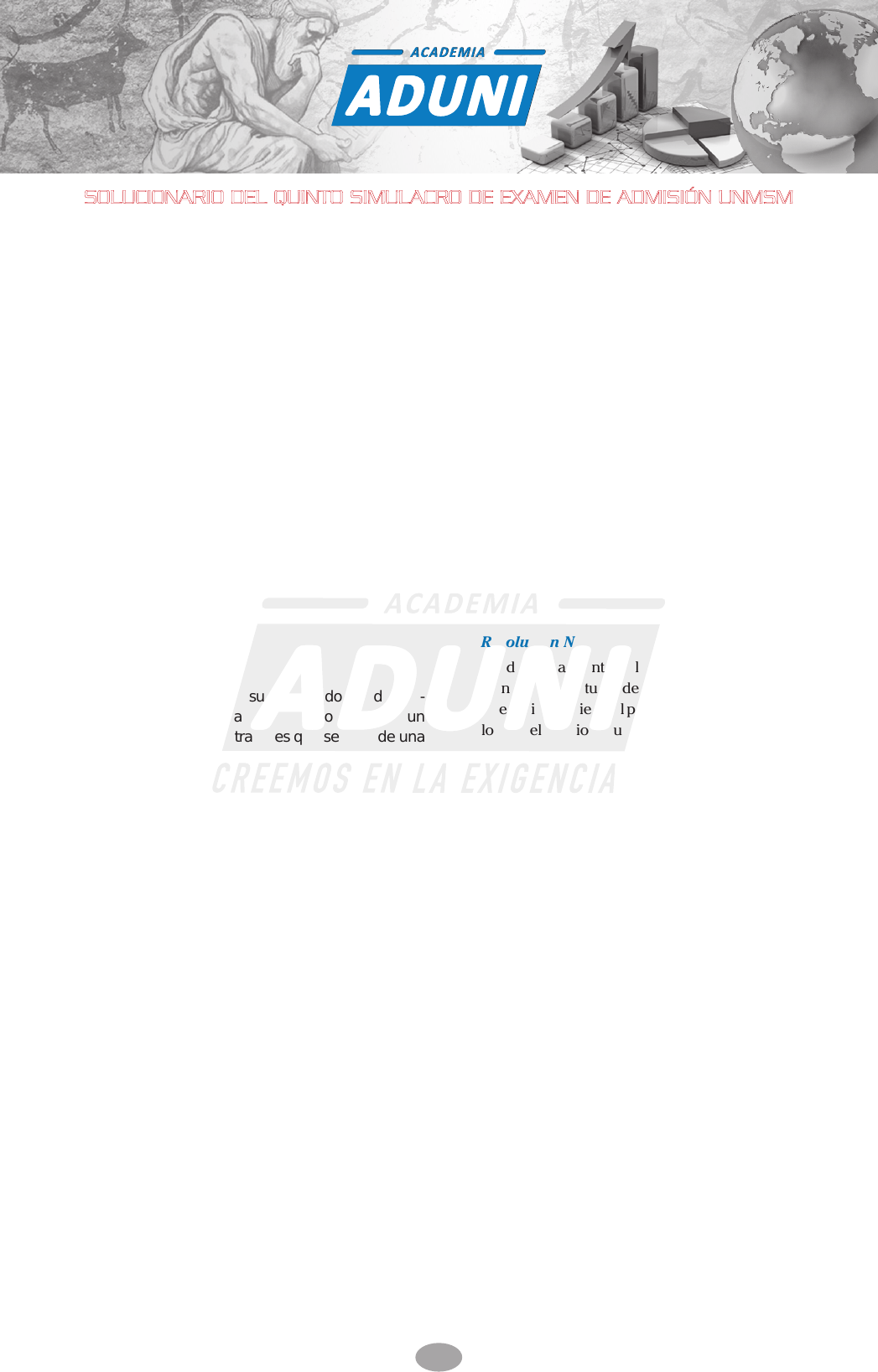 Habilidad Verbal Comprensión lectora Texto N.°1 Resolución Nº 1 El texto, principalmente denuncia a un individuo autorita- rio que utilizaba la religión para manipular a los jóvenes. A lo largo del texto se enfatiza en un personaje con rasgos autoritarios que usando la religión lograba persuadir, ma- nipular para tener el control y la obediencia de sus jóvenes discipulos. Respuesta: a un individuo autoritario que utilizaba la reli- gión para manipular a los jóvenes. Clave: C Resolución Nº 2 El término férreo se opone en su significado a indulgen- te. En el contexto se menciona que el personaje logró un control gidorí y severo. Lo contrario es que se trate de una autoridad benevolente, es decir, indulgente. Respuesta: indulgente. Clave: B Resolución Nº 3 El personaje anónimo de la crónica persuadía a sus seguidores al investirse como el auténtico enviado de dios. En el texto se dice que el personaje anónimo se autoproclamaba como alguien muy cercano a dios y que la voluntad de este se manifestaba a través de él. Respuesta: investirse como el auténtico enviado de dios. Clave: C Resolución Nº 4 Se puede inferir de los testimonios presentados en el texto que denotan una manifiesta estrategia de control y sumisión. En el texto se menciona casos testimoniales de jóvenes cuyas palabras nos dan a entender que el personaje aludido buscaba tener el control y la obediencia de ellos. Respuesta: denotan una manifiesta estrategia de control y sumisión. Clave: D SOLUCIONARIO DEL QUINTO SIMULACRO DE EXAMEN DE ADMISIÓN UNMSM REPASO SAN MARCOS Resolución Nº 5 Si los jóvenes que dan su testimonio en el texto hubiesen gozado de lazos familiares estrechos y sumamente afectivos, entonces se hubiese tornado complicado que el personaje aludido los persuada. En el texto se dice que lograba alejar a los jóvenes de sus padres, ya que los lazos afectivos con ellos eran débiles, por ello resultaba factible persuadirlos y con ello tener el control, sin embargo, si hubieran tenido lazos familiares firmes habría sido más difícil persuadirlos. Respuesta: se hubiese tornado complicado que el personaje aludido los persuada. Clave: A Texto N.°2 Resolución Nº 6 Fundamentalmente, el texto versa sobre la relevancia científica del estudio del psicoanálisis. En el texto se explica que si bien es cierto el psicoanálisis no es una ciencia incluso lo dice el propio Freud, sin embargo, el autor considera que tal vez tenga mucha importancia siendo el central en la neurociencia el inconsciente de la mente. Respuesta: la relevancia científica del estudio del psicoanálisis. Clave: D Resolución Nº 7 ¿Qué información es convergente con lo expuesto en el texto? Freud desistía de adjudicar un carácter científico a sus trabajos e investigaciones. En el texto se cita a Freud manifestando su renuncia a la idea de que él era un científico y, por consiguiente, se entiende que el psicoanálisis para él no es una ciencia. Respuesta: Freud desistía de adjudicar un carácter científico a sus trabajos e investigaciones. Clave: C Resolución Nº 8 La expresión efecto detonante está relacionada con el concepto de repercusión. En el texto esta expresión se refiere al impacto e influencia que tuvo la obra de Malthus en la teoría de la selección natural de Darwin. Respuesta: repercusión. Clave: A HABILIDADES 1 Resolución Nº 9 Según lo planteado, el psicoanálisis, a pesar de no ser con- siderado como una ciencia, ha podido intervenir en los avances científicos, sobre todo de la neurociencia. Pese a que no es una ciencia se dice que puede que haya tenido más importancia a nivel de los estudios de neurociencia, por ejemplo, el inconsciente de la mente. Respuesta: ha podido intervenir en los avances científicos, sobre todo de la neurociencia. Clave: B Resolución Nº 10 Es posible inferir acerca del inconsciente que es imprescindible para la actividad del ser humano. Lo que se experimenta como mente consciente representa una mínima parte de nuestra vida diaria, lo que permite deducir que el inconsciente es fundamental en nuestra vida. Respuesta: es imprescindible para la actividad del ser humano. Clave: C Text N.°3 Resolución Nº 11 Tema: Reading comprehension It is obvious from the passage that the functions of the Tower of London (Es obvio por el texto que las funciones de la Torre de Londres) have varied greatly over the centuries (han variado mucho a lo largo de los siglos). A lo largo del texto se menciona que la Torre de Londres ha sido usado para varios propósitos, como: palacio, prisión, hoy en día es un museo. Respuesta: have varied greatly over the centuries Clave: C Resolución Nº 12 Tema: Reading comprehension We learn from the passage that the Tower (Aprendemos del texto que la Torre) was never a prison for ordinary people (nunca fue una prisión para gente común). En el texto se menciona: it was turned into a prison, but only distinguished prisoners, including statesmen and princes, were held there (se convirtió en una prisión, pero solo pre- sos distinguidos, incluidos hombres de estado y príncipes, estaban recluidos allí). Respuesta: was never a prison for ordinary people Clave: A Resolución Nº 13 Tema: Reading comprehension William the Conqueror’s original purpose in building the Tower of London (El propósito original de Guillermo el Conquistador al construir la Torre de Londres) was one of defense (fue uno de defensa). Al inicio del texto se menciona: The famous Tower of London was built as a fortress by William the Conqueror (La famosa Torre de Londres fue construida como fortaleza por Guillermo el Conquistador). Respuesta: was one of defense Clave: A Resolución Nº 14 Tema: Reading comprehension Currently, the Tower of London (Actualmente, la Torre de Londres) is used to show the crown jewels (se usa para mostrar las joyas de la corona). Al final del texto se mencio- na: Today the Tower is a national museum, where, among other things, the jewelry 