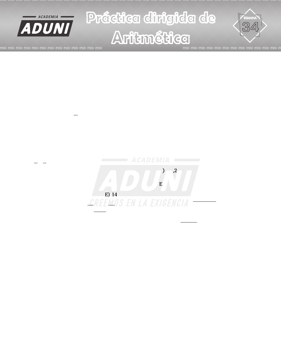 Anual San Marcos Aritmética 1. Dadas las siguientes expresiones: A=0,08+0,1+0,12+...+0,42 B=0,01+0,03+0,05+...+0,99 Halle el valor de A B . A) 0,18 B) 0,32 C) 2,5 D) 0,84 E) 0,25 2. Si se cumple que a b 5 8 1 475+ = , Halle el valor de a×b. A) 32 B) 12 C) 20 D) 21 E) 14 3. Julia divide el número ab entre ba resultando un número de la forma b, 0(4b) pero olvida los valores de a y b. Si le pide a Nidia que calcule dichos valores y lo hace correctamente, ¿qué valores obtuvo? De como respuesta el valor de a×b. A) 10 B) 40 C) 20 D) 18 E) 16 4. Diony divide 76 entre (58×2) obteniendo un decimal cuya última cifra de su desarrollo de- cimal es n. Luego le da a Javier tantos soles como el valor de n para que se compre una gaseosa que vale S/1,80 ¿cuánto recibirá Javier de vuelto? A) S/0,4 B) S/0,3 C) S/0,2 D) S/0,5 E) S/0,8 5. Si la fracción 150 2 54 2n n+ × genera 30 cifras de- cimales, ¿cuántas cifras decimales genera la fracción 7 5 3n n× ? A) 8 B) 12 C) 9 D) 16 E) 10 Números decimales I ANuAl SAN MArcoS - 2023 1 Práctica dirigida de Aritmética semana 34