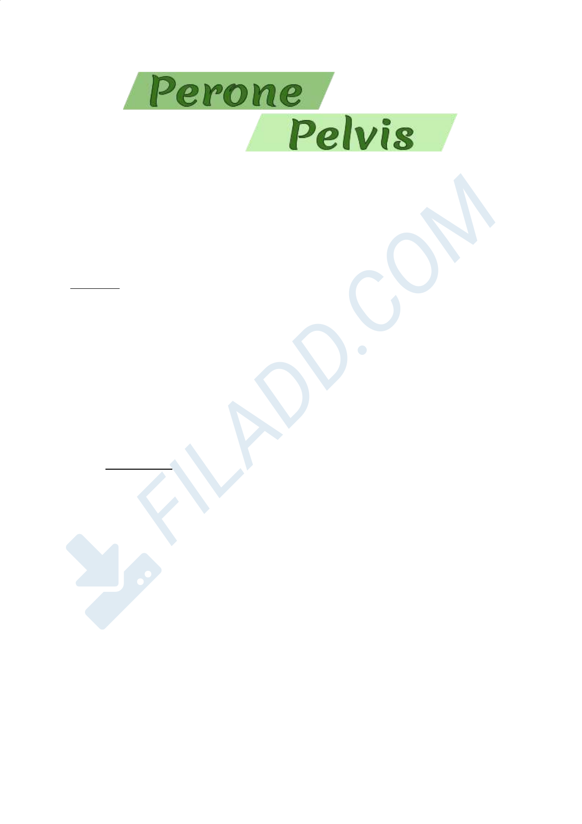 Límites generales: - Anterior: Pared anterolateral del abdomen - Posterolateral: Región glútea - Inferior: Periné CINTURA PÉLVICA Anillo óseo cuenco que conecta la columna con los dos fémures Funciones : Resistir el peso de MS sentada, transferir el peso del esqueleto axial al MI en bipedestación, dar inserción a músculos locomotores y abdominales, contener y proteger vísceras. HUESOS DE PELVIS ÓSEA ● Coxales: 2 huesos grandes e irregulares, fusión del Ilion, Isquion y Pubis ● Sacro ● Unión de huesos coxales: cartílago trirradiado en el acetábulo (niños, luego se fusionan) ● Huesos coxales se unen por sínfisis del pubis anteriormente y con el sacro por las articulaciones sacroilíacas posteriormente (cintura pélvica) ● Pelvis mayor y menor divididas por la abertura superior de la pelvis, definido por la línea terminal ● Línea terminal está formada por: ○ Promontorio y ala del sacro ○ Línea arqueada en cara interna de ilion ○ Línea pectínea y cresta del pubis ● Arco de la pubis está formado por las ramas isquiopubianas, que se unen a la sínfisis del pubis ● La abertura inferior de la pelvis está limitada: ○ Anterior: Arco del pubis ○ Lateral: Tuberosidad isquiáticas ○ Posterolateral: Borde inf. del Ligamento sacrotuberoso ○ Posterior: Extremo del cóccix ● Pelvis mayor (falsa): Rodeada por cintura pélvica, ocupada por las vísceras abdominales inferiores (dándoles protección), Límites: superiormente por la abertura superior de la pelvis, posteriormente por las alas de los iliones y S1. ● Pelvis menor (verdadera): Rodeada por la porción inferior de la cintura, es el marco esquelético de cavidad pélvica y periné, entre las aberturas superior e inferior. Incluye la cavidad pélvica y compartimiento perineal. Límites: caras pélvicas de todos los huesos. Este archivo fue descargado de https://filadd.com � FI LA DD .CO M ORIENTACIÓN DE PELVIS ÓSEA ● Posición anatómica: ○ Espinas ilíacas anteriores superiores y cara anterior de sínfisis del pubis están en el mismo plano vertical ○ Extremo del cóccix cerca del centro de la abertura superior de la pelvis ○ Huesos púbicos y sínfisis son el suelo de la pared posterior ○ Vista medial: Promontorio del sacro superior al centro de la abertura inferior de la pelvis ○ El eje curvo de la pelvis cruza el eje de la cavidad abdominal en un ángulo CAVIDAD PÉLVICA ● Cavidad abdominopélvica: Desde la caja torácica hasta dentro de la pelvis ● Cavidad pélvica: Espacio entre las paredes y suelo de la pelvis. Está posteroinferior y se continúa con la cavidad abdominal en la abertura superior de la pelvis. ● Contiene las porciones terminales de uréteres, vejiga urinaria, recto, órganos genitales pélvicos, vasos sanguíneos, linfáticos y nervios, asas del intestino delgado y grueso ● Límites: ○ Inferior: Diafragma pélvico, suspendido encima de la abertura inferior ○ Posterior: Cóccix y sacro inferior ○ Techo: Sacro superior ● Eje de la pelvis tiene forma curva, importante para el parto PAREDES Y SUELO ● Pared anteroinferior : Formada por cuerpos y ramas de pubis y sínfisis. Sostén de vejiga urinaria ● Paredes laterales: Formadas por huesos coxales, cubiertas por los M. obturadores internos y fascia obturatriz. Proporciona fijación al diafragma pélvico. ● Pared posterior y techo : Pared y techo óseo de sacro y cóccix, paredes posterolaterales musculoligamentosas (M. piriformes y lig sacroilíacos, tuberosos y espinosos) ● Suelo: Constituido por el diafragma pélvico, en la pelvis menor. Separa la cavidad pélvica del periné (techo). La inserción del diafragma en la fascia obturatriz divide al obturador interno en porción pélvica superior (con los vasos y nervios) y porción perineal inferior . El diafragma parece una hamaca suspendida de las paredes de la pelvis menor y cierra gran parte del anillo de la cintura pélvica. ● El hiato urogenital es una hendidura anterior entre los bordes mediales de los elevadores del ano que permite el paso de la uretra y vagina. ● Músculo elevador del ano: Tiene 3 porciones; la puborrectal , fundamental en el mantenimiento de la continencia fecal, el pubococcígeo e iliococcígeo. Está atravesado por el conducto anal. Está siempre en contracción tónica para sostener las vísceras abdominopélvicas y la continencia. Se puede contraer activamente en un esfuerzo (tos, vómito, levantar objeto). Es necesaria su relajación para la defecación y micción, sumado a la contracción del diafragma torácico y la pared anterolateral del abdomen Este archivo fue descargado de https://filadd.com � FI LA DD .CO M MÚSCULOS Este archivo fue descargado de https://filadd.com � FI LA DD .CO M PERITONEO Y CAVIDAD PERITONEAL DE PELVIS ● Peritoneo parietal : tapiza la cavidad abdominal y se continúa inferiormente al interior de la cavidad pélvica, separado del suelo por las vísceras, que solo tienen las caras superolaterales recubiertas (excepto trompas) ● Una capa areolar laxa entre la fascia transversal y el peritoneo parietal permite a la vejiga expandirse, siendo su región superior la única donde el peritoneo no está unido a estructuras, pudiendo crear la fosa supravesical MUJER: ● Peritoneo pasa por encima del fondo y desciende por la cara posterior del útero sobre la pared posterior de la vagina antes de reflejarse superiormente sobre la pared anterior del recto inferior (ampolla rectal ) ● Fondo de saco rectouterino : Se forma entre el útero y el recto como una prolongación de la cavidad peritoneal . Tiene las fosas pararrectales a los costados. ● Los pliegues rectouterinos están formados por ligamentos fasciales subyacentes. Son los límites laterales de las fosas pararrectales ● Ligamento ancho del útero : Se forma mientras el peritoneo asciende por el útero. Es un pliegue peritoneal doble entre el útero y la pared lateral de la pelvis, separando las fosas laterales 