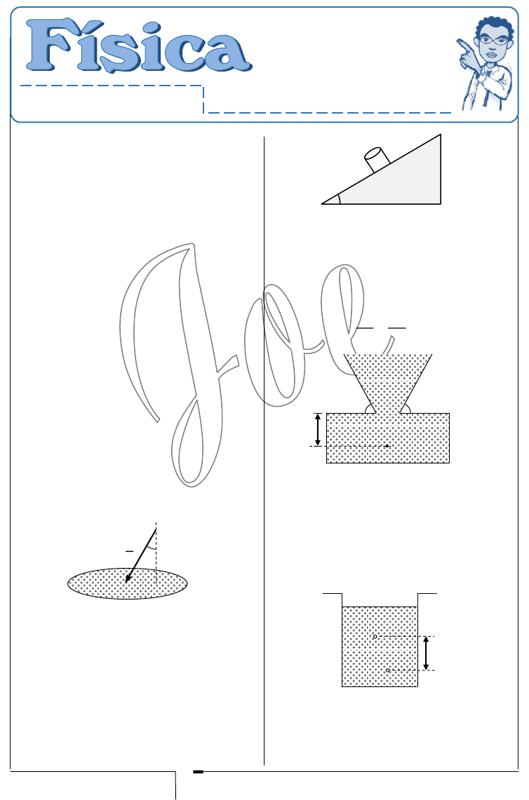 Joe Román Lantarón 1 1. (CBU 2007-I “B”) La densidad relativa de un cuerpo es 0,8.hallar la densidad y el peso específico de dicho cuerpo. 2 g 10m / s y 2 3 3 H O 10 kg / m A) 3 3800kg / m y 8000N / m B) 3 360kg / m y 600N / m C) 3 3500kg / m y 2500N / m D) 3 380kg / m y 800N / m E) 3 3600kg / m y 6000N / m 2. (CBU 2002-I “A”) Encontrar el peso específico (en 3 N / m ) de la mezcla constituida por 3 litros de agua y 2 litros de un líquido con densidad igual a 32g / cm . (Considerar g = 10 m/s2) A)1500 B)3000 C)15000 D)14000 E)1400 3. (CEPRU 2017-II) La presión que ejerce F=400N sobre la superficie de área 2A 2m en pascales, es: A) 180 B) 200 C) 220 D) 160 E) 240 4. (CBU 2003-I “A” y “B”) Un cilindro de 0,8kg de masa, se encuentra apoyado sobre un plano inclinado. La presión ejercida por el peso del cilindro sobre su base de 2 40cm de área, es: ( 2 g 10 m/s ) A)2,0kPa B)1,4kPa C)1,8kPa D)1,6kPa E)1,2kPa 5. (CEPRU INT 2015) El valor de la presión hidrostática (en kPa) que experimenta el punto B, ubicado en un líquido de densidad igual a 3 800kg / m es: 2 (g 10 m / s ) DE AC 100cm A) 6 B) 10 C) 8 D) 4 E) 2 6. (CBU 2006-II “B”) Si la presión absoluta en x es 5 4 10 Pa y la presión absoluta en y es 6 10 Pa ¿Cuál es la densidad del líquido? A) 3 3 3 10 kg / m B) 3 3 2 10 kg / m C) 3 3 6 10 kg / m D) 3 3 7 10 kg / m E) 3 3 10 kg / m Joe Román Lantarón Clases ONLINE HHiiddrroossttááttiiccaa A 37F h 10m x y aire 37 5353 AD B E C 20cm Joe Román Lantarón 2 7. (CEPRU PO 2017) En la figura, se tiene dos líquidos no miscibles de densidades 3 1 850kg / m y 3 2 1000 kg / m 2 (g 10 m / s ) La diferencia de presiones entre los puntos A y B en kPa, es: A) 66 kPa B) 57 kPa C) 37 kPa D) 95 kPa E) 47 kPa 8. (UNSAAC 2021-I) Si la variación de la presión hidrostática “ HP ” en función a la profundidad “h” de un líquido “x” se representa en la figura, entonces la densidad de dicho líquido, es: 2 (g 10 m / s ) A) 3 625kg / m B) 3 600kg / m C) 3 750kg / m D) 3 850kg / m E) 3 425 kg / m 9. (CEPRU 2014-II) La figura muestra un recipiente con diferentes líquidos 3 agua 1g / cm 2 g 10 m / s : Aceleración de la gravedad oP 100kPa : Presión atmosférica 1 2 3, , : Densidades El valor de la densidad 1 , es: A) 398 g / cm B) 3 100g / cm C) 3 49g / cm D) 350g / cm E) 3 75 g / cm 10.(CEPRU 2015-II) El módulo de la fuerza mínima F ejercida sobre la palanca de masa despreciable, para mantener en equilibrio el sistema hidráulico mostrado en Newton , es: ( 2 1A 20A ; 2 g 10m / s ) ( 1 2A ; A son área de los émbolos ingrávidos) A) 500 B) 200 C) 50 D) 1000 E) 1500 11.(CBU 2007-I “A”) En la siguiente figura, el líquido 1 tiene una densidad de 3 400kg / m y el líquido 2 tiene una densidad de 3 800kg / m . Determinar la presión hidrostática en el punto A en kPa. (g=10m/s2) A)6,5 B)8,4 C)8,2 D)8,1 E)6,3 12.(CBU 2003-I “A” y “B”) En el sistema, se tienen dos líquidos no miscibles de densidades 3 1 800 kg/m y 3 2 1200 kg/m . La presión hidrostática en el punto “B”, es: ( 2 g 10 m/s ) 0,5m 2 1 0,8m A 2m (2) (1) 3m B A 3 2 1 agua 20cm 20cm 200kg L 4L 1A2A F palanca h(m) 4 HP ( 10 Pa) 37 Joe Román Lantarón 3 A)800Pa B)1020Pa C)1000Pa D)1040Pa E)880Pa 13.(CBU 2006-I “B”) En la figura siguiente, determinar la presión atmosférica. Si 3 1 800 kg/m , 3 2 1000 kg/m , 2 g 10 m/s y presión en el punto 5 A 15 10 Pa A) 1486MPa B) 1486Pa C) 1486mPa D) 1486 Pa E) 1486kPa 14.El recipiente mostrado en la figura contiene aceite y agua cuyas densidades son 3 aceite 0,8g / c m y 3 agua 1g / c m respectivamente; determine la diferencia de presiones hidrostáticas ( B AP P ) (en kPa) entre los puntos indicados: ( 2 g 10m / s ) A)3,6 B)2,8 C)2,2 D)1,8 E)0,6 15.En un tanque cisterna el líquido contenido tiene una presión p que varía con la profundidad h medida desde la superficie libre del líquido según la gráfica mostrada, determine la densidad en ( 3 kg / m ) de dicho líquido. A)1100 B)1200 C)1400 D)1500 E)1600 16.(CBU 2005-II “B”) El grafico representa la variación dela presión P en función de la variación de la altura h , entre dos puntos en el seno de un líquido en reposo. Determinar la densidad de dicho fluido, 2g 10 m/s . A) 310kg / m B) 4 3 10 kg / m C) 3 1kg / m D) 1 3 10 kg / m E) 3 3 10 kg / m 17.Respecto al principio de Pascal. indique la verdad (V) o falsedad (F) de las siguientes proposiciones: I)Se puede afirmar que los líquidos encerrados transmiten la presión que se les comunica. II) los llamados mecanismos hidráulicos (gatas, elevadores) utilizan este principio III) Se puede afirmar que los líquidos encerrados transmiten la fuerza que se les aplica. A)VVF B)VVV C)FVF D)FFF E)VFF 18. (CBU 2008-I “B”) En una prensa hidráulica, cuyas áreas de los émbolos son 10cm agua aceite 20cm B A (1) (2) A 0,5m 1m oP ? 5 P(10 Pa) h(m) 1,0 2,62 13,50 Joe Román Lantarón 4 2 1A 10cm y 2 2A 400cm ¿Qué fuerza deberá ser aplicada sobre 1A para levantar una pesa de 80N la cual se encuentra sobre 2A ? A) 3N B) 6N C) 2N D) 4N E) 1N 19.(CEPRU 2012-II “A”) La figura muestra un tubo en U conteniendo dos líquidos no miscibles, la densidad del líquido “B”, es: (si 3 A B 3200kg / m ) A) 32000kg / m B) 3 3000kg / m C) 34000kg / m D) 3 1000kg / m E) 31500kg / m 20.(CBU 2002-I “A”) Las densidades de los líquidos contenidos en el tubo de la figura con 3 1 4000 kg/m y 3 2 2000 kg/m . Encontrar el valor de la presión atmosférica ( oP ), si el gas en la ampolla presenta una presión de 90kPa. (Considerar g = 10 m/s2) A)124kPa B)72kPa C)94kPa D)86kPa E)110Pa 21.(CBU 2002-I “A”) Los pistones de una prensa hidráulica poseen radios de 4mm y 8cm. Determinar el menor valor de la fuerza que deberá aplicarse, usando dicha prensa para levantar un cuerpo de 160kg de masa. (Considerar g = 10 m/s2) A)40N B)160N C)0,25N D)80N E)4N 22.(CEPRU PO 2012 “A”) En la prensa hidráulica de la figura, la fuerza F que se debe aplicar en el ém
