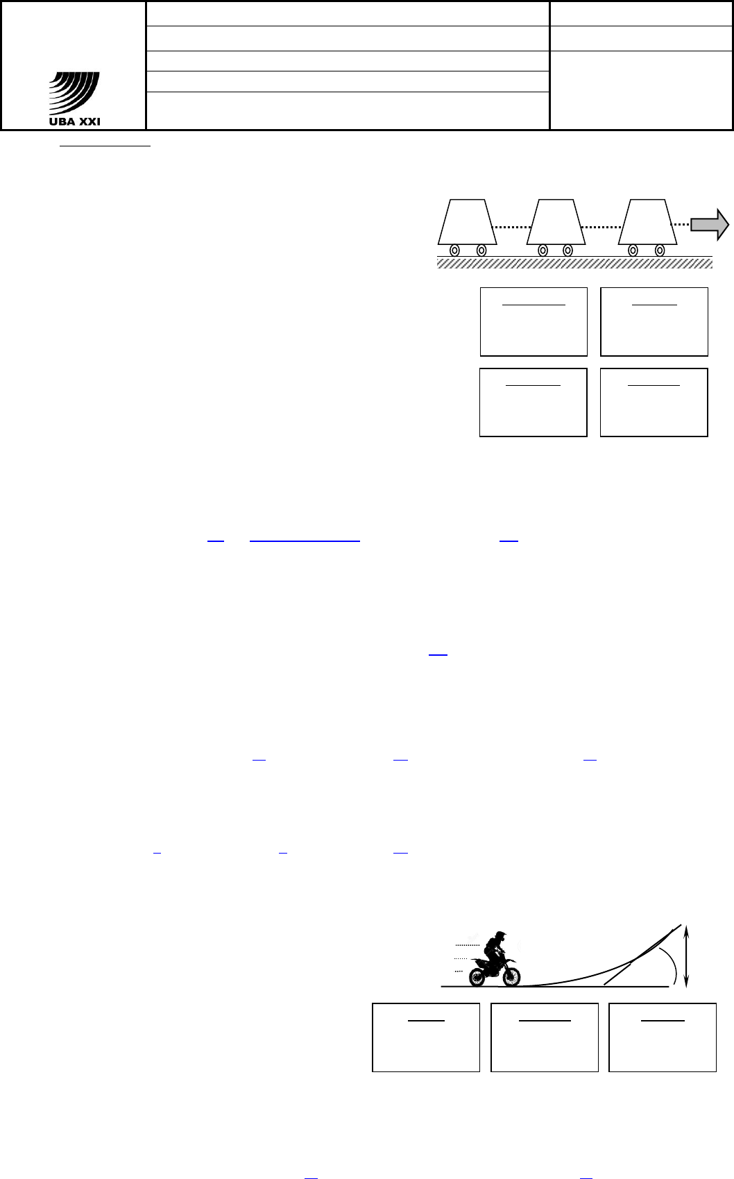 FISICA 2do.Parcial 2do. Cuatr. 21/11/2017 TEMA 1 APELLIDO: SOBRE Nº: NOMBRES: Duración del examen: 2 hs. DNI / CI / LC / LE / PAS. Nº: CALIFICACIÓN: Apellido del evaluador: E-MAIL: TELÉFONOS: Particular: Celular: IMPORTANTE: NO REALICE REDONDEOS O APROXIMACIONES PARCIALES DURANTE SUS CÁLCULOS, SÓLO HÁGALO EN EL RESULTADO FINAL. 1.- Tres vagones idénticos, que pueden desplazarse horizontalmente y sin rozamiento, se encuentran unidos por cuerdas inextensibles y de masa despreciable, tal como se muestra en el esquema. Cada vagón tiene una masa de 1200 kilogramos y partiendo del reposo se tira de la cuerda de la derecha con una fuerza de 3000 Newton durante un minuto. Exprese los resultados con 3 cifras significativas. (1,0 punto cada respuesta) a) Calcule la aceleración que tendrán los vagones. b) Calcule la tensión de cuerda entre los vagones B y C c) Calcule la velocidad que tendrán los vagones a los 45 segundos de comenzado el movimiento. d) Calcule la distancia recorrida por los vagones a los 45 segundos de comenzado el movimiento. La aceleración del conjunto de vagones surgirá de la relación entre la magnitud fuerza impulsora y magnitud de la masa a mover. 𝑎 = 𝐹 𝑚 = 3000 𝑁 (1200 ∙ 3) 𝑘𝑔 = 𝟎, 𝟖𝟑𝟑𝟑𝟑𝟑 … 𝒎 𝒔𝟐 La tensión en la cuerda que une a los vagones B y C corresponderá a la fuerza que imprime al vagón C una aceleración de 0,8333.. m/s2 𝐹 = 𝑚 ∙ 𝑎 = 1200 𝑘𝑔 ∙ 0.83333 … 𝑚 𝑠2 = 𝟏𝟎𝟎𝟎 𝑵 Partiendo del reposo, la velocidad final que el sistema tendrá luego de haber sido acelerado de manera constante durante 45 segundos será: 𝑣𝑓 = 𝑣0 + 𝑎 ∙ 𝑡 = 0 𝑚 𝑠 + 0,833333 … 𝑚 𝑠2 ∙ 45 𝑠 = 𝟑𝟕, 𝟒𝟗𝟗𝟗. . . 𝒎 𝒔 La distancia recorrida una vez transcurridos 45 segundos puede calcularse a partir de: 𝑑 = 𝑣0 ∙ 𝑡 + 1 2 ∙ 𝑎 ∙ 𝑡2 = 0 + 1 2 ∙ 0,83333 … 𝑚 𝑠2 ∙ (45𝑠)2 = 𝟖𝟒𝟑, 𝟕𝟒𝟗𝟗 … 𝒎 2.- El dibujo representa a un motociclista que recorre y abandona una rampa con una rapidez de 90,0 kilómetros por hora. El tramo final forma un ángulo de 36,9º respecto de la horizontal del suelo y termina a los 2,00 metros de altura. (g = 9,80 m/s2). Exprese los resultados con 3 cifras significativas. (1,0 punto cada respuesta) a) Calcule la altura máxima –respecto del suelo- que alcanzará el motociclista. b) Calcule a qué distancia horizontal -respecto del extremo derecho de la rampa- tocará el suelo. c) Calcule el tiempo que el motociclista estuvo “en el aire.” La altura del salto (por encima del nivel de la rampa) puede calcularse a partir de la componente vertical (vy) de la velocidad. 𝑣𝑦 = 𝑣 ∙ 𝑠𝑒𝑛 36,9º = 25 𝑚 𝑠 ∙ 0,6004202 … = 15,010506 … 𝑚 𝑠 y considerando a la componente vertical del movimiento como un caso de movimiento rectilíneo uniformemente variado (con una aceleración igual a la aceleración de la gravedad) podremos calcular la altura del salto a partir de: A B C F a) aceleración 0,833 m/s2 b) tensión 1,00x103 N c) velocidad 37,5 m/s d) distancia 844 m 36,9º 2 m a) altura 13,5 m b) distancia 63,8 m d) tiempo 3,19 s ℎ = 𝑣𝑦 2 2 ∙ 𝑔 = (15,010506 … 𝑚 𝑠 ) 2 ∙ 9,80 𝑚 𝑠2 2 = 11,495678. . 𝑚 La altura (h) alcanzada respecto del piso será unos 2 metros mayor, es decir 13,495678...m El tiempo que tarde dicho ascenso puede calcularse como: 𝑡𝑠𝑢𝑏𝑖𝑑𝑎 = 𝑣𝑦 𝑔 = 15,010506 … 𝑚 𝑠 9,80 𝑚 𝑠2 = 1,531684. . 𝑠 y el tiempo que tarde en caer desde la máxima altura hasta el nivel del piso será: 𝑡𝑐𝑎𝑖𝑑𝑎 = √ 2 ∙ ℎ 𝑔 2 = √ 2 ∙ 13,495678 … 𝑚 9,80 𝑚 𝑠2 = 1,65958 … 𝑠 Con lo cual el tiempo total de “vuelo” es la suma de ambos tiempos y eso resulta: 3,191264...s La distancia horizontal (d) desde el extremo de la rampa hasta que el motociclista llega se calcula a partir del tiempo de permanencia en el aire y de la componente horizontal (vx) de la velocidad. 𝑣𝑥 = 𝑣 ∙ 𝑐𝑜𝑠 36,9º = 25 𝑚 𝑠 ∙ 0,799684 … = 19,9921 … 𝑚 𝑠 𝒅 = 𝑣𝑥 ∙ 𝑡 = 19,9921 … 𝑚 𝑠 ∙ 3,19126 … 𝑠 = 𝟔𝟑, 𝟖𝟎𝟎 … 𝐦 3.- Un resorte cuya constante elástica es 4,00x104 N/m ya se ha descomprimido y ha impulsado un bloque de piedra de 10,0 kg de masa, el cual se desliza sobre una superficie libre de rozamiento, pasando por el punto p● con una rapidez de 5,00 metros por segundo. A continuación el bloque atraviesa una superficie de madera de 1,25 metros de longitud, para llegar finalmente al punto q● con una rapidez de 4,00 metros por segundo. Exprese los resultados con 3 cifras significativas. (1,0 punto cada respuesta) (g = 9,80 m/s2) a) Calcule cuántos centímetros se encontraba comprimido el resorte antes de impulsar a la roca. b) Calcule la energía cinética del bloque al pasar por el punto p c) Calcule el coeficiente de fricción dinámico piedra-madera. Al descomprimirse, la energía elástica acumulada en el resorte se transfirió al bloque de piedra, el cual pasa por el punto p● con una velocidad de 5 metros por segundo. Podemos calcular la energía cinética que posee el bloque a partir de: 𝐸𝑐𝑖𝑛 = 1 2 ∙ 𝑚 ∙ 𝑣2 = 1 2 ∙ 10,0 𝑘𝑔 ∙ (5 𝑚 𝑠 ) 2 = 𝟏𝟐𝟓 𝑱 Dicho valor de energía cinética se corresponde con la energía potencial elástica que tenía acumulada el resorte cuando se encontraba comprimido. Podemos calcular cuántos centímetros (Δd) se encontraba comprimido a partir de: 𝐸𝑒𝑙á𝑠 = 1 2 ∙ 𝑘 ∙ (∆𝑑)2 = 125 𝐽 → ∆𝒅 = √ 125 𝐽 ∙ 2 4,00 𝑥 104 𝑁 𝑚 = 0,0790569 … 𝑚 ≅ 𝟕, 𝟗𝟏 𝒄𝒎 La energía cinética del bloque al pasar por el punto q● resulta ser 80 J, con lo cual el trabajo de las fuerzas de rozamiento resulta ser: 𝐸𝑓𝑖𝑛𝑎𝑙 − 𝐸𝑖𝑛𝑖𝑐𝑖𝑎𝑙 = −