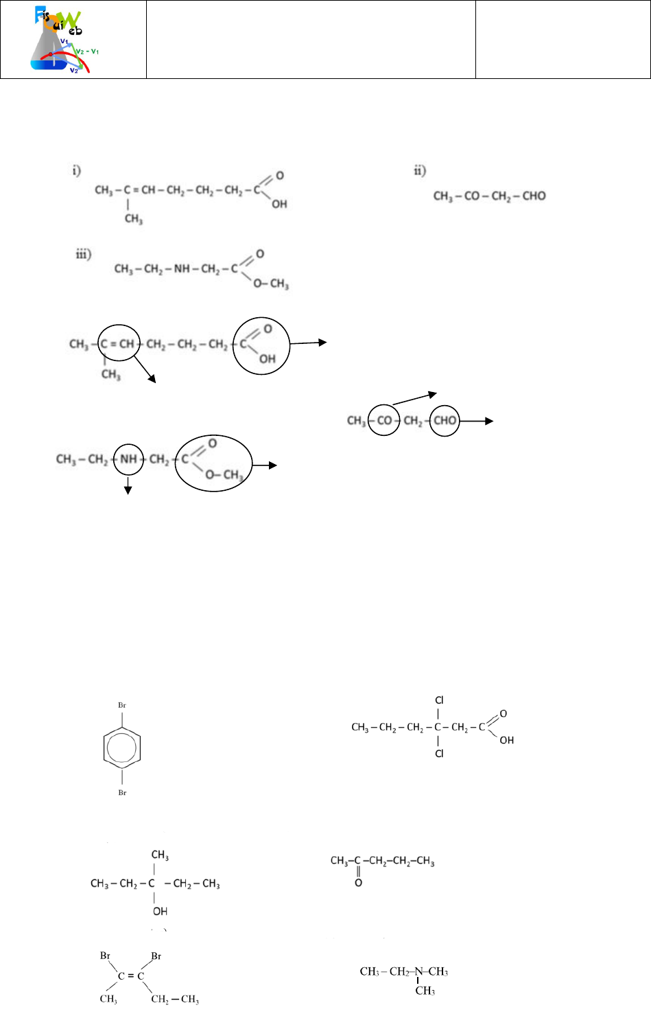 Química del carbono Problemas resueltos 1 (Oviedo. 2019-2020/Junio.5A b) Identifique y nombre los grupos funcionales presentes en los siguientes compuestos: Solución: (Oviedo. 2019-2020/Junio.5B b) Escriba las fórmulas semidesarrolladas de los siguientes compuestos: 1) 1,4-dibromobenceno (p-dibromobenceno) 2) Ácido 3,3-diclorohexanoico 3) 3-metil-3-pentanol (3-metilpentan-3-ol) 4) 2-pentanona (pentan-2-ona) 5) cis-2,3-dibromo-2-penteno (cis-2,3-dibromopent-2-eno) 6) etildimetilamina Solución: Carboxilo (ácido) Insaturación (doble enlace) Grupo éster Grupo amina (secundaria) 1 2 3 4 5 6 Grupo carbonilo (cetona) Grupo carbonilo (aldehído) Química 2º Bachillerato. Problemas resueltos Química del carbono 2 (Oviedo. 2019-2020/Julio.4B b) Escriba la ecuación química que representa la síntesis del acetato de etilo. Nombre y escriba la fórmula semidesarrollada de los reactivos empleados y escriba la fórmula semidesarrollada del producto orgánico de la reacción Solución: (Oviedo. 2019-2020/Julio.5B b) Nombre y escriba la fórmula semidesarrollada de tres de los cuatro isómeros constitucionales y geométricos posibles del alqueno cuya fórmula molecular es C4H8. Solución: NOTA. Se facilitan todos los isómeros, aunque en el enunciado se piden únicamente tres. (Oviedo. 2018-2019/ 4.5B) Escriba las fórmulas semidesarrolladas y nombre tres de los posibles isómeros constitucionales que tienen fórmula molecular C3H6Cl2 Solución: 1,1-dicloropropano 1,2-dicloropropano 2,2-dicloropropano 1,3-dicloropropano NOTA. Se facilitan las fórmulas de los cuatro isómeros del compuesto considerado. 3 3 2 3 2 3 2CH COOH CH CH OH CH COO CH CH H O C O H CH3 CH3 O C O CH2 CH3 Äcido etanoico (acético) Etanol Etanoato de etilo Acetato de etilo CH3 C H H OH CH CH CH3 CH3 but-2-eno CH2 CH CH2 CH3 but-1-eno CH2 C CH3 CH3 2-metipropeno C = C CH3 H3C H H cis-but-2-eno C = C CH3 H3C H H trans-but-2-eno Química 2º Bachillerato. Problemas resueltos Química del carbono 3 (Oviedo. 2018-2019/ 3.5B) Escriba las fórmulas semidesarrolladas de los siguientes compuestos: 1 Fenilamina 2. Metil-2-propanol (Metilpropan-2-ol) 3. 1,4-diclorobenceno (p-diclorobenceno) 4. Ácido trifluoroacético 5. 2-bromo-2-penteno (2-bromopent-2-eno) 6. 2-hidroxi-3-metilpentanal Solución: (Oviedo. 2018-2019/ 2.5B) Escriba las fórmulas semidesarrolladas y nombre tres de los isómeros posibles del ácido carboxílico con fórmula molecular: C5H10O2 Solución: 1. 2. 3. 4. 5. 6. Química 2º Bachillerato. Problemas resueltos Química del carbono 4 (Oviedo. 2018-2019/ 1.5B) Escriba las fórmulas semidesarrolladas de los siguientes compuestos: 1. Ácido 3-bromohexanoico 2. 2-butino (but-2-ino) 3. 4-hidroxipentanal 4. Butanodiona 5. Fenilmetilamina 6. Acetato de propilo Solución: (Oviedo. 2017-2018/ 4.5B) Escriba las fórmulas semidesarrolladas de los siguientes compuestos: 1. 1-bromohexano 2. 2-heptino (hepten-2-ino) 3. Butanal 4. Etilbenceno 5. Etilmetilpropilamina 6. Butanoato de butilo Solución: 1. 2. 3. 4. 5. 6. 1. 2. 3. 4. 5. 6. Química 2º Bachillerato. Problemas resueltos Química del carbono 5 (Oviedo. 2017-2018/ 3.5B) Identifique el tipo y complete las reacciones químicas. Nombre y formule los compuestos orgánicos que se obtienen en ellas. a) Benceno + Br2(l) b) 2-propanol (propan-2-ol)+ K2Cr2O7+H+ Solución: a) b) (Oviedo. 2017-2018/ 2.5B) Escriba las fórmulas semidesarrolladas y nombre los posibles isómeros consttitucionales/estructurales que tienen la fórmula molecular C5H12. Solución: (Oviedo. 2017-2018/ 1.5B) Escriba las fórmulas semidesarrolladas de los siguientes compuestos: 1. Fenol 2. Cis-4-metil-2-hexeno (cis-4-metilhex-2-eno) 3. 2-metil-3-pentanol (2-metilpentan-2-ol) 4. Ácido 2-metilpropanoico 5. Etil propil éter 6. 2-etil-2-metilpentanal Solución: FeBr3 pentano metilbutano dimetilpropano FeBr3 Al oxidar un alcohol secundario se obtiene una cetona. 1. 2. 3. 4. 5. 6. Química 2º Bachillerato. Problemas resueltos Química del carbono 6 (Oviedo. 2016-2017/ 4.5B) Identifique y nombre los grupos funcionales presentes en los siguientes compuestos: Solución: (Oviedo. 2016-2017/ 3.5B) Nombre y escriba las fórmulas semidesarrolladas de los compuestos orgánicos que intervienen en las siguientes reacciones químicas: a) Oxidación del 2-propanol (propan-2-ol) con dicromato Cr2O72- en medio ácido. b) Deshidratación del etanol en presencia de ácidos fuertes. Solución: a) b) (Oviedo. 2016-2017/ 2.5B) Para la reacción + Br2 a) Nombre y escriba la fórmula semidesarrollada del producto de la reacción. b) Nombre y escriba la fórmula semidesarrollada de los isómeros geométricos del producto de la reacción. Solución: 1. 2. 3. propan-2-ol propanona (acetona) etanol eteno (etileno) Reacción de oxidación. Los alcoholes primarios dan aldehídos (que pueden seguir oxidándose a ácidos) y los secundarios (como este caso), dan cetonas. Las reacciones de deshidratación pueden dar lugar a mezclas de isómeros cuando el alqueno no es simétrico. En este caso solo se obtiene un compuesto. CH CH Reacción de adición electrófila al doble enlace. La reacción puede continuar adicionando más bromo al doble enlace. 1,2-dibromoeteno etino (acetileno) cis-1,2-dibromoeteno trans-1,2-dibromoeteno Grupo carboxilo (ácido) Grupo hidroxilo (alcohol) Grupo éster Grupo carbonilo (aldehído) Amina Doble enlace Química 2º Bachillerato. Problemas resueltos Química del carbono 7 (Oviedo. 2016-2017/ 1.5B) Escriba las fórmulas semidesarrolladas de los siguientes compuestos: 1. 3,4-dicloro-1-pentino (3,4-dicloropent-1-ino) 2. Dietilmetilamina 3. cis -2,3-dicloro-2-penteno (cis-2,3-dicloropent-2-eno) 4. Dietil éter 5. Bromobenceno 6. 3-hexanona (hexan-3-ona) Solución: (Oviedo. 2015-2016/8.5B) Los puntos normales de ebullición del metanol (CH3OH, masa molecular= 32 g/mol) y del etano (C2H6, masa molecular= 30 g/mol) son 64,7 0C y - 89 0C, respectivamente. Justifique la diferencia entre los valores de los puntos normal