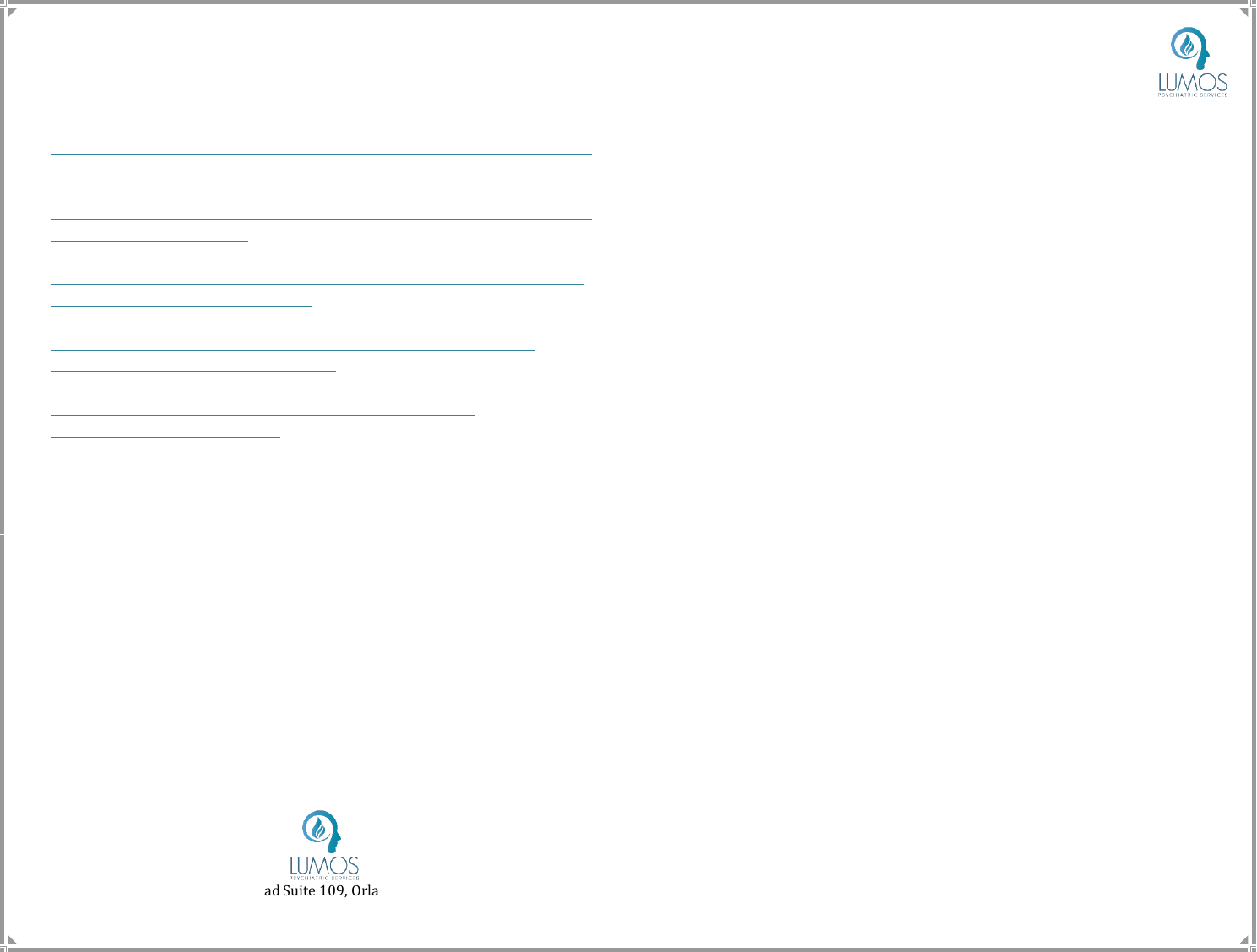 Fuentes Informativas (Español): ❖ http://www.rcpsych.ac.uk/healthadvice/translations/spanish/trast ornobipolarpuntosclave.aspx ❖ http://www.rcpsych.ac.uk/healthadvice/translations/spanish/trast ornobipolar.aspx ❖ http://www.rcpsych.ac.uk/healthadvice/translations/spanish/trast ornoafectivobipolar.aspx ❖ http://www.nimh.nih.gov/health/publications/espanol/trastorno- bipolar-facil-de-leer/index.shtml ❖ http://www.mentalhealthamerica.net/conditions/trastorno- bipolar-lo-que-usted-necesita-saber ❖ http://espanol.nami.org/Learn-More/Mental-Health- Conditions/Bipolar-Disorder Emergencias: De presentar algún síntoma severo de manía con conducta errática o si algún familiar suyo la presenta favor de llamar al 9-1-1 o visitar la sala de emergencias más cercana según le sea posible. 6001 Vineland Road Suite 109, Orlando FL 32819 Phone: (407) 930-6684 / Fax: (949) 404-8433 Lumos Psychiatric Services Folleto Educativo: Trastorno Bipolar El trastorno bipolar es una condición de salud mental también conocida como enfermedad maníaco-depresiva. Los que sufren del trastorno bipolar experimentan cambios de ánimo inusuales, que se pueden manifestar en una fase mánica o en una fase depresiva. Los que sufren un episodio mánico pueden: ❖ Sentirse muy alegres o animados ❖ Sentirse muy nerviosos, alterados, o ansiosos ❖ Hablar muy rápido de muchas cosas distintas ❖ Estar inquietos, irritados, sensibles o agresivos ❖ Tener problemas para relajarse o dormir ❖ Creerse capaz de hacer muchas cosas a la vez ❖ Estar más activos de lo usual ❖ Hacer cosas arriesgadas, como gastar mucho dinero o tener sexo sin cuidado alguno Los que sufren un episodio depresivo pueden: ❖ Sentirse muy deprimidos o tristes ❖ Sentirse preocupados y vacíos ❖ Tener problemas para concentrarse ❖ Olvidarse mucho de las cosas ❖ Perder el interés en actividades antes consideradas divertidas ❖ Sentirse cansados o sin energía ❖ Tener dificultad para dormir ❖ Pensar en la muerte o el suicidio En el trastorno bipolar, se pueden presentar síntomas psicóticos, como alucinaciones o creencias falsas que interfieren con las relaciones o la percepción del mundo que le rodea, perdiendo así contacto con la realidad. El trastorno bipolar afecta por igual a hombres y mujeres, y generalmente aparece entre los 15 y 25 años. http://www.rcpsych.ac.uk/healthadvice/translations/spanish/trastornobipolarpuntosclave.aspx http://www.rcpsych.ac.uk/healthadvice/translations/spanish/trastornobipolarpuntosclave.aspx http://www.rcpsych.ac.uk/healthadvice/translations/spanish/trastornobipolar.aspx http://www.rcpsych.ac.uk/healthadvice/translations/spanish/trastornobipolar.aspx http://www.rcpsych.ac.uk/healthadvice/translations/spanish/trastornoafectivobipolar.aspx http://www.rcpsych.ac.uk/healthadvice/translations/spanish/trastornoafectivobipolar.aspx http://www.nimh.nih.gov/health/publications/espanol/trastorno-bipolar-facil-de-leer/index.shtml http://www.nimh.nih.gov/health/publications/espanol/trastorno-bipolar-facil-de-leer/index.shtml http://www.mentalhealthamerica.net/conditions/trastorno-bipolar-lo-que-usted-necesita-saber http://www.mentalhealthamerica.net/conditions/trastorno-bipolar-lo-que-usted-necesita-saber http://espanol.nami.org/Learn-More/Mental-Health-Conditions/Bipolar-Disorder http://espanol.nami.org/Learn-More/Mental-Health-Conditions/Bipolar-Disorder ¿Qué causa el Trastorno Bipolar? Varios factores podrían contribuir al trastorno bipolar, entre ellos: ❖ Componente hereditario (los genes) ❖ Anormalidad en la estructura y función del cerebro Los siguientes factores pueden desencadenar un episodio maníaco en personas que son vulnerables a la enfermedad. ❖ Cambios en el estilo de vida como un parto ❖ Medicamentos como antidepresivos o esteroides ❖ Períodos de insomnio ❖ Consumo de drogas psicoactivas ¿Es fácil diagnosticar el Trastorno Bipolar? No. Algunas personas sufren del trastorno bipolar durante años antes de ser diagnosticado. La condición podría presentarse inicialmente en la fase depresiva (llevando al médico a dar un diagnóstico de depresión) o con síntomas que pueden sugerir otra condición. Ejemplos de otros problemas asociados a los síntomas del trastorno bipolar son el abuso de sustancias, los trastornos de ansiedad, la enfermedad de la tiroides, y las enfermedades cardíacas. Riesgo suicida: Las personas que padecen de trastorno bipolar tienen una posibilidad aumentada (tres veces más probable) de poder llegar a cometer suicidio que la de aquellos que padecen de depresiones mayores. ¿Cómo evitar las recaídas? Los episodios de depresión o manía retornan en la mayoría de los pacientes, a pesar del tratamiento. Los objetivos del tratamiento son: ❖ Evitar ciclos de una fase a otra. ❖ Evitar la necesidad de una hospitalización. ❖ Ayudar a que el paciente se desempeñe lo mejor posible entre episodios. ❖ Prevenir el comportamiento autodestructivo, incluyendo el suicidio. ❖ Reducir la gravedad y frecuencia de los episodios. Tratamiento del Trastorno Bipolar: El trastorno bipolar no tiene cura, pero el tratamiento ayuda a controlar los síntomas, los cambios de estado de ánimo y los problemas de comportamiento. ❖ Medicamentos - Distintos tipos de medicamentos pueden dar buen resultado. Los más utilizados son los estabilizadores de ánimo y los anticonvulsivos. En ocasiones, los antipsicóticos, antidepresivos, ansiolíticos o hipnóticos podrían utilizarse para el manejo de los síntomas. ❖ Psicoterapia - Distintas clases de psicoterapia pueden ayudar a las personas que sufren del trastorno bipolar. La terapia puede ayudar a cambiar su conducta y manejar sus vidas. También puede ayudar a los pacientes a llevarse mejor con familiares y amigos. A veces la terapia podría incluir a los familiares y amigos. ❖ Terapia Electroconvulsiva (ECT) - Algunas personas no mejoran con medicamentos y psicoterapia, por lo que podrían beneficiarse