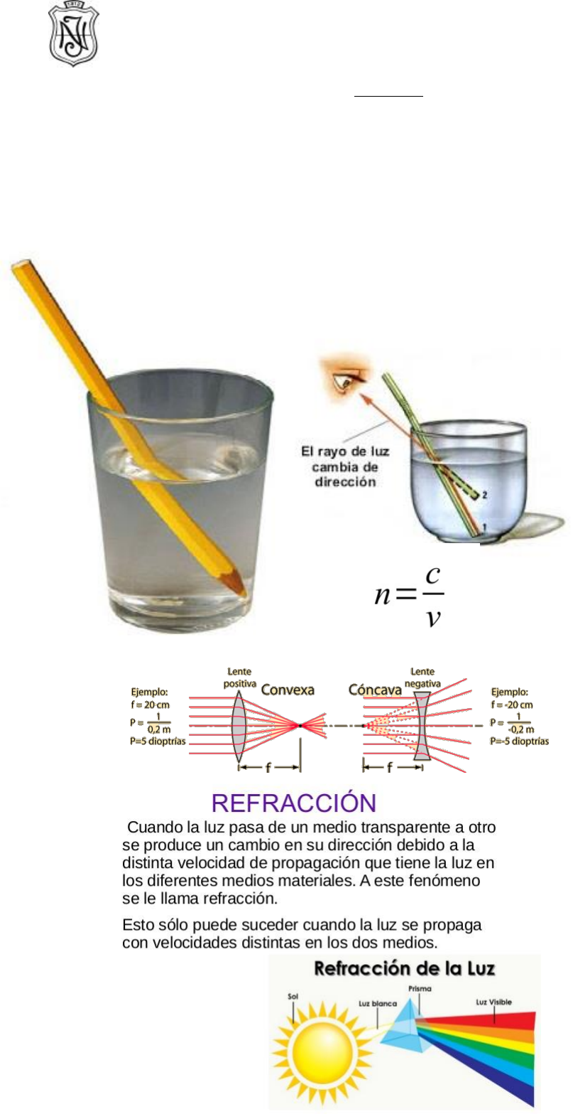 INSTITUTO NACIONAL Departamento de Física COORDINACION :G.R.R. 1 ÓPTICA III REFRACCION INSTITUTO NACIONAL Departamento de Física COORDINACION :G.R.R. 2 Rayo Normal Incidente I Medio 1 Medio 2 r Rayo refractado Figura Nº 2 OBJETIVOS: Ud. Deberá ser capaz de : 1. definir la refracción de la luz 2. comprender el comportamiento que tiene la luz frente a distintos medios 3. describir la ley de refracción 4. describir fenómenos ópticos asociados a la refracción 5. describir el comportamiento de distintos medios renfringentes ,como por ejemplo ,prismas ,lentes y otros. LA REFRACCIÓN DE LA LUZ Cuando un haz de luz que viaja por un medio y se encuentra con otro medio transparente, parte de él se refleja y otra parte ingresa al segundo medio produciéndose el fenómeno de la refracción, las figuras siguientes muestran el fenómeno descrito anteriormente. En la figura N° 1(a) se muestra un haz de luz que viaja por el aire, incide en el vidrio, parte de él se refleja y otra parte se refracta acercándose a la normal. En la figura N° 1 (b) se muestra un rayo de luz que viaja del aire al agua, en este caso el rayo refractado se acerca a la normal. En el fenómeno de la refracción la rapidez de propagación de la luz siempre cambia y la dirección de propagación del rayo de luz solo cambia, cuando el rayo incide en forma oblicua sobre la superficie de separación. la figura Nº 2 muestra a un rayo incidente, la normal y al rayo refractado. El ángulo i corresponde al ángulo incidente y el ángulo r corresponde al ángulo de refracción, el que se forma entre la normal y el rayo refractado. Willebrord Snell, astrónomo danés, logro establecer una ley matemática que relaciona la rapidez de la luz en el primer medio con la rapidez de la luz en el segundo medio y los ángulos de incidencia y de refracción, respectivamente. Esta ley recibe el nombre de ley de Snell en honor a su descubridor. (Ecuación N° 1) Ecc. N°1 Si el medio 1 es el vació, la rapidez de la luz en ese se simboliza con la letra c y la rapidez de la luz en el medio 2 es v, al efectuar el cociente entre las respectivas rapideces se obtiene una constante, que recibe el nombre de índice de refracción absoluto (n) (ecuación N° 2) Ecc. N° 2 c: rapidez de la luz en el vacío v: rapidez de la luz en el segundo medio n: índice de refracción FiguraN°1(a) 2 1 v v refractadoángulosen incidenteángulosen v c n INSTITUTO NACIONAL Departamento de Física COORDINACION :G.R.R. 3 Tabla de índice de refracción absoluta para la luz en algunas sustancias Sustancia índice de refracción absoluto (n) Aire Agua Vidrio crown Glicerina diamante 1,0 1,3 1,5 1,4 2,4 En el fenómeno de la refracción luminosa, la rapidez de propagación cambia cuando la luz pasa de un medio a otro, la onda luminosa mantiene constante su frecuencia, cambiando su longitud de onda, por ejemplo, cuando un rayo de luz monocromático viaja del aire al agua, la luz al ingresar al agua disminuye su rapidez en alrededor de un 25 %. Esta luz monocromática mantiene su frecuencia y disminuye su longitud de onda, por ejemplo, cuando un rayo de luz de color rojo viaja del aire al agua, el color de la luz no cambia, de lo anterior se deduce que el color en la luz esta relacionado con la frecuencia de la onda luminosa y no con su longitud ni con su rapidez. Cuando un rayo de luz incide en forma oblicua, su dirección de propagación cambia, acercándose o alejándose de la normal. En la siguiente figura se muestra dos ejemplos de rayos de luz que cambian de medio. En el diagrama (a) la luz pasa de un medio menos denso a uno más denso, el rayo refractado se acerca a la normal. En el diagrama (b) la luz pasa de un medio más denso a uno menos denso, el rayo refractado se aleja de la normal. Reflexión total interna Si un rayo de luz que es emitido por un punto O, como lo muestra la figura, viaja de un medio 1 a un medio 2, siendo n1 > n2, este rayo al refractarse se aleja de la normal. También sabemos que si el ángulo de incidencia también aumenta el ángulo de refracción, cumpliéndose la ley de Snell, si se sigue aumentando el ángulo de incidencia llegara a un valor tal, que el rayo refractado será tangente a la superficie de separación de las dos medios, por lo que el ángulo de refracción tendrá un valor de 90°. El ángulo de incidencia que corresponde a este ángulo de refracción, recibe el nombre de ángulo límite. Cualquier otro rayo que parta del mismo punto y el ángulo de incidencia sea mayor que el ángulo límite, este rayo no pasará al segundo medio, se reflejará en la superficie de separación de los dos medios, propagándose nuevamente en el primer medio (según figura). Este fenómeno recibe el nombre de reflexión total interna, porque en esta situación el rayo se refleja totalmente, lo cual no sucede ni en los mejores espejos, ya que siempre aunque se una pequeña parte del rayo, se absorbe. Figura Nº 3 INSTITUTO NACIONAL Departamento de Física COORDINACION :G.R.R. 4 Este fenómeno se utiliza en la fabricación de algunos instrumentos ópticos, reemplazando a los espejos por un prisma isósceles (figura a). La figura (b) muestra un rayo de luz que ingresa perpendicular a la cara AB del prisma, incide en la cara BC con un ángulo de incidencia de 45°, el rayo se refleja y sale por la cara AC del prisma. REFRACCIÓN EN LENTES DELGADOS Una lente es un sistema óptico formado por dos superficies transparentes, en la cual a lo menos una de ellas es curva. Los rayos de luz que provienen desde del infinito, atraviesan las dos superficies de la lente, por lo cual aplicaremos a cada una de ellas las propiedades estudiadas en la refracción Una lente se fabrica con un material transparente, como vidrio o plástico, con un índice de refracción mayor que el aire, limitado por caras esféricas o a lo menos una de ellas es esférica. En la figura adjunta se representa la construcción de una lenta con sus dos caras curvas. Clasificación d