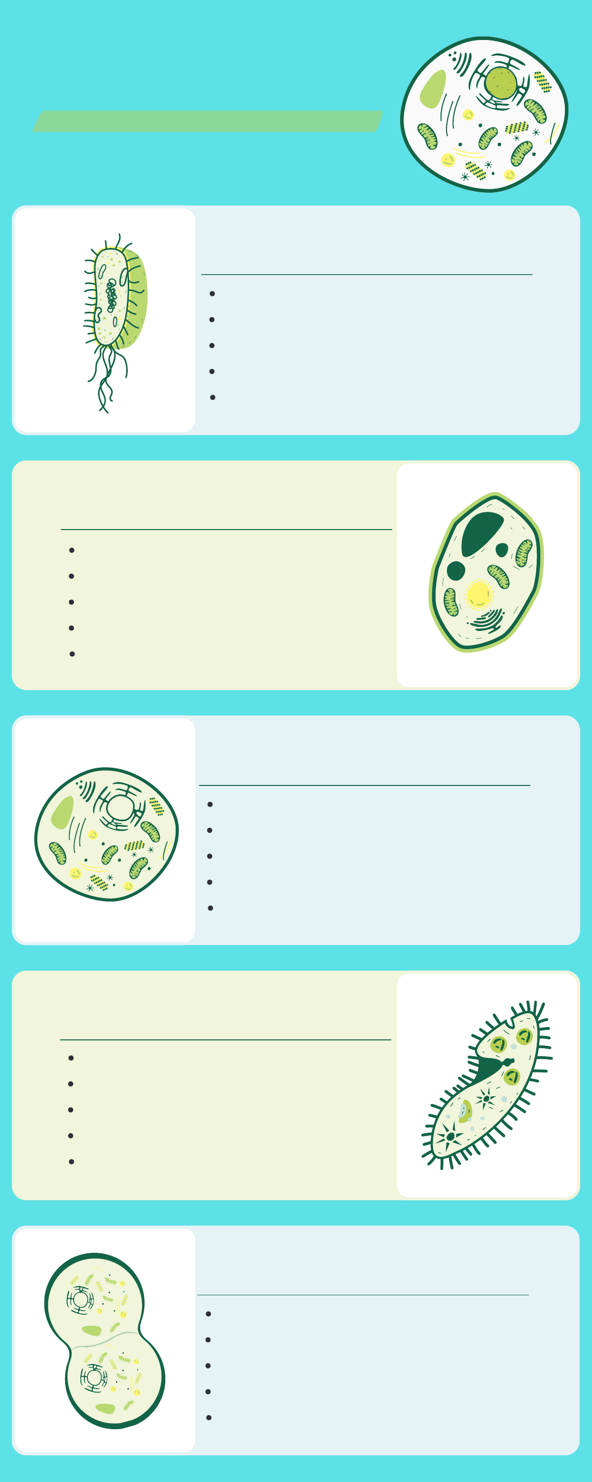 Categorías de Células Existen distintas categorías de células basadas en su estructura, función y características. Procariota Vegetal Animal Fúngica Protista Sin núcleo definido. Organismos unicelulares o colonias. Material genético disperso en el citoplasma. Pared celular en bacterias y arqueas. Ausencia de orgánulos membranosos. Eucariotas multicelulares. Pared celular compuesta de celulosa. Cloroplastos para la fotosíntesis. Células autótrofas. Vacuolas para almacenamiento y soporte. Eucariotas multicelulares. Poseen núcleo definido. Células heterótrofas. Carecen de pared celular. Movilidad: flagelos, cilios o ameboides. Eucariotas unicelulares o colonias. Variedad de formas de vida y hábitats. Algunos poseen cloroplastos. Estructuras especializadas para movilidad. Autótrofos o heterótrofos según el tipo. Eucariotas con núcleo definido. Poseen pared celular de quitina. Reproducción por esporas. Heterótrofas, absorben nutrientes. Importantes en la descomposición.