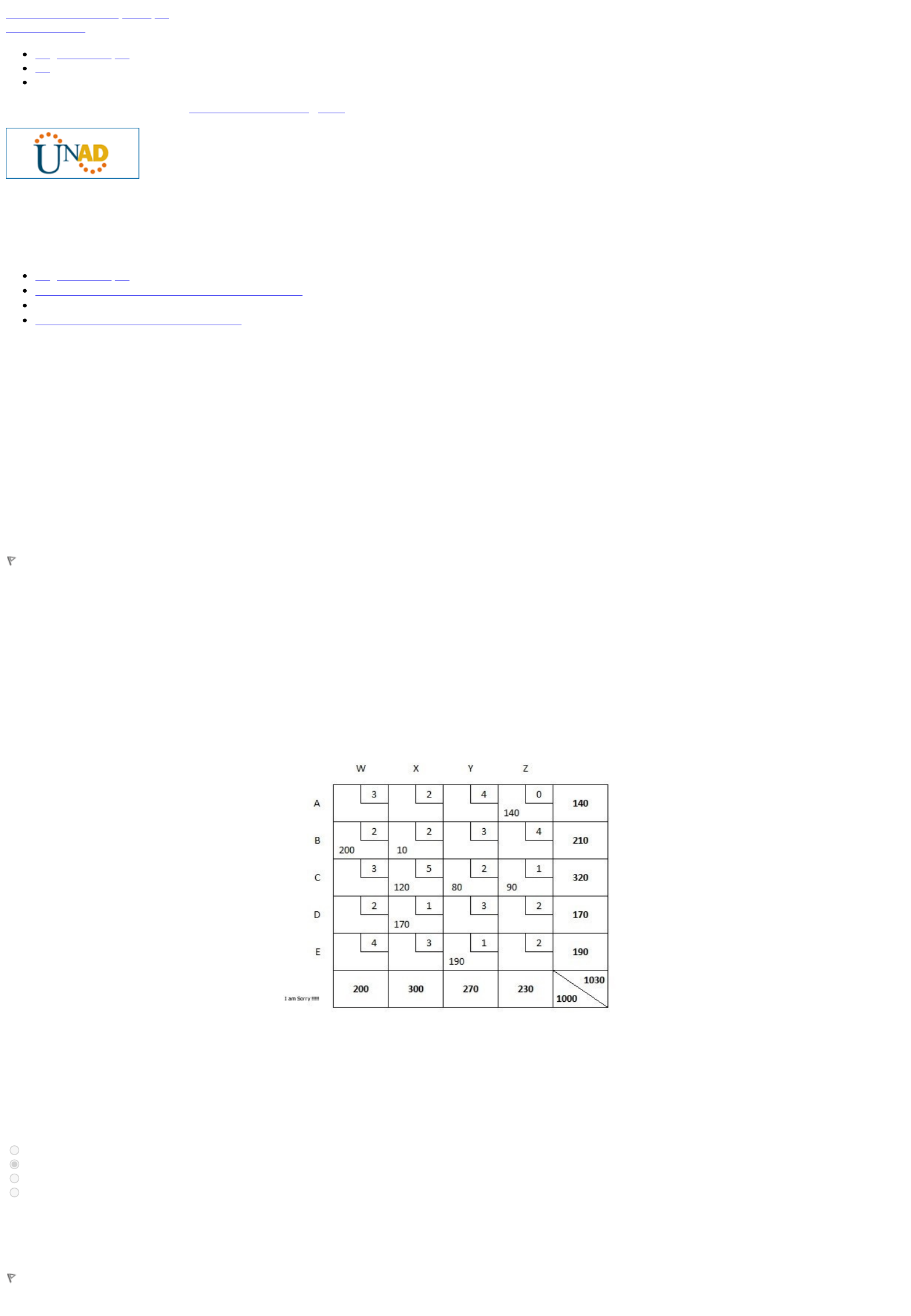 Saltar a contenido principal Show Header Página Principal en es Usted se ha identificado como LINA JOHANA NOVA (Salir) METODOS DETERMINISTICOS 102016A_471 Ruta a la página Página Principal / ► METODOS DETERMINISTICOS 102016A_471 / ► Entorno de evaluación y seguimiento / ► Fase 3 - Evaluación de la Unidad 1 Comenzado el jueves, 22 de marzo de 2018, 17:31 Estado Finalizado Finalizado en jueves, 22 de marzo de 2018, 18:19 Tiempo empleado 48 minutos 31 segundos Puntos 7,0/8,0 Calificación 43,8 de 50,0 (88%) Comentario - Excelente. Has obtenido un muy buen resultado. Pregunta 1 Finalizado Puntúa 1,0 sobre 1,0 Marcar pregunta Enunciado de la pregunta Selección Múltiple con Múltiple Respuesta Este tipo de preguntas consta de un enunciado, problema o contexto a partir del cual se plantean cuatro opciones numeradas de 1 a 4, usted deberá seleccionar la combinación de dos opciones que responda adecuadamente a la pregunta. Enunciado: De acuerdo a la información que se presenta en la siguiente tabla donde se soluciona un problema de transportes por el método de los Costos Mínimos, puede afirmarse, que: 1. El envio más económico resultan desde la ciudad E. 2. Desde C no se debe hacer ninguna clase de envíos según el método de los Costos Minimos. 3. El envio desde A hasta Z es $0, a pesar que tiene asignación de 140 unidades. 4.Los despachos desde C hacia X,Y y Z cuestan $850. Seleccione una: a. 1 y 2 son correctas. b. 3 y 4 son correctas. c. 2 y 4 son correctas. d. 1 y 3 son correctas. Pregunta 2 Finalizado Puntúa 1,0 sobre 1,0 Marcar pregunta http://campus08.unad.edu.co/ecbti35/mod/quiz/review.php?attempt=15775#maincontent javascript:showHeader(); http://campus08.unad.edu.co/ecbti35/ http://campus08.unad.edu.co/ecbti35/?lang=en http://campus08.unad.edu.co/ecbti35/user/profile.php?id=552345 http://campus08.unad.edu.co/ecbti35/login/logout.php?sesskey=e81HTxqcOY http://campus08.unad.edu.co/ecbti35/?redirect=0 http://campus08.unad.edu.co/ecbti35/ http://campus08.unad.edu.co/ecbti35/course/view.php?id=28 http://campus08.unad.edu.co/ecbti35/mod/quiz/view.php?id=1909 Enunciado de la pregunta Selección Múltiple con Múltiple Respuesta Este tipo de preguntas consta de un enunciado, problema o contexto a partir del cual se plantean cuatro opciones numeradas de 1 a 4, usted deberá seleccionar la combinación de dos opciones que responda adecuadamente a la pregunta. Enunciado: En la siguiente matriz se expresan los costos de envio por unidad de ciertas piezas automotrices (repuestos para motor), las ofertas y demandas de ciertos origenes hacia sus destinos. Según el método de transportes de la Esquina Noroeste, es correcto afirmar, que: 1. El costo total del envio desde todos los origenes hacia sus destinos asignados es $1480 2. La ruta asignada de envio desde todos los origenes hacia sus destinos son: (A,W), (A,X), (B,X), (B,Y), (C,Y), (C,Z) y (D,Z) 3. La matriz de ofertas y demandas no está balanceada. 4. La ruta (C,Z) correspondiente al menor costo del problema queda sin asignación después del algoritmo de la ENO. Seleccione una: a. 2 y 4 son correctas. b. 1 y 3 son correctas. c. 1 y 2 son correctas. d. 3 y 4 son correctas. Pregunta 3 Finalizado Puntúa 1,0 sobre 1,0 Marcar pregunta Enunciado de la pregunta Selección Múltiple con Única Respuesta: A continuación, usted encontrará preguntas que se desarrollan en torno a un enunciado, problema o contexto, frente al cual, usted debe seleccionar aquella opción que responda correctamente al ítem planteado entre cuatro identificadas con las letras A, B, C, D. Una vez la seleccione, márquela en su hoja de respuestas rellenando el óvalo correspondiente. Se requiere distribuir la producción de tres plantas en toneladas de granos hacia tres distribuidores con demandas diferentes, según la tabla siguiente donde se muestran los costos de envío desde los destinos hacia las fuentes, por el método de los Costos Minimos defina la ruta de asignación: Seleccione una: a. Planta 1 hacia Destino 1; Planta 1 hacia Destino 2; Planta 2 hacia Destino 3; Planta 3 hacia Destino 1 y Planta 3 hacia Destino 2. b. Planta 1 hacia Destino 1; Planta 1 hacia Destino 3; Planta 2 hacia Destino 3; Planta 3 hacia Destino 1 y Planta 3 hacia Destino 3. c. Planta 1 hacia Destino 2; Planta 1 hacia Destino 3; Planta 2 hacia Destino 3; Planta 3 hacia Destino 1 y Planta 3 hacia Destino 3. d. Planta 1 hacia Destino 1; Planta 1 hacia Destino 3; Planta 2 hacia Destino 3; Planta 3 hacia Destino 1 y Planta 3 hacia Destino 2. Pregunta 4 Finalizado Puntúa 1,0 sobre 1,0 Marcar pregunta Enunciado de la pregunta Selección Múltiple con Única Respuesta: A continuación, usted encontrará preguntas que se desarrollan en torno a un enunciado, problema o contexto, frente al cual, usted debe seleccionar aquella opción que responda correctamente al ítem planteado entre cuatro identificadas con las letras A, B, C, D. Una vez la seleccione, márquela en su hoja de respuestas rellenando el óvalo correspondiente. Click Aqui para observar el video de apoyo Una empresa dedicada a la fabricación de productos a base de pulpa de fruta, desea en la investigación de sus modelos de transporte de mercancías determinar por el método Esquina Noroeste la distribución de su última producción desde los almacenes 1, 2, 3 y 4 a las ciudades Cali, Armenia, https://youtu.be/uvR0w3fhi1g Pereira y Tunja. Los datos de Oferta, demanda y costos se presentan en la tabla: El costo de envío desde los Almacenes hacia la ciudad de Tunja (Costo = Cantidad enviada desde los Almacenes * Valor del envío por unidad desde los Almacenes hacia Tunja), es: Seleccione una: a. $7.900 b. $8.360 c. $8.450 d. $8.200 Pregunta 5 Finalizado Puntúa 0,0 sobre 1,0 Marcar pregunta Enunciado de la pregunta Selección Múltiple con Única Respuesta: A continuación, usted encontrará preguntas que se desarrollan en torno a un enunciado, problema o contexto, frente al cual, usted debe seleccionar aquella opci