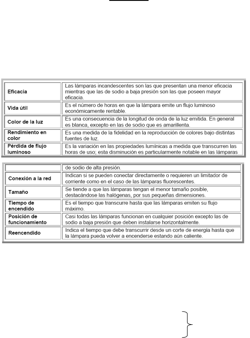 LÁMPARAS FUENTES BIBLIOGRAFICAS 1/ Instalaciones Eléctricas en edificios. Nestor Quadri 2/ Introducción a las instalaciones eléctricas de los inmuebles. Alberto Luis Farina 3/ Manuales de Luminotecnia. Oscam y Phillips PRINCIPALES CARACTERISTICAS DE LA LAMPARAS CLASIFICACION SEGÚN SU FUNCIONAMIENTO A) INCANDESCENTES: 1 – NORMALES 2 - HALOGENADAS B) DE DESCARGA: 1 - FLUORESCENTES TUBULARES MERCURIO BAJA PRESION 2 - FLUORESCENTES COMPACTAS 3 - VAPOR DE MERCURIO ALTA PRESION 4 - VAPOR DE SODIO (ALTA Y BAJA PRESION) 5 - MERCURIO HALOGENADO 6 - MEZCLADORAS A) INCANDESCENTES RADIACION EMITIDA POR UN FILAMENTO METALICO EN ESTADO DE INCANDESCENCIA, DEBIDO AL PASO DE UNA CORRIENTE POR EL. A 1) INCANDESCENTES NORMALES: Esquema: Filamento: 1880 = Filamento carbono 1910 = Filamento tungsteno o wolframio Alta temperatura de fusión y bajo grado de evaporación Filamentos comunes (220v) y reforzados (240v) Gas relleno: Gas inerte (nitrógeno u otro gas) Hace que se reduzca la evaporación del filamento, por lo tanto es posible operar a temperaturas más altas. A mayor presión del gas, menor evaporación del metal. Nota: el metal del filamento se va evaporando a la temperatura de incandescencia, acortando la vida útil de la lámpara. “La lámpara se oscurece” Ampolla: Evita el contacto del filamento con el oxígeno del aire (se quemaría el filamento) Contiene el gas inerte Función decorativa Formas: comunes, gota, vela Tipo de vidrio: claro, perlado, luz día Terminación superficial: acabado mate, opalinas, coloreadas Casquillo: Parte de la lámpara que se une al portalámpara Materiales: latón, aluminio, níquel Roscas Edison: E10 E14 E27 Uso frecuente E40 Uso industrial (también denominada Goliat) Bayoneta Vida útil 1000hs Rendimiento lumínico 10 a 15 lm/w Temperatura 2900ºK (luz calida) Índice de reproducción del color Ra = 100 (muy buena) A 2) HALOGENAS TAMBIEN SON DEL TIPO INCANDESCENTES Aparición: 1960 Filamento: Filamento tungsteno o wolframio Alta temperatura de fusión y bajo grado de evaporación Filamentos comunes (220v) y reforzados (240v) Gas relleno: Gas inerte (nitrógeno o argón). Idem propiedades para lámparas incandescentes Además aparece un componente halógeno (fluor, cloro, bromo, yodo, cripton) Nota: el metal del filamento se va evaporando a la temperatura de incandescencia, acortando la vida útil de la lámpara. “La lámpara se oscurece” Funcionamiento: El gas halógeno previene el oscurecimiento de la lámpara. Dicho gas se combina con las partículas que se desprenden del filamento y hace que no se condensen en las paredes de la ampolla. Existen procesos regenerativos del gas. Para esto, la temperatura de la ampolla debe ser lo mas alta posible. Esto hace que: a) Las ampollas sean mas pequeñas que la lámpara incandescente normal b) El vidrio tiene que ser de un material resistente a las altas temperaturas (cuarzo) Tipos de lámpara: a) De tensión de red (220v) Terminal simple (luminarias pequeñas) Terminal doble (reflectores) Doble envoltura (evita problemas de contacto) Reflectoras con vidrio prensado b) Tensión indistinta (12v ó 220v) Reflectoras dicroicas Bi - Pin Nota: una lámpara dicroica, desde el punto de vista óptico, un material que por un lado deja pasar el calor hacia la parte trasera de la misma, y que por otro lado refleja la luz visible hacia la parte de adelante. Vida útil 2000hs a 4000hs Rendimiento lumínico 20 a 25 lm/w Temperatura 2800ºK a 3200ºK (luz calida, con mayor predomino del color blanco) Índice de reproducción del color Ra = 100 (muy buena) Ventajas respecto de incandescentes normales 30% de luz más blanca Mas pequeñas No pierden intensidad lumínica, no se oscurecen Mayor vida útil Mayor rendimiento lumínico Se encuentran fuera de la ley que prohíbe el uso de lámparas incandescentes normales (Ley 26.473 – 2010 y decreto 2060-2010) Desventajas respecto de incandescentes normales Uso de transformadores para lámparas de 12v No se pueden tocar directamente con los dedos. Por el contacto con la piel, se altera la composición del cuarzo. “Desvitrificación” Calentamiento excesivo B) DE DESCARGA: LA EMISION LUMINOSA ES PRODUCIDA POR EL PASO DE UNA CORRIENTE A TRAVES DE UNA ATMOSFERA DE VAPOR O GAS, EN VEZ DE UN FILAMENTO METALICO, COMO EN EL CASO DE LAMPARAS INCANDESCENTES. 1 - FLUORESCENTES TUBULARES MERCURIO BAJA PRESION 2 - FLUORESCENTES COMPACTAS 3 - VAPOR DE MERCURIO ALTA PRESION 4 - VAPOR DE SODIO (ALTA Y BAJA PRESION) 5 - MERCURIO HALOGENADO 5 - MEZCLADORAS B 1) FLUORESCENTES TUBULARES Esquema: Componentes: Tubo de vidrio que contiene mercurio y gases a baja presión (argón o kripton) Substancias fluorescentes en el interior del tubo (silicatos o tungstatos de berilio, cadmio, magnesio). De acuerdo a esta substancia, se tienen distintos tipos de tubos: Fósforos Standard Ra=65 Trifosforos Ra=80 Multifosforos Ra = 90 Electrodos de filamentos de tungsteno (ídem lámparas incandescentes) Base y clavija para conexión a red eléctrica Arrancador Balasto o reactancia Funcionamiento: Al producirse una descarga eléctrica entre los electrodos situados en extremos opuestos, se origina una radiación ultravioleta debido al paso de dicha corriente por el seno del vapor de mercurio. La substancia fluorescente que se encuentra en el interior del tubo transforma la radiación ultravioleta en luz visible, y la temperatura de color producida en este proceso, depende del componente químico de esta substancia. En el instante inicial de encendido, la tensión de 220v no es suficiente como para vencer la resistencia inicial en frío de la lámpara y originar la descarga, por lo que se coloca en los electrodos filamentos de tungsteno, que al encenderse, se calientan y activan el vapor de mercurio. Al producirse la descarga en el tubo, los filamentos se desconectan. Arrancador: Es el dispositivo encargado de la conexión / desconexión de los filamentos de tungsteno. Consta de 2 electrodos, uno es fijo, y el 