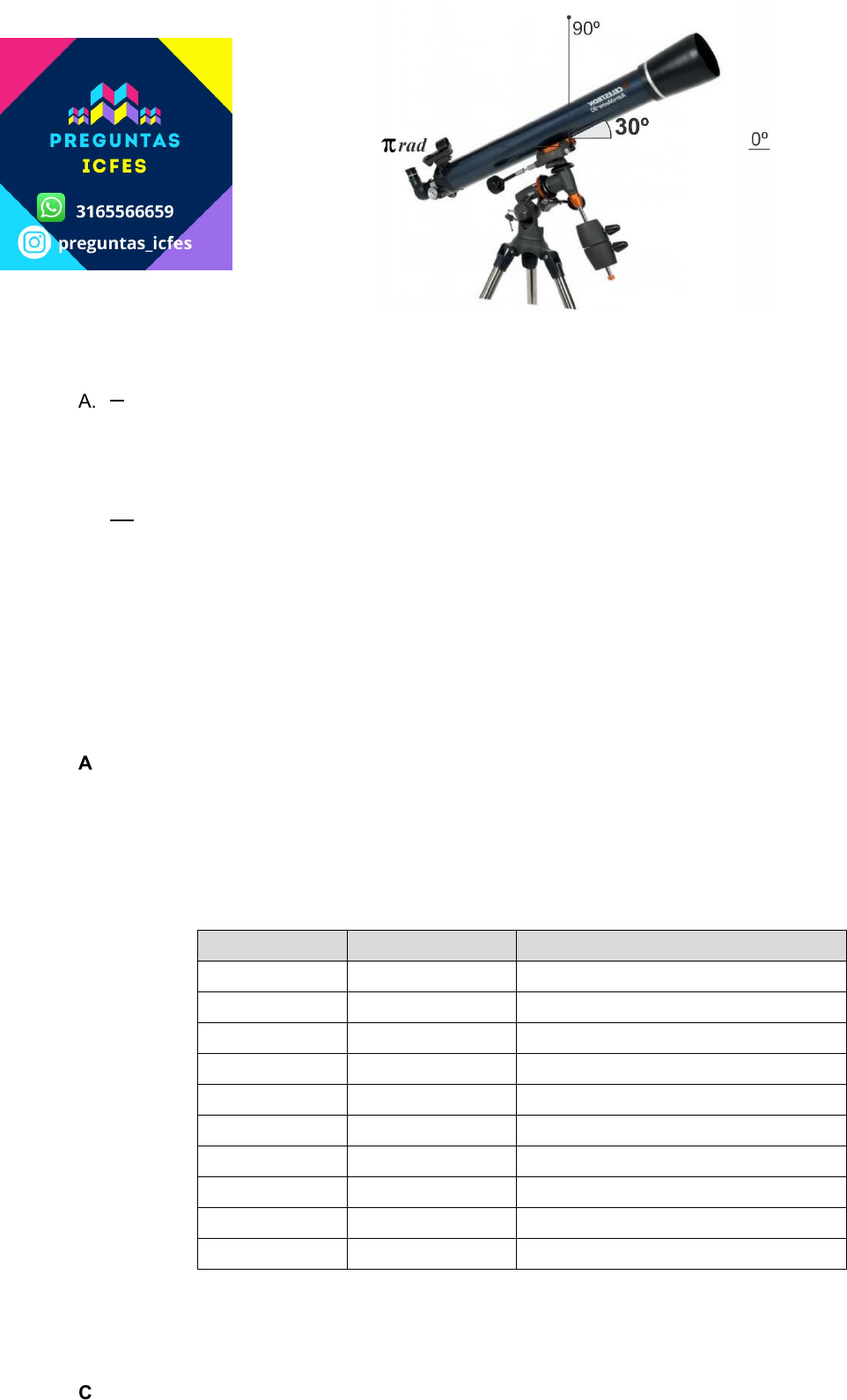 MATEMÁTICAS 2022 @preguntas_icfes 1. En la clase de Observación Astronómica, Lucía debe configurar el ángulo de inclinación del telescopio a 30º, como se muestra en la figura. El telescopio cuenta con un sistema digital en el que se ingresa el ángulo de inclinación, en radianes, y este se acomoda automáticamente. ¿Cuál es el valor del ángulo en radianes que debe ingresar Lucía? A. 𝜋 6 𝑟𝑎𝑑 B. 6𝜋 𝑟𝑎𝑑 C. 𝜋 12 𝑟𝑎𝑑 D. 12𝜋 𝑟𝑎𝑑 2. En un campamento escolar, se reciben 25 niños durante 4 días y se preparan 100 meriendas para alimentarlos durante su estadía. ¿Cuántas meriendas se deben preparar para alimentar a 50 niños durante 7 días? A. 350 B. 200 C. 175 D. 114 3. A 10 personas que asisten a un gimnasio se les realizó una encuesta. La tabla relaciona la edad de cada una de ellas y el número de veces que compran ropa deportiva durante el mes. Participante Edad (años) Número de compras mensuales 1 18 3 2 25 2 3 23 3 4 35 2 5 36 1 6 18 4 7 19 2 8 31 1 9 32 2 10 27 3 De acuerdo con la información anterior, ¿cuál de los siguientes datos es posible calcular? A. La cantidad de ropa deportiva que compraron las personas encuestadas. B. La edad promedio de los clientes que asisten al gimnasio. C. El promedio de compras mensuales de las personas encuestadas. D. El rango de edad de las personas que asisten al gimnasio. 4. El siguiente procedimiento se debe realizar en la rutina de verificación de un programa informático. Paso I. Tomar un número x y hacer la división 1 x . Paso II. Multiplicar el resultado del paso I por x. Paso III. Simplificar el resultado obtenido en el paso II. ¿Qué valores puede tomar x para que sea posible realizar el procedimiento? A. Todos los números reales. B. Únicamente los números reales diferentes de 1. C. Todos los números reales diferentes de 0. D. Únicamente los números reales positivos. 5. El Departamento Administrativo Nacional de Estadística (DANE) realiza cada año mediciones de la pobreza en Colombia para determinar el índice de pobreza multidimensional (IPM). La tabla muestra la “incidencia de la pobreza por el IPM” para algunas regiones entre 2011 y 2015. Año Pacífica Antioquia Bogotá Central 2011 41,4 25,7 11,9 30,7 2012 36,3 21,7 11,1 26,7 2013 37,6 22,4 8,7 26,1 2014 34,6 19,5 5,4 28,1 2015 33,8 18,7 4,7 22,1 Tabla. Fuente: DANE La gráfica muestra la “incidencia de la pobreza por gel IPM” para algunas regiones entre 2011 y 2015. ¿La información de los datos de la gráfica es la misma que la información presentada en la tabla? A. Sí, porque la información incluida en la gráfica es semejante a la información presentada en la tabla, para las regiones en mención. B. No, porque en vez de graficar los datos de Antioquia, se graficaron los datos de la región Central. C. No, porque los datos de la gráfica de Antioquia en 2012 y 2013 y de Bogotá en 2015 son diferentes a los datos presentados en la tabla. D. Sí, porque los datos de la gráfica de Antioquia 2013 y de la región Central en 2012 corresponden a los datos presentados en la tabla. 6. La tabla muestra el número de estudiantes que ingresaron en una universidad en los últimos 5 años. Año Total de estudiantes 1 4.000 2 5.700 3 5.000 4 7.000 5 4.500 Tabla De acuerdo con la información anterior, ¿cuál de las siguientes gráficas muestra los datos de la tabla ordenados de menor a mayor número de estudiantes? A. B. C. D. Gráfica. Fuente: DANE 41,4 36,3 37,6 34,6 33,8 25,7 20,5 18,3 19,5 18,7 11,9 11,1 8,7 5,4 7,6 30,7 26,7 26,1 28,1 22,1 0 5 10 15 20 25 30 35 40 45 2 0 1 1 2 0 1 2 2 0 1 3 2 0 1 4 2 0 1 5 Pacífica Antioquia Bogotá Central - 1.000 2.000 3.000 4.000 5.000 6.000 7.000 8.000 1 5 3 2 4 C a n ti d a d d e e s tu d ia n te s Año - 1.000 2.000 3.000 4.000 5.000 6.000 7.000 8.000 1 2 3 4 5 C a n ti d a d d e e s tu d ia n te s Año - 1.000 2.000 3.000 4.000 5.000 6.000 7.000 8.000 4 2 3 5 1 C a n ti d a d d e e s tu d ia n te s Año - 1.000 2.000 3.000 4.000 5.000 6.000 7.000 8.000 5 2 1 4 3 C a n ti d a d d e e s tu d ia n te s Año 7. En una bodega de 10 metros de ancho, 10 metros de profundidad y 12 metros de altura se planea almacenar la mayor cantidad posible de cajas cúbicas de 2 metros de lado. Jorge efectúa el siguiente procedimiento para calcular la cantidad máxima de cajas que se pueden almacenar en la bodega. Paso 1. Calcular el área superficial de la bodega. Paso 2. Calcular el volumen de la bodega. Paso 3. Sumar los resultados de los pasos 1 y 2. Paso 4. Calcular el volumen de una caja. Paso 5. Dividir el volumen de la bodega entre el volumen de una caja. Respecto a los pasos 1 y 3 que utilizó Jorge, es correcto afirmar que A. deben ejecutarse, porque sumando el área superficial y el volumen se obtiene la capacidad de la bodega. B. deben eliminarse, porque del área superficial se obtiene la capacidad de la bodega, por lo que sumar el volumen sobra. C. deben ejecutarse, porque el área superficial determina cuántas cajas caen en el piso de la bodega. D. deben eliminarse, porque solamente al calcular el volumen se obtiene la capacidad de la bodega. 8. En la gráfica se presenta la probabilidad de que una variable tome los valores 𝑥1, 𝑥2, 𝑥3, 𝑥4, 𝑥5, 𝑥6, 𝑥7 y 𝑥8. ¿Cuál tabla muestra los valores que tienen asociada una probabilidad menos que 0,1? A. B. C. D. 9. La figura muestra una cancha de fútbol y sus medidas. Figura Si una persona da 15 vueltas a la cancha, ¿cuántos metros recorre en total? A. 300 m. B. 2.250 m. C. 4.500 m. D. 86.400. 10. En un pueblo se cuenta con el programa de comedores comunitarios y se quiere saber qué tan exitoso ha sido. Para esto, se registra en una tabla los datos de la cantidad de almuerzos proporcionados durante los primeros seis meses del año. Mes Almuerzos proporcionados Enero 1.500 Febrero 1.550 Marzo 1.700 Abril 1.850 Mayo 2.600 Junio 2.650 Tabla Uno de los coordinadores del programa plantea la siguiente grá