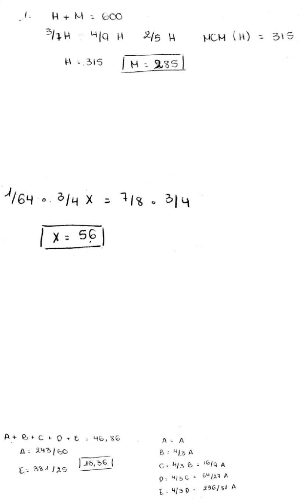 1. En un congreso participaron 600 personas. De los asistentes varones, se ha podido observar que los 3/7 eran abogados, los 4/9 eran médicos y los 2/5 eran economistas. ¿Cuántas damas asistieron al congreso? R: 285 2. La colilla de un cigarro es 1/4 del cigarro. Un fumador consume los 7/8 de la parte fumable y en cada pitada consume 1/64 de la parte fumable. ¿Cuántas pitadas da el fumador? R: 56 3. A un alambre de 46,86 m de longitud se le hizo 4 cortes, de manera que la longitud de cada trozo es igual a la del inmediato anterior, más 1/3 de dicha longitud. Halla la longitud del trozo más grande. R: 15,36 m 4. Una bomba demora 10 horas 25 minutos para llenar un reservorio. Cuando el tanque está lleno hasta 1/5 se malogra y su rendimiento disminuye en 1/3. ¿Cuánto tiempo tardará ¡a bomba para llenar el reservorio? R: 14h35min 5. De un depósito lleno de alcohol se retira un séptimo de su contenido y se le reemplaza por agua; luego se vuelve a retirar un séptimo de esta mezcla y se le reemplaza por agua, la cantidad de alcohol puro que aún queda excede en 20 L a los dos tercios de la capacidad del depósito. Calcular esta capacidad. R: 294 6. Dos caños llenan un tanque en 10 horas, ¿cuánto tiempo empleará uno de ellos solo, si el otro puede llenarlo en 18 horas? R: 22 h 30min 7. El denominador de una fracción excede al numerador en una unidad. Si se agrega a ambos miembros de la fracción una unidad, la nueva fracción excede a la original en 1/72. ¿Cuál es la fracción original? R: 7/8 8. En un puesto de frutas había cierto número de naranjas. Un cliente compró los 3/5 de las naranjas que había más 4 naranjas; otro cliente compró los 4/9 de las que quedaban y 2 más; un tercer cliente compró la mitad de las que quedaban y 7 más, quedando finalmente 2 naranjas. ¿Cuántas naranjas había en el puesto inicialmente? R: 100 9. En una reunión hay hombres y mujeres, siendo el número de hombres al número de personas como 3 es a 8 y la diferencia entre los números de hombres y mujeres 24. ¿Cuál será la relación entre hombres y mujeres si se retiran 33 mujeres? R: 4/3 10. Si Manuel le da a Pedro 10 m de ventaja para una carrera de 100 m y Pedro le da a Carlos una ventaja de 20 m para una carrera de 180 m, ¿cuántos metros de ventaja debe dar Manuel a Carlos para una carrera de 200 m? R: 40 11. En una discoteca se observa que por cada 8 mujeres había 5 hombres, además el número de mujeres excede al número de hombres en 21. ¿Cuál será la nueva relación de hombres a mujeres si se retiran 14 parejas? R: 2 12. La edad de un padre es tres veces mayor que la de su hijo; si dentro de 10 años la suma de sus edades será 120 años, hallar la edad del padre. R: 80 13. En una competencia de 1600 m A le ganó a B por 400 metros y B le ganó a C por 100 m. ¿Por cuántos metros le ganó A a C? R: 475 14. Para elegir los nuevos dirigentes de un club se presentan dos listas: A y B, 240 socios se hacen presentes para votar. En una votación de sondeo inicial la elección favorece a B en la proporción de 3 a 2, pero en la votación legal ganó A en una proporción de 5 a 3. ¿Cuántos que votaron ¡inicialmente por B cambiaron por A? R: 54 15. De una canasta llena con manzanas se observó que el peso de todas las manzanas es al peso total como 3 a 4; si se vendieron 5 manzanas, la nueva relación es de 2 a 3. ¿Cuántas manzanas quedaron luego de ello, si cada una pesa 60 g? R: 10 16. En un recipiente de 30 litros y otro de 74 litros, ¿cuántos litros deben ser transferidos del segundo recipiente al primero de manera que los contenidos se encuentren en la razón de 3:5? R: 9 17. Hugo, Luis y Paco han hecho 234 m de una zanja, el rendimiento de Hugo es el 120% del de Luis y el de Paco es el 140% del de Luis. ¿Cuántos metros hizo Paco? R: 91 18. El rendimiento de dos hermanos es como 1 a 4. Si juntos hacen un trabajo en 80 días. ¿Cuánto tiempo se demorará el más rápido en hacer solo el trabajo? R: 100 19. Una guarnición de 1800 hombres tiene víveres para 3 meses a razón de 0,5 kg de comida diaria. Debido a que la guarnición se incrementó en un cierto número de hombres la ración se debe disminuir a 0,4 kg de comida diaria. ¿A cuántos kilogramos debería reducirse dicha ración para que los víveres duren un mes más? R: 0,3 20. Tres motores, trabajando durante 15 días a razón de 10 horas diarias consumen en total 25 galones de petróleo. ¿Cuántas horas diarias menos deben funcionar los motores sabiendo que se utilizarán 6 motores durante 20 días y sólo se dispone de 18 galones de gasolina? R: 7,3 21. Un grupo de 50 obreros pueden terminar una obra en 4 semanas. Al cabo de 4 días de trabajo se aumenta cierto número de obreros, de modo que en 16 días más terminaron lo que faltaba de la obra. La cantidad de obreros que se incorporaron es: R: 25 22. Se contrataron 25 obreros para que terminen una obra en 21 días trabajando 8 horas diarias. Luego de 6 días se acordó que la obra quede terminada 5 días antes del plazo establecido. ¿Cuántos obreros más se tuvieron que contratar, sabiendo que se Incrementó en 2 h el trabajo diario? R:5 23. Olga tiene caramelos en 4 bolsitas. En una de las bolsas hay 10 caramelos y en cada una de las otras tres bolsas hay X caramelos. Olga come 3X caramelos de la primera, y 2 caramelos de cada una de las otras tres bolsas. ¿Cuántos caramelos le quedan a Olga? R: 4 24. El plano de un terreno rectangular correspondiente a una reserva forestal, de 78 km de perímetro. Se divide en 11 parcelas rectangulares idénticas cuyos perímetros suman 242 km. ¿Cuál es el área de la reserva? R: 308 km 25. El volumen de un paralelepípedo rectángulo es 2 013m^3 y sus dimensiones son números enteros mayores que uno. ¿Cuál es la mayor área que puede tener una de sus caras? R: 671m^2 26. En una lista de cinco números, el primer número es 2 y el último número es 12. El producto de los tres primeros números es 30, 