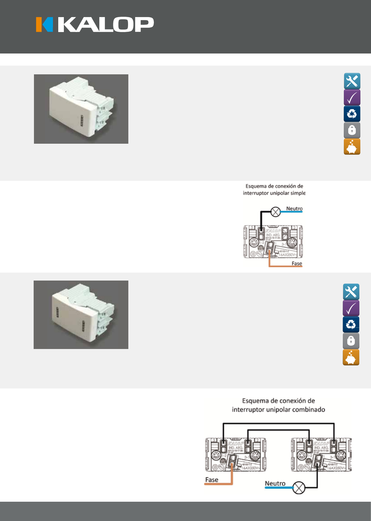 E L E C T R I C I D A D I N T E G R A L S I S T E M A M O D U L A R w w w . k a l o p . c o m . a r MÓDULOS INTERRUPTORES Versión 1.0 01 02 INTERRUPTOR UNIPOLAR SIMPLE 1 PUNTO - 16A 250V.~ (KL40100/1/2) Función: Permite el encendido y apagado de artefactos desde un solo lugar. Ejemplo: luminarias, extractor de aire, etc. Características técnicas: Dimensiones: 1 módulo. Conexión con conductores de hasta 1.50 mm.² - 16 A. 250V.~ Contactos con aleación de plata tanto en el contacto móvil como en el lateral, permiten una óptima resistencia al arco eléctrico, reduciendo la temperatura y aumentado la performance durante las maniobras bajo carga. Fabricado e inyectado con termoplásticos ignífugos, no propagantes de llama a 850°C según norma IEC 60695-2-1. INTERRUPTOR COMBINACIÓN - 16A 250V.~ (KL40115/6/7) Función: Permite el encendido y apagado de artefactos desde más de un lugar. Ejemplo: luminarias en palieres de edi�cios, escaleras, habitaciones, etc. Características técnicas: Dimensiones: 1 módulo. Conexión con conductores de hasta 1.50 mm.² - 16 A. 250V.~ Contactos con aleación de plata tanto en el contacto móvil como en el lateral, permiten una óptima resistencia al arco eléctrico, reduciendo la temperatura y aumentado la performance durante las maniobras bajo carga. Fabricado e inyectado con termoplásticos ignífugos, no propagantes de llama a 850°C según norma IEC 60695-2-1. Colocación: - Se coloca el módulo interruptor por la parte frontal del bastidor único y realizar presión hasta lograr que encastre. - Se realiza la conexión del módulo según el esquema indicado a la derecha. - Se procede a �jar el conjunto completo (interruptor y bastidor) a la caja empotrada o de super�cie por medio de los tornillos asegurando su correcta �jación. Colocación: - Se coloca el módulo interruptor por la parte frontal del bastidor único y realizar presión hasta lograr que encastre. - Se repite la operación con el segundo interruptor que completa el circuito combinación. - Se realiza la conexión de los módulos según el esquema indicado a la derecha. - Se procede a �jar el conjunto completo (interruptor y bastidor) a la caja empotrada o de super�cie por medio de los tornillos asegurando su correcta �jación. Se repite esta paso para los dos interruptores. 03 INTERRUPTOR PULSADOR - 16A 250V.~ (KL40130/1/2) Función: Permite comandar un timbre, una cerradura eléctrica o cualquier artefacto que requiera un sistema de pulsación. Características técnicas: Dimensiones: 1 módulo. Conexión con conductores de hasta 1.50 mm.² - 16 A. 250V.~ Contactos con aleación de plata tanto en el contacto móvil como en el lateral, permiten una óptima resistencia al arco eléctrico, reduciendo la temperatura y aumentado la performance durante las maniobras bajo carga. Fabricado e inyectado con termoplásticos ignífugos, no propagantes de llama a 850°C según norma IEC 60695-2-1. E L E C T R I C I D A D I N T E G R A L S I S T E M A M O D U L A R w w w . k a l o p . c o m . a r MÓDULOS INTERRUPTORES Versión 1.0 Colocación: - Se coloca el módulo interruptor por la parte frontal del bastidor único y realizar presión hasta lograr que encastre. - Se realiza la conexión del módulo según el esquema indicado a la derecha. - Se procede a �jar el conjunto completo (interruptor y bastidor) a la caja empotrada o de super�cie por medio de los tornillos asegurando su correcta �jación. 04 INTERRUPTOR 1/2 TECLÓN SIMPLE - 16A 250V.~ (KL40123S/4S/5S) Función: Permite el encendido y apagado de artefactos desde un solo lugar. Ejemplo: luminarias, extractor de aire, etc. Su tamaño permite ocupar la mitad de un bastidor único. Características técnicas: Dimensiones: 1,5 módulos. Conexión con conductores de hasta 1.50 mm.² - 16 A. 250V.~ Contactos con aleación de plata tanto en el contacto móvil como en el lateral, permiten una óptima resistencia al arco eléctrico, reduciendo la temperatura y aumentado la performance durante las maniobras bajo carga. Fabricado e inyectado con termoplásticos ignífugos, no propagantes de llama a 850°C según norma IEC 60695-2-1. Colocación: - Ver colocación y esquema del INTERRUPTOR UNIPOLAR SIMPLE 1 PUNTO 05 INTERRUPTOR 1/2 TECLÓN COMBINACIÓN - 16A 250V.~ (KL40126/7/8) Función: Permite el encendido y apagado de artefactos desde más de un lugar. Ejemplo: luminarias en palieres de edi�cios, escaleras, habitaciones, etc. Su tamaño permite ocupar la mitad de un bastidor único. Características técnicas: Dimensiones:: 1,5 módulos. Conexión con conductores de hasta 1.50 mm.² - 16 A. 250V.~ Contactos con aleación de plata tanto en el contacto móvil como en el lateral, permiten una óptima resistencia al arco eléctrico, reduciendo la temperatura y aumentado la performance durante las maniobras bajo carga. Fabricado e inyectado con termoplásticos ignífugos, no propagantes de llama a 850°C según norma IEC 60695-2-1. Colocación: Ver colocación y esquema del INTERRUPTOR UNIPOLAR SIMPLE 1 PUNTO E L E C T R I C I D A D I N T E G R A L S I S T E M A M O D U L A R w w w . k a l o p . c o m . a r MÓDULOS INTERRUPTORES Versión 1.0 06 07 INTERRUPTOR UNIPOLAR TECLÓN SIMPLE - 16A 250V.~ (KL40123T/4T/5T) Función: Permite el encendido y apagado de artefactos desde un solo lugar. Ejemplo: luminarias, extractor de aire, etc. Su tamaño permite ocupar la totalidad de un bastidor único. Características técnicas: Dimensiones: 3 módulos. Conexión con conductores de hasta 1.50 mm.² - 16 A. 250V.~ Contactos con aleación de plata tanto en el contacto móvil como en el lateral, permiten una óptima resistencia al arco eléctrico, reduciendo la temperatura y aumentado la performance durante las maniobras bajo carga. Fabricado e inyectado con termoplásticos ignífugos, no propagantes de llama a 850°C según norma IEC 60695-2-1. Colocación: Ver colocación y esquema del INTERRUPTOR UNIPOLAR SIMPLE 1 PUNTO INTERRUPT