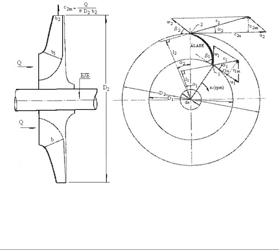 2. ECUACIÓN DE EULER Y TRIÁNGULO DE VELOCIDADES __________________________________________________________________________________________________ FACULTAD DE MINAS Universidad Nacional de Colombia Sede Medellín Ramiro V. Marbello Pérez Escuela de Geociencias y Medio Ambiente 9 2. ECUACIÓN DE EULER Y TRIÁNGULO DE VELOCIDADES EN MÁQUINAS HIDRÁULICAS 2.1. ECUACIÓN FUNDAMENTAL DE LAS TURBOMÁQUINAS HIDRÁULICAS En la Figura 2.1 se muestran dos cortes mutuamente ortogonales, a través del rodete de una turbomáquina, en donde 1 y 2 son los puntos de entrada y de salida de la partícula fluida, respectivamente. CORTE MERIDIONAL CORTE TRANSVERSAL Figura No. 2.1 Cortes meridional y transversal del rodete de una bomba rotodinámica BOMBAS HIDRÁULICAS ROTODINÁMICAS. Teoría y Aplicaciones. __________________________________________________________________________________________________ FACULTAD DE MINAS Universidad Nacional de Colombia Sede Medellín Ramiro V. Marbello Pérez Escuela de Geociencias y Medio Ambiente 10 c1: velocidad absoluta de una partícula de fluido a la entrada del álabe. c2: velocidad absoluta de una partícula de fluido a la salida del álabe. n: velocidad de rotación del rodete (rpm). u1, u2: velocidad periférica del rodete, a la entrada y salida del álabe, respectivamente. 60 nDπ u 1 1 60 nDπ u 2 2 (2.1) w1, w2: velocidad relativa de una partícula de fluido a la entrada y a la salida del álabe, respectivamente, con relación al álabe. Vectorialmente, estas velocidades se relacionan de la siguiente manera: 111 ucw (2.2) o 111 uwc (2.3) Suposición: El vector w es tangente al álabe, es decir, la partícula entra sin chocar en el álabe. Luego, la partícula es guiada por el álabe desde (1) hasta (2), en donde sale con velocidad relativa w2. Análogamente, 222 ucw (2.4) de donde: 222 uwc (2.5) En su trayectoria de 1 a 2, la partícula experimenta un cambio de velocidad en el rodete: es decir de c1 a c2. Por otra parte, según el teorema de la cantidad de movimiento, aplicado a un hilo de corriente, al cual pertenece la partícula fluida, se tiene: )c(cdQρdF 12 (2.6) dQ: caudal diferencial que fluye a través del hilo de corriente. 2. ECUACIÓN DE EULER Y TRIÁNGULO DE VELOCIDADES __________________________________________________________________________________________________ FACULTAD DE MINAS Universidad Nacional de Colombia Sede Medellín Ramiro V. Marbello Pérez Escuela de Geociencias y Medio Ambiente 11 Según el teorema del momento de la cantidad de movimiento: )clc(ldQρdM 1122 (2.7) dM: momento cinético, con relación al eje de la máquina, de la fuerza que el rodete ejerce sobre las partículas de fluido. Hipótesis: Todas las partículas de fluido entran en el rodete a un diámetro D1, con la misma velocidad c1, y salen a un diámetro D2, con la misma velocidad c2. Es decir, se supone que las líneas de corriente experimentan la misma desviación, lo que, a su vez, significa que el rodete está dotado de un número infinito de álabes, para guiar perfectamente al fluido. Esta hipótesis se llama Teoría del Número Infinito de Álabes. Siendo constante el término 1122 clcl , al integrar la ecuación (2.7) resulta )clc(lQρM 1122 (2.8) donde, M: momento total comunicado al fluido o momento hidráulico. Q: caudal total de la bomba. Además, es fácil ver de la Figura 2.1 que: 222 111 α cosrl α cosrl (2.9) Reemplazando las ecuaciones (2.9) en la ecuación (2.8), se tiene: )α coscrα cosc(rQρM 1 112 22 (2.10) De otro lado, la potencia que el rodete comunica al fluido se puede expresar de la siguiente manera: ωMP (2.11) BOMBAS HIDRÁULICAS ROTODINÁMICAS. Teoría y Aplicaciones. __________________________________________________________________________________________________ FACULTAD DE MINAS Universidad Nacional de Colombia Sede Medellín Ramiro V. Marbello Pérez Escuela de Geociencias y Medio Ambiente 12 : velocidad angular del rodete; 60 n 2π ω , (rad/s). Luego, )α coscrα cosc(rωQρP 1 112 22 (2.12) Por otra parte, siendo Ht la altura equivalente a la energía suministrada al fluido, la potencia de la bomba se expresa como: tHQgρP (2.13) Igualando las ecuaciones (2.12) y (2.13), se tiene: )α coscrα cosc(rωQρ t HQgρ 1 112 22 de donde: g α coscωrα coscωr H 1 112 22 t De los triángulos de velocidades, es fácil ver que: u 22 2 cα cosc y u 11 1 cα cosc y sabiendo que: 22 u ωr y 11 u ωr resulta: g cucu H u 11u 22 t Ecuación de Euler (2.14) Ht es la altura equivalente a la energía suministrada por la bomba al fluido. Se denomina altura hidráulica, y es una altura teórica porque una parte de esta energía se disipará por rozamientos hidráulicos. 2. ECUACIÓN DE EULER Y TRIÁNGULO DE VELOCIDADES __________________________________________________________________________________________________ FACULTAD DE MINAS Universidad Nacional de Colombia Sede Medellín Ramiro V. Marbello Pérez Escuela de Geociencias y Medio Ambiente 13 En bombas, ventiladores y compresores, que son máquinas generadoras, el rodete imparte energía al fluido. La ecuación (2.10) expresa el momento comunicado al fluido y la ecuación (2.12), la potencia comunicada al mismo. En turbinas hidráulicas, turbinas de vapor y turbinas de gas, las cuales son máquinas motoras, el fluido es el que imparte energía al rodete. Por ello, para deducir la ecuación de Euler en máquinas motoras, se procede análogamente, pero escribiendo el momento que el fluido ejerce sobre el rodete, con lo cual los segundos miembros de las ecuaciones (2.10), (2.12) y (2.14) cambian de signos, convirtiéndose a las siguientes expresiones: )α coscrα cosc(rQρM 2 221 11 (2.10') )α coscrα cosc(rωQρP 2 221 11 (2.12') g cucu H u 22u 11 t (2.14') En general, la ecuación de Euler (Ecuación fundamental de las turbomáquinas) expresa lo siguiente: g cu cu H u 22u 11 t (-): M. Generadoras (+): M. Motoras (2.15) Ht es la altura hidráulica de las turbomáquinas hidráulicas. En