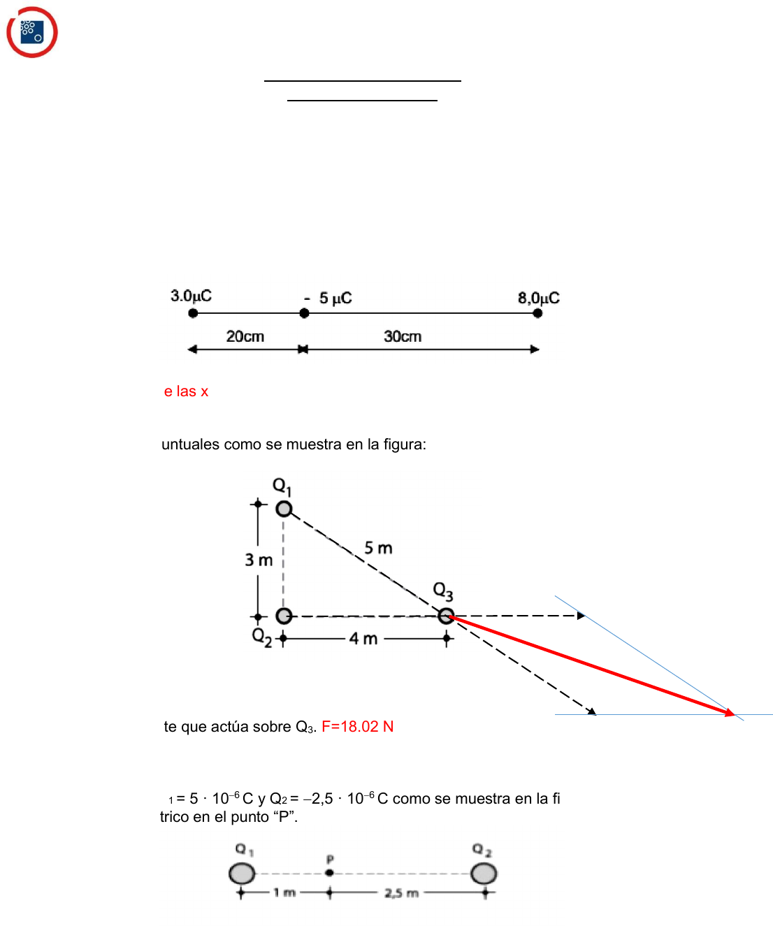 Medicina 1 INGRESO 2021 GUÍA DE EJERCITACIÓN ELECTROSTÁTICA 1) Dos cargas puntuales Q1 = 4·106 C y Q2 = 8·106 C, están separadas 4 m. ¿Con qué fuerza se atraen? F = 0,018 N 2) Tres cargas puntuales se colocan sobre el eje x como se muestra en la figura. Determinar la fuerza neta que actúa sobre la carga de 5 μC debido a la presencia de las otras dos cargas. 0,63 N, sentido negativo de las x 3) Se tienen tres cargas puntuales como se muestra en la figura: Q1 = (25/36) · 104 C Q2 = 4 · 105 C Q3 = 4 · 104 C Calcular la fuerza resultante que actúa sobre Q3. F=18.02 N 4) Se tienen dos cargas: Q1 = 5 · 106 C y Q2 = 2,5 · 106 C como se muestra en la figura. Calcular la intensidad de campo eléctrico en el punto “P”. ET = 45000 N/C + 3500 N/C = 48600 N/C Medicina 2 INGRESO 2021 5) En el sistema de cargas representadas, se sabe que las cargas colocadas en B y C se repelen con una fuerza de 1,8 N. y que la fuerza eléctrica neta en la carga colocada en B es cero. Determinar valor y signo de la carga Q Q= 4·10 -6 C 6) Un objeto esférico tiene una carga de 8 μC ¿A qué distancia del centro del objeto el potencial es igual a 3,6·104 V? � = �� � → � = �� � = 2 � 7) ¿Qué energía almacena un capacitor de 10000 μF cuando se conecta a una fuente de 300 V? � = � � � ��� = 1 2 �� → � = � �� → � = 1 2 ��� = ��� � 8) ¿Cuál es la diferencia de potencial entre dos puntos de un campo eléctrico, si para transportar una carga de 5 C se ha realizado un trabajo de 4,9 J? V = 0,98 V 10) En el modelo de Bohr del átomo de hidrogeno (H), el electrón en órbita alrededor del protón puede existir sólo en ciertas orbitas circulares. La más pequeña tiene un radio de 0,0529 nm, y la siguiente mayor tiene un radio de 0,212 nm. ¿Qué se puede afirmar acerca del potencial eléctrico asociado con cada orbita? a) La menor tiene mayor potencial. [*] b) la mayor tiene mayor potencial. c) ambas tienen el mismo potencial. El electrón está en órbita en el campo de un protón, cuya carga es positiva. Como el potencial eléctrico crece con distancia decreciente desde una carga positiva, la respuesta debe ser (a). � = �� � 11) En el modelo de Bohr del átomo de hidrogeno (H), el electrón en órbita alrededor del protón puede existir sólo en ciertas orbitas circulares. La más pequeña tiene un radio de 0,0529 nm, y la siguiente mayor tiene un radio de 0,212 nm. Determinar el potencial V en la órbita más pequeña, y seleccionar la opción correcta: considerar la carga del electrón: 1.6. 10-19 C a) +27,2 mV b) +27,2 V [*] c) 27,2 V d) 27,2 mV Medicina 3 INGRESO 2021 12) En el modelo de Bohr del átomo de hidrogeno (H), el electrón en órbita alrededor del protón puede existir sólo en ciertas orbitas circulares. La más pequeña tiene un radio de 0,0529 nm, y la siguiente mayor tiene un radio de 0,212 nm. Determinar el potencial V en la órbita más grande, y seleccionar la opción correcta: a) +6,79 mV b) 6,79 V c) +6,79 V [*] d) 6,79 mV 13) Dos cargas puntuales (Q1 y Q2) se atraen inicialmente entre sí con una fuerza de 600 N, si la separación entre ellas se reduce a un tercio de su valor original ¿Cuál es la nueva fuerza de atracción? (Rta.: F = 5400N). 14) Calcular la carga de dos partículas igualmente cargadas, que se repelen con una fuerza de 0,1 N, cuando están separadas por una distancia de 50 cm en el vacío (Rta: Q1 = Q2 = 1.66.10-6 C). 15) Dada las siguientes cargas: Q1 = 5•10-8 C, Q2 = Q1 y Q3 = -Q1. Si Q1 se encuentra a 10 cm a la izquierda de Q2 y Q3 a 10 cm a la derecha de Q2, determinar: a) La fuerza electrostática sobre Q1. b) La fuerza electrostática sobre Q2. ( Rta.: 1,69•10-3 y 4,5•10-3 N) 16) Sobre los vértices de un triángulo equilátero de 10 cm de lado, se ubican las siguientes cargas: Q1 = 5•10-8 C, Q2 = Q1 y Q3 = -Q1. Determinar la fuerza resultante sobre la carga Q1 (Rta.: 2,25•10-3 N) 17) Calcular el campo eléctrico creado por una carga Q = 2•10-6 C sobre un punto P situado a 30 cm de distancia. Calcular, además la fuerza sobre una carga Q = -4•10-6 C situada en el punto P (Rta.: 2•105 N/C y 0,8 N).