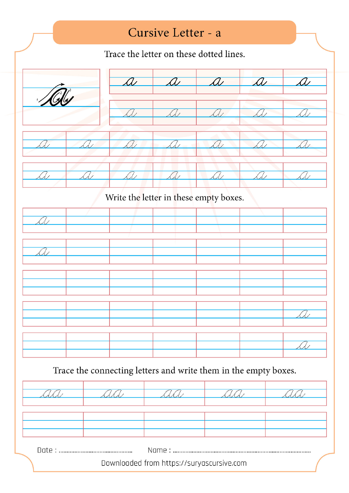 Cursive Letter - a Trace the letter on these dotted lines. a a a a a a a a a a a a a a a a a a a a a a a a Write the letter in these empty boxes. a a a a Trace the connecting letters and write them in the empty boxes. aa aa aa aa aa Date : Name : Downloaded from https://suryascursive.comCursive Letter - b Trace the letter on these dotted lines. b b b b b b b b b b b b b b b b b b b b b b b Write the letter in these empty boxes. b b b b Trace the connecting letters and write them in the empty boxes. bb bb bb bb bb Date : Name : Downloaded from https://suryascursive.comCursive Letter - C Trace the letter on these dotted lines. D Write the letter in these empty boxes. Trace the connecting letters and write them in the empty boxes. Date : Name : Downloaded from https://suryascursive.comCursive Letter - d Trace the letter on these dotted lines. d d d d d d d d d d d d d d d d d d d d d d Write the letter in these empty boxes. d d d d Trace the connecting letters and write them in the empty boxes. dd dd dd dd dd Date : Name : Downloaded from https://suryascursive.comCursive Letter - e Trace the letter on these dotted lines. 2 e e e e e l Write the letter in these empty boxes. Trace the connecting letters and write them in the empty boxes. Date : Name : Downloaded from https://suryascursive.comCursive Letter - Trace the letter on these dotted lines. 2 of f f f f f 3 f f f of of of f of Write the letter in these empty boxes. of of Trace the connecting letters and write them in the empty boxes. off off Date : Name : Downloaded from https://suryascursive.comCursive Letter - g Trace the letter on these dotted lines. g g g g g g g g g g g g g g g g g g g g g g g g Write the letter in these empty boxes. g g g g Trace the connecting letters and write them in the empty boxes. gg gg gg gg gg : Name : Downloaded from https://suryascursive.comCursive Letter - h Trace the letter on these dotted lines. h h h h h h h h h h h h h h h h h h h h h h h h Write the letter in these empty boxes. h h h h Trace the connecting letters and write them in the empty boxes. hh hh hh hh hh Date : Name : Downloaded from https://suryascursive.comCursive Letter - i Trace the letter on these dotted lines. 3 i i i i i Write the letter in these empty boxes. Trace the connecting letters and write them in the empty boxes. Date : Name : Downloaded from https://suryascursive.comCursive Letter - j Trace the letter on these dotted lines. 3 j j j j J j J j j j j j Write the letter in these empty boxes. J Trace the connecting letters and write them in the empty boxes. Date : Name : Downloaded from https://suryascursive.comCursive Letter - k Trace the letter on these dotted lines. 2 k k k k k 1 k k k k k k k k k k k k k k k k Write the letter in these empty boxes. k k k Trace the connecting letters and write them in the empty boxes. kk kk kk Date : Name : Downloaded from https://suryascursive.comCursive Letter - 1 Trace the letter on these dotted lines. l l l l l l l l l l l l l l l l l l l Write the letter in these empty boxes. l l l l Trace the connecting letters and write them in the empty boxes. ll ll ll ll ll Date : Name : Downloaded from https://suryascursive.comCursive - m Trace the letter on these dotted lines. m m m m m 2 3 m m m m m m m m Write the letter in these empty boxes. m m Trace the connecting letters and write them in the empty boxes. mm mm mm mm mm Date : Downloaded from https://suryascursive.comCursive Letter - n Trace the letter on these dotted lines. 2 M M M M M M M M M M M M M M Write the letter in these empty boxes. M M M Trace the connecting letters and write them in the empty boxes. mn mn Date : : Downloaded from https://suryascursive.comCursive Letter - o Trace the letter on these dotted lines. 3 D D D D D D D D D D Write the letter in these empty boxes. D D Trace the connecting letters and write them in the empty boxes. Date : Name : Downloaded from https://suryascursive.comCursive Letter - Trace the letter on these dotted lines. 2 p p p p p for Write the letter in these empty boxes. Trace the connecting letters and write them in the empty boxes. pp pp pp : Name : Downloaded from https://suryascursive.comCursive Letter - q Trace the letter on these dotted lines. q q q q q q q q q q q q q q q q q Write the letter in these empty boxes. q q q Trace the connecting letters and write them in the empty boxes. Date : Name : Downloaded from https://suryascursive.comCursive Letter - r Trace the letter on these dotted lines. 2 r r r r r Write the letter in these empty boxes. r Trace the connecting letters and write them in the empty boxes. Date : Name : Downloaded from https://suryascursive.comCursive Letter S Trace the letter on these dotted lines. Write the letter in these empty boxes. & Trace the connecting letters and write them in the empty boxes. Date : Name : Downloaded from https://suryascursive.comCursive Letter - t Trace the letter on these dotted lines. t t t t t t t t t t t t t t t t t t Write the letter in these empty boxes. t t t t Trace the connecting letters and write them in the empty boxes. it it it it Date : Name : Downloaded from https://suryascursive.comCursive Letter u Trace the letter on these dotted lines. M M M M M M M M Write the letter in these empty boxes. M M M Trace the connecting letters and write them in the empty boxes. Date : Downloaded from https://suryascursive.comCursive Letter - V Trace the letter on these dotted lines. 2 Write the letter in these empty boxes. Trace the connecting letters and write them in the empty boxes. Date : Name : Downloaded from https://suryascursive.comCursive Letter - W Trace the letter on these dotted lines. 2 w w w w w w w w w w w w w w w Write the letter in these empty boxes. w w w Trace the connecting letters and write them in the empty boxes. Date : Downloaded from https://suryascursive.comCursive Letter - X Trace the letter on these dotted lines. x x x x x Write the letter in these empty boxes. Trace the connecting letters and write them in the empty b