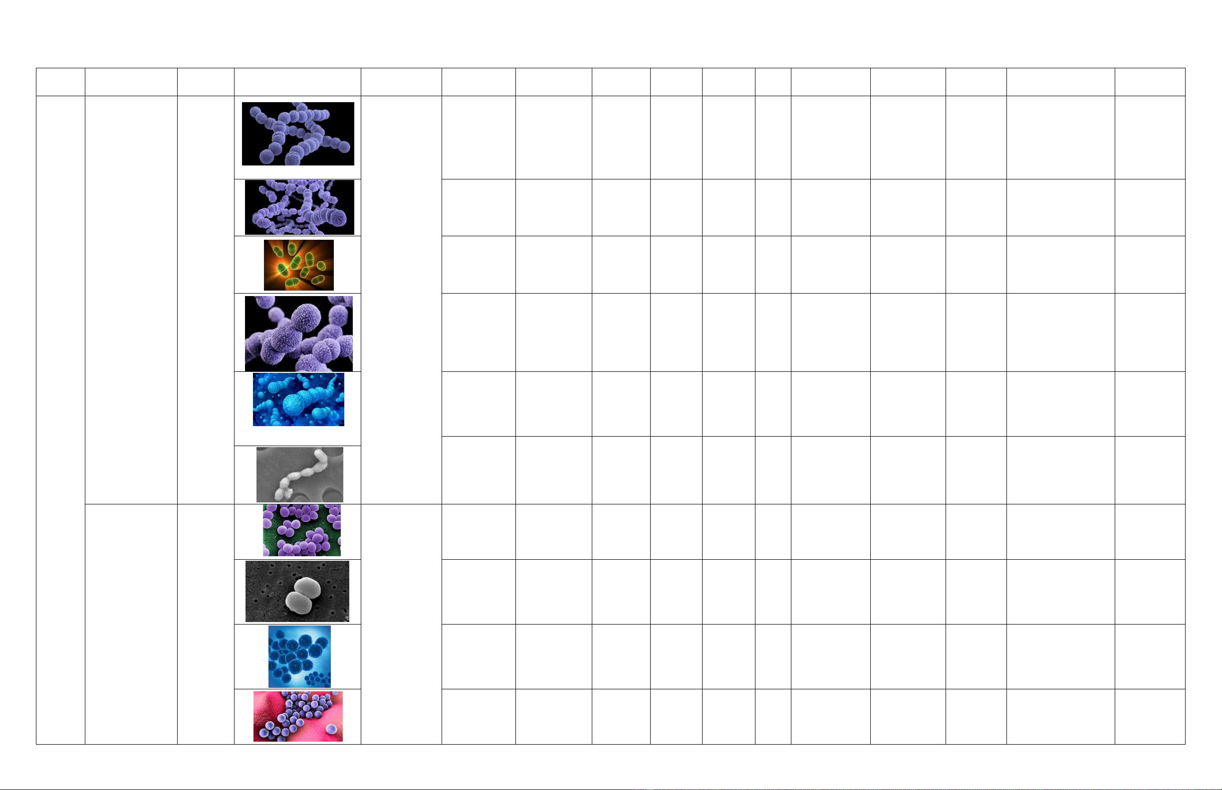 Gram Positivos Morfología Familia Agrupamiento Imagen Género Especie Metabolismo Aerotolerancia Hemólisis Clasificación de Lancefield Forma esporas Enfermedad Dx Medio de cultivo de crecimiento Tx Px C o co s S tr ep to co cc a ce a e C ad en as o p ar es S tr ep to co cc u s pyogenes Catalasa y coagulasa negativa Fermentativo de la glucosa (produce ac. Láctico) Anaerobio facultativo B- hemolítico Grupo A NO Faringoamigdalitis aguda Escarlatina Enfermedades cutáneas: Impétigo y erisipela Tinción Gram (+) Aislamiento en cultivo de exudado faríngeo Agar sangre Penicilina (amoxicilina) Clindamicina (en casos de alergia a las penicilinas) Macrólidos (tx alternativo para FAA estreptocócica) Lavado de manos Tratar infecciones cutáneas oportunamente Evitar contacto con personas infectadas pneumoniae Fermentativo de la glucosa (produce ac. Láctico) Anaerobio facultativo Alfa- hemolíticos (genera una zona verdosa) NO NO Neumonía y meningitis Otitis Media y sinusitis Cultivo y frotis con tinción Gram Agar sangre Penicilina G y Vancomicina Vacunación (neumocócica conjugada y polisacárida) faecalis Fermentativo de la glucosa (produce ac. Láctico) Anaerobio facultativo Gamma hemolítica (No hemolítico) Grupo D NO IVU Endocarditis Peritonitis Tinción Gram (+) Catalasa negativa Agar sangre Agar bilis- esculina Ampicilina + Gentamicina Vancomicina para cepas resistentes a penicilina/ampicilina Control hospitalario, lavado de manos Uso racional de antibióticos agalactiae Fermentativo de la glucosa (produce ac. Láctico) Anaerobia Facultativa B- hemolítico Grupo B NO Parto prematuro, neumonía y meningitis neonatal Cultivo y frotis con tinción Gram Dan positivo a la prueba CAMP Agar sangre Penicilina G o ampicilina Tamizaje en embarazadas Profilaxis intraparto con penicilina viridans Fermentativo Anaerobia facultativa Alfa- hemolisis parcial NO NO Caries Endocarditis Cultivo agar sangre y se observan colonias a- hemolíticas (color verde) Agar sangre Penicilina G Ceftriaxona Vancomicina Clorhexidina Higiene bucal adecuada Profilaxis antibiótica en cardiopatías con riesgo mutans Producen ac. láctico por metabolismo de la sacaros. Produce polímeros glucano y fructano desde la sacarosa Anaerobio facultativo Alfa- hemolisis o Gamma- hemolítico NO NO Caries Endocarditis bacteriana Tinción Gram (+) Pruebas bioquímicas serológicas y moleculares Agar sangre, y para medios selectivos de alta sacarosa el Trypticase-soy- bacitracin (TSB) Antisépticos bucales: clorhexidina y fluoruro de sodio o estaño. Amoxicilina, metronidazol, clindamicina. Higiene oral, uso de fluoruro Disminuir consumo de azúcares S ta p h yl o co cc a ce a e R ac im o s S ta p h yl o co cc u s aureus Fermentativo (azucares a ac. láctico) Anaerobio facultativo Beta- hemolitico NO NO Enfermedades mediadas por toxinas y supurativas Neumonía, artritis séptica. Microscopia, cultivo agar sal y manitol. Prueba de catalasa. Tinción Gram (+) Agar sangre o Agar sal y manitol Resistente a algunos B- lactamicos, se da usualmente Cefazolina, Nafcilina, y para resistentes: Vancomicina, linezolid o daptomicina Lavado de manos Desinfección de heridas epidermidis Fermentativo Anaerobio facultativo Gamma- hemolítico NO NO Infección por dispositivos médicos, forma biopelículas Tinción Gram (+) Catalasa positiva, coagulasa negativa Agar sangre y agar sal y manitol. Vancomicina combinada con rifampicina o gentamicina Asepsia en dispositivos médicos Control de infecciones hospitalarias saprophyticus saprophyticus: sapros, pútrido: phyton Fermentativo Anaerobio facultativo Gamma- hemolítico NO NO IVU en mujeres y jóvenes sexualmente activas. Urocultivo Catalasa positiva y coagulasa negativa Resistencia a la Novobiocina Agar sangre y agar sal y manitol. Nitrofurantoina Trimetoprima-sulfametoxazol Fluoroquinolonas (Ciprofloxacino y levofloxacino) Higiene adecuada Micción tras relaciones sexuales haemolyticus Fermentativo Anaerobio facultativo Beta- hemolítico (lisis completa) NO NO Bacteriemia, endocarditis, peritonitis y septicemia. Catalasa positiva, coagulasa negativa. Tinción Gram (+) Agar sangre y agar sal y manitol. Alta resistencia a antibióticos. Vancomicina Linezolid Daptomicina Control hospitalario Asepsia estricta en procedimientos invasivos B a ci lo s Corynebacteriaceae Bacilos en empalizada o letras Corynebacterium diphtheriae Fermentativo Aerobio estricto o Anaerobio facultativo No hemolítico NO NO Difteria respiratoria (con pseudomembrana) Difteria cutánea Endocarditis Por cultivo de agar sangre con telúrico potásico Prueba de toxicidad (Elek test) Agar sangre con cisteintelurito Penicilina, eritromicina Antitoxina diftérica para neutralizar. Vacunación DPT / Td y refuerzos cada 10 años Bacillaceae Bacilos largos, esporulados, aislados o en cadenas Bacillus anthracis Oxidativo y fermentativo Aerobio facultativo Gamma- hemolítico NO SI Carbunco cutáneo Carbunco por inhalación Tinción Gram Cultivo en agar sangre PCR Agar sangre Para carbunco cutáneo: Amoxicilina Carbunco por inhalación: Ciprofloxacino o doxiciclina, en combinación con rifampicina, vancomicina Vacunación en personal de riesgo Evitar contacto con animales infectados Listeriaceae Bacilos pequeños, a veces en pares o cortas cadenas Listeria monocytogenes Fermentativo Anaerobio facultativo Beta- hemolítico NO NO Listeriosis, meningitis Catalasa positiva, CAMP positiva Agar sangre Agar Oxford Agar PALCAM Ampicilina o Penicilina G, combinado con gentamicina Como alternativa, TMP-SMX Evitar el consumo de alimentos no pasteurizados Precaución en embarazadas y personas inmunosuprimidas Clostridiaceae Bacilos largos, esporulados, aislados o en cadenas Clostridium difficile Fermentativo (produce gases) Anaerobio estricto Variable o no hemolítico NO SI Colitis pseudomembranosa Detección de toxinas A/B en coprocultivo Agar CCFA Vancomicina o Fidaxomicina. Vancomicina + metronidazol Lavado de manos con agua y jabón Reducir uso de