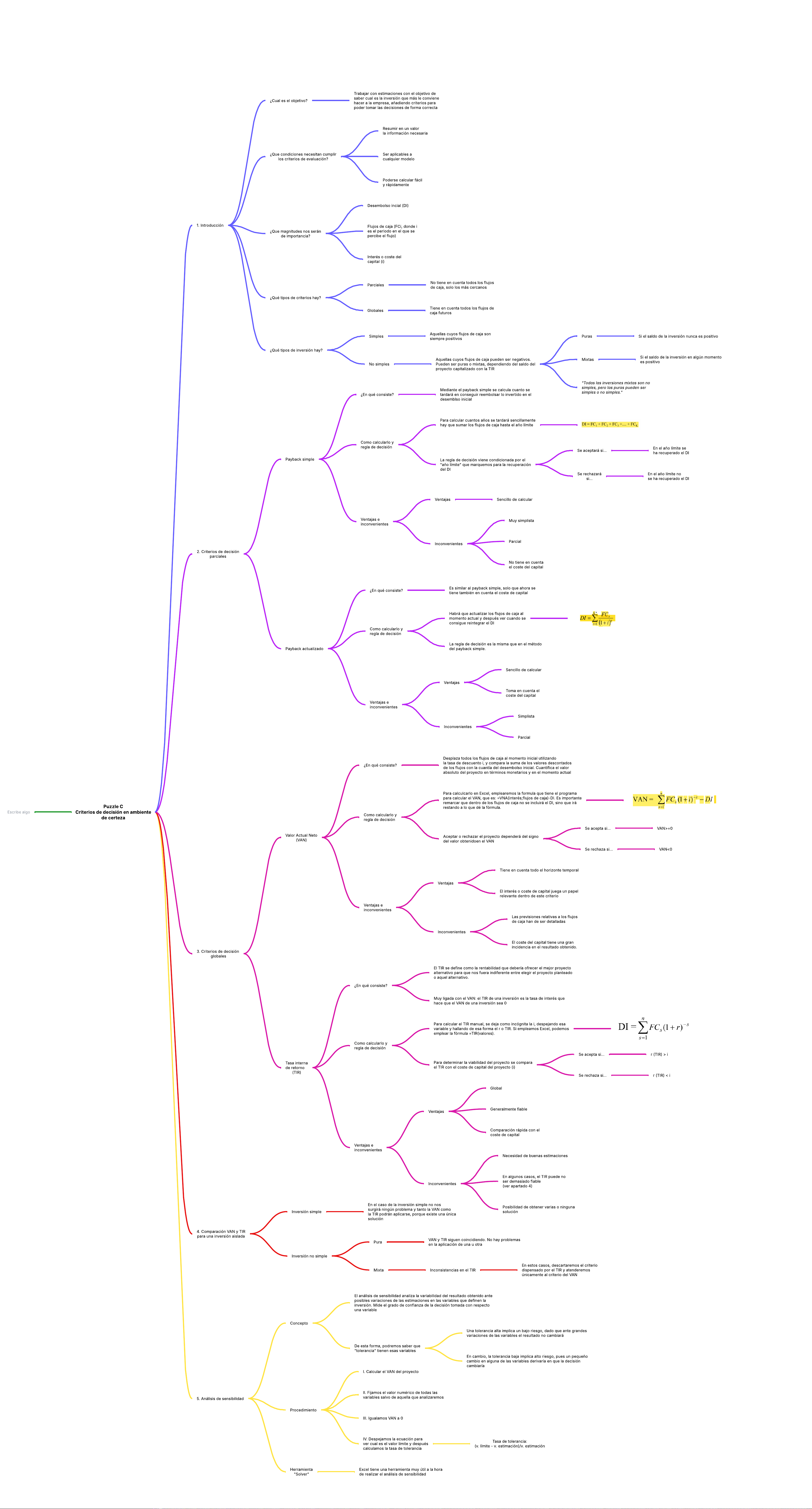 Parcial Tiene en cuenta todos los f lujos de caja futuros Para calcular cuantos años se tardará sencillamente hay que sumar los f lujos de caja hasta el año límite 4. Comparación VAN y TIR para una inversión aislada La regla de decisión es la misma que en el método del payback simple. Inconvenientes Ventajas Sencillo de calcular Ventajas ¿Que magnitudes nos serán de importancia? Escribe algo 1. Introducción Ser aplicables a cualquier modelo 3. Criterios de decisión globales En el caso de la inversión simple no nos surgirá ningún problema y tanto la VAN como la TIR podrán aplicarse, porque existe una única solución Es similar al payback simple, solo que ahora se tiene también en cuenta el coste de capital ¿Que condiciones necesitan cumplir los criterios de evaluación? Como calcularlo y regla de decisión Desplaza todos los f lujos de caja al momento inicial utilizando la tasa de descuento i, y compara la suma de los valores descontados de los f lujos con la cuantía del desembolso inicial. Cuantif ica el valor absoluto del proyecto en términos monetarios y en el momento actual Se acepta si... Simplista Para calcular el TIR manual, se deja como incógnita la i, despejando esa variable y hallando de esa forma el r o TIR. Si empleamos Excel, podemos emplear la fórmula =TIR(valores). Se rechaza si... Ventajas Pura El análisis de sensibilidad analiza la variabilidad del resultado obtenido ante posibles variaciones de las estimaciones en las variables que definen la inversión. Mide el grado de confianza de la decisión tomada con respecto una variable No tiene en cuenta el coste del capital Aquellas cuyos f lujos de caja pueden ser negativos. Pueden ser puras o mixtas, dependiendo del saldo del proyecto capitalizado con la TIR Para determinar la viabilidad del proyecto se compara el TIR con el coste de capital del proyecto (i) Ventajas e inconvenientes Escribe algo I. Calcular el VAN del proyecto Necesidad de buenas estimaciones Globales El interés o coste de capital juega un papel relevante dentro de este criterio Si el saldo de la inversión en algún momento es positivo Para calculcarlo en Excel, emplearemos la formula que tiene el programa para calcular el VAN, que es: =VNA(interés;f lujos de caja)-DI. Es importante remarcar que dentro de los f lujos de caja no se incluirá el DI, sino que irá restando a lo que dé la fórmula. En el año límite se ha recuperado el DI ¿Qué tipos de inversión hay? Se rechazará si... Herramienta "Solver" Inconvenientes Tiene en cuenta todo el horizonte temporal Escribe algo VAN i Global Muy simplista ¿Cual es el objetivo? Ventajas e inconvenientes No tiene en cuenta todos los f lujos de caja, solo los más cercanos ¿Qué tipos de criterios hay? Valor Actual Neto (VAN) Parciales Ventajas Inconsistencias en el TIR Posibilidad de obtener varias o ninguna solución Concepto En algunos casos, el TIR puede no ser demasiado f iable (ver apartado 4) ¿En qué consiste? Excel tiene una herramienta muy útil a la hora de realizar el análisis de sensibilidad IV. Despejamos la ecuación para ver cual es el valor límite y después calculamos la tasa de tolerancia Ventajas e inconvenientes Aceptar o rechazar el proyecto dependerá del signo del valor obtenidoen el VAN Interés o coste del capital (i) Mixta Las previsiones relativas a los f lujos de caja han de ser detalladas Poderse calcular fácil y rápidamente Toma en cuenta el coste del capital En el año límite no se ha recuperado el DI II. Fijamos el valor numérico de todas las variables salvo de aquella que analizaremos r (TIR) =0 "Todas las inversiones mixtas son no simples, pero las puras pueden ser simples o no simples." Inversión simple Inconvenientes Escribe algo Habrá que actualizar los f lujos de caja al momento actual y después ver cuando se consigue reintegrar el DI Mediante el payback simple se calcula cuanto se tardará en conseguir reembolsar lo invertido en el desemblso inicial Aquellas cuyos f lujos de caja son siempre positivos ¿En qué consiste? 2. Criterios de decisión parciales Resumir en un valor la información necesaria Ventajas e inconvenientes Inversión no simple Sencillo de calcular Como calcularlo y regla de decisión En cambio, la tolerancia baja implica alto riesgo, pues un pequeño cambio en alguna de las variables derivaría en que la decisión cambiaría Inconvenientes Si el saldo de la inversión nunca es positivo 5. Análisis de sensibilidad No simples ¿En qué consiste? Muy ligada con el VAN: el TIR de una inversión es la tasa de interés que hace que el VAN de una inversión sea 0 Mapa mental P�gina 1