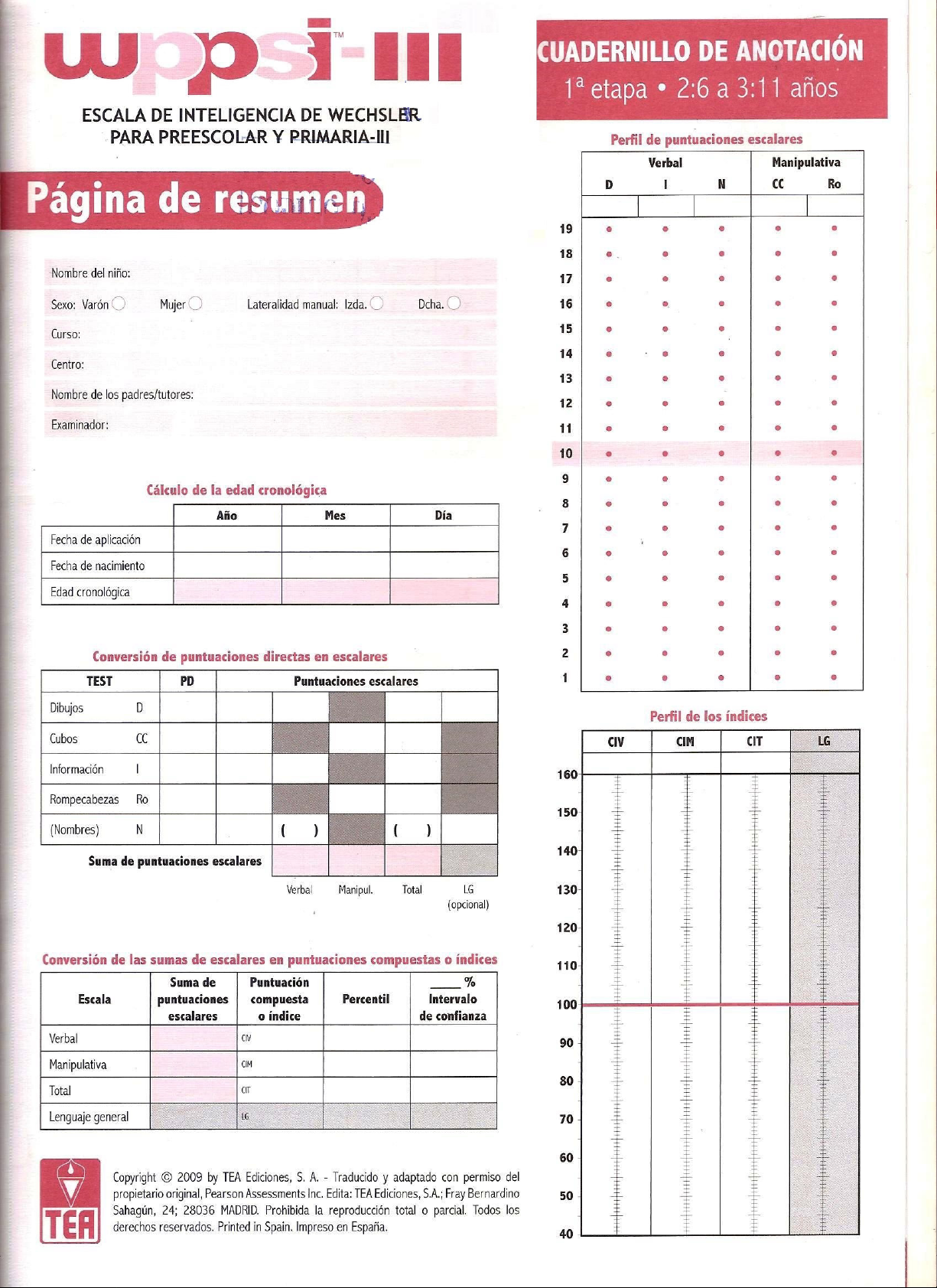 CUADERNILLO DE ANOTACIÓN etapa 2:6 a 3:11 años ESCALA DE INTELIGENCIA DE WECHSLER PARA PREESCOLAR PRIMARIA-III Perfil de puntuaciones escalares Verbal Manipulativa D I N Ro Página de resumen 19 18 Nombre del niño: 17 Sexo: Varón Mujer Lateralidad manual: Izda. Dcha. 16 Curso: 15 14 Centro: 13 Nombre de los padres/tutores: 12 Examinador: 11 10 9 Cálculo de la edad cronológica 8 Año Mes Día 7 Fecha de aplicación 6 Fecha de nacimiento 5 Edad cronológica 4 3 Conversión de puntuaciones directas en escalares 2 TEST PD Puntuaciones escalares 1 Dibujos D Perfil de los índices Cubos CC CIV CIM CIT LG Información I 160 Rompecabezas Ro 150 (Nombres) N ( ) ( ) 140 Suma de puntuaciones escalares Verbal Manipul. Total LG 130 (opcional) 120 Conversión de las sumas de escalares en puntuaciones compuestas índices 110 Suma de Puntuación % Escala puntuaciones compuesta Percentil Intervalo 100 escalares índice de confianza Verbal CIV 90 Manipulativa CIM 80 Total CIT Lenguaje general LG 70 60 Copyright © 2009 by TEA Ediciones, S. A. Traducido y adaptado con permiso del propietario original, Pearson Assessments Inc. Edita: TEA Ediciones, S.A.; Fray Bernardino 50 Sahagún, 24; 28036 MADRID. Prohibida la reproducción total 0 parcial. Todos los TEA derechos reservados. Printed in Spain. Impreso en España. 40Página de análisis Diferencia OPCIONES Cuadro de comparaciones Puntuación Puntuación Diferencia Valor crítico significativa Tasa base 1 2 Grupo de comparación: ÍNDICES/ TESTS (Sí No) Muestra total Índices CI Verbal - CI Manipulativo CIV CIM Según nivel de aptitud Información Dibujos D NIVEL DE CONFIANZA Tests 85% Rompecabezas - Cubos Ro CC 95% Dibujos Nombres D N Para rellenar el cuadro de comparaciones, véanse las tablas B.1, B.2, y B.4. OPCIONES Cuadro de puntos fuertes débiles Distancia Punto fuerte NIVEL DE CONFIANZA Test Pe Media de Pe a la media Valor crítico débil (F 0 D) Tasa base 85% Dibujos 95% Cubos Información Rompecabezas Para rellenar el cuadro de puntos fuertes y débiles, véase la tabla B.5. LOS TESTS (4)* Suma de puntuaciones escalares Número de pruebas ÷4 Media * Los 4 tests incluyen 2 verbales y 2 manipulativos. CURVA NORMAL 2,2 6,7 16,1 50 16,1 6,7 2,2 PORCENTAJE DE CASOS CI 70 80 90 100 110 120 130 CLASIFICACIÓN Muy bajo Inferior Medio- Medio Medio- Superior Muy superior bajo alto CUALITATIVA RANGOS DE PUNTUACIÓN ≤ 69 70 79 80 89 90 109 110 119 120 129 ≥ 1301 Dibujos Comienzo PUNTUACIÓN TERMINACIÓN Rodee el 0 ó el 1. 2 y 3 años: ítem 1. 5 puntuaciones Las respuestas correctas consecutivas de 0. aparecen resaltadas. Elemento Respuesta Punt. 2-3 1 Pie 1 2 3 4 NS 0 1 2 Muñeca 1 2 3 4 NS 0 1 3 Caracol 1 2 3 4 NS 0 1 4 Jirafa 1 2 3 4 NS 0 1 5 Taza 1 2 3 4 NS 0 1 6 Lluvia 1 2 3 4 NS 0 1 7 Mariposa 1 2 3 4 NS 0 1 8 Linterna 1 2 3 4 NS 0 1 9 Patada 1 2 3 4 NS 0 1 10 Tumbarse 1 2 3 4 NS 0 1 11 Fútbol 1 2 3 4 NS 0 1 12 Puño 1 2 3 4 NS 0 1 13 Triángulo 1 2 3 4 NS 0 1 14 Tostadora 1 2 3 4 NS 0 1 15 Pintar 1 2 3 4 NS 0 1 16 Pájaro debajo del árbol amarillo marrón azul rojo NS 0 1 17 Aspirador 1 2 3 4 NS 0 1 18 Pagar 1 2 3 4 NS 0 1 19 Platillos 1 2 3 4 NS 0 1 20 Peludo 1 2 3 4 NS 0 1 21 Remover 1 2 3 4 NS 0 1 22 Empujar 1 2 3 4 NS 0 1 23 Agacharse 1 2 3 4 NS 0 1 24 Tiovivo 1 2 3 4 NS 0 1 25 Excavadora 1 2 3 4 NS 0 1 26 Desierto 1 2 3 4 NS 0 1 27 Ternera 1 2 3 4 NS 0 1 28 Caja registradora 1 2 3 4 NS 0 1 29 Telescopio 1 2 3 4 NS 0 1 30 Roer 1 2 3 4 NS 0 1 31 Mansión 1 2 3 4 NS 0 1 32 Mantener el equilibrio 1 2 3 4 NS 0 1 33 Caballete 1 2 3 4 NS 0 1 34 Encabritar 1 2 3 4 NS 0 1 35 Cilindro 1 2 3 4 NS 0 1 36 Paralelas 1 2 3 4 NS 0 1 37 Horizontal 1 2 3 4 NS 0 1 38 Equivalente 1 2 3 4 NS 0 1 Puntuación directa (máxima=38) 32 Cubos Tiempo límite: Ver cada ítem. PUNTUACIÓN 2 y 3 años: TERMINACIÓN Comienzo 1 a 6: 0, 1 ó 2 puntos. ítem 1. 3 puntuaciones consecutivas de 0. 7 a 20: 0 ó 2 puntos. Cubos Tíempo Tiempo Dibujo Dibujo Puntuación Dibujo Presentación necesarios límite empleado correcto incorrecto (rodear) Parte Niño Intento 1 Intento 2 Intento 2 Intento 1 A 0 1 2 1 4 rojos Modelo 30" SÍ No 2-3 Examinador Intento 1 Intento 2 Intento 2 Intento 1 2 6 rojos SÍ 0 1 2 Modelo 30" No Intento 1 Intento 2 Intento 2 Intento 1 3 6 rojos Modelo 30" SÍ No 0 1 2 Intento 1 Intento 2 Intento 2 Intento 1 4 4 rojos Modelo 30" SÍ No 0 1 2 Intento 1 Intento 2 Intento 2 Intento 1 2 rojos y 5 Modelo 30" SÍ No 0 1 2 2 blancos Intento Intento 2 Intento 2 Intento 1 4 rojos y 6 Modelo 30" SÍ No 2 blancos 0 1 2 2 rojos y 7 Modelo 30" SÍ No 0 2 2 blancos 8 6 rojos Modelo 60" SÍ No 0 2 4 rojos y 9 Modelo 60" SÍ No 0 2 4 blancos 4 rojos y 10 Modelo 60" SÍ No 0 2 4 blancos Parte B Ejemplo A Si el niño falla el ejemplo aplique el ejemplo B Ejemplo B 11 4 bicolores Modelo 60" SÍ No 0 2 12 4 bicolores Modelo 60" SÍ No 0 2 Modelo y 13 4 bicolores 60" SÍ No 0 2 lámina 14 4 bicolores Lámina 90" SÍ No 0 2 15 4 bicolores Lámina 90" SÍ No 0 2 16 4 bicolores Lámina 90" SÍ No 0 2 17 4 bicolores Lámina 90" SÍ No 0 2 18 4 bicolores Lámina 90" SÍ No 0 2 19 4 bicolores Lámina 90" SÍ No 0 2 20 4 bicolores Lámina 90" SÍ No 0 2 Puntuación directa (máxima=40) 43 Información PUNTUACIÓN 1 puntos. TERMINACIÓN 1 a 6: las respuestas correctas Comienzo 2 y 3 años: ítem 1. 5 puntuaciones consecutivas de 0. aparecen resaltadas. Items 7 a 34: consulte el manual para ver ejemplos de respuestas. Ítem Respuesta Punt. Ítem Respuesta Punt. Ítems gráficos 18 Leche 01 2-3 1 Comer 1 2 3 4 NS 0 1 19 Animales* 01 2 Bañar 1 2 3 4 NS 0 1 20 Brilla 0 1 3 Miau 1 2 3 4 NS 01 21 Ruedas* 0 1 4 Cortar 1 2 3 4 NS 0 1 22 Masticar 01 5 Agua 1 2 3 4 NS 0 1 23 Arco iris* 0 1 6 Beber 1 2 3 4 NS 0 1 24 Verdura 0 1 Ítems verbales 7 Nariz 0 1 25 Sábado 0 1 8 Rodilla 0 1 26 Carta* 01 9 Años 0 1 27 Semana* 0 1 10 Orejas 0 1 28 Zapatos 0 1 11 Escribir 0 1 29 Pan* 01 12 Hierba* 0 1 30 Estaciones* 0 1 13 Botella 0 1 31 Hervir 01 14 Papel 01 32 Países* 01 15 Mojarse 01 33 Contr